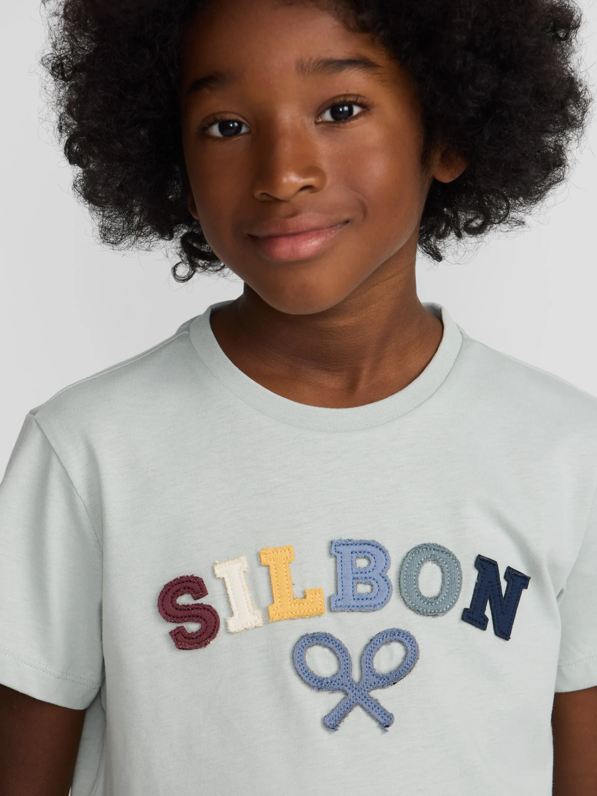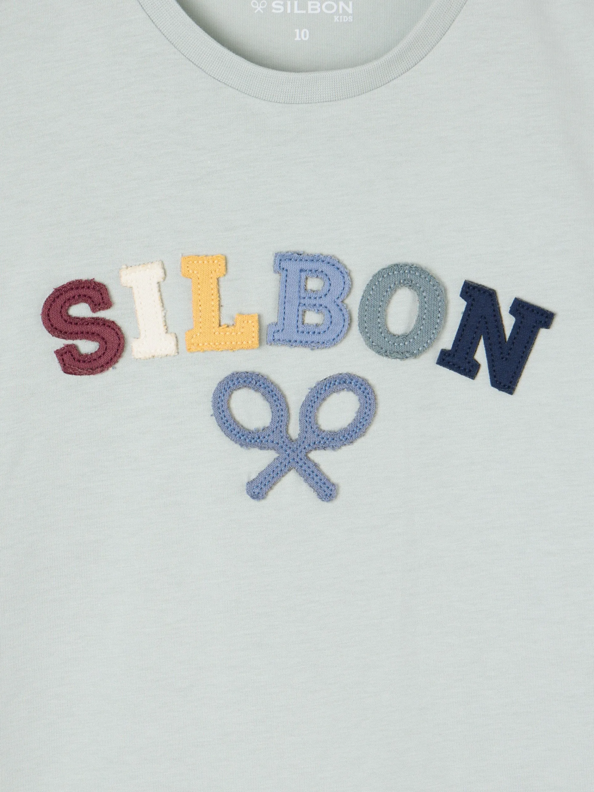 Camiseta verde de manga corta confeccionada en 100% algodón con corte Regular fit. Presenta cuello redondo. Cuenta con apliques de tejido sobrepuesto de letras en multicolor y raquetas en el torso. Fabricada en Portugal.