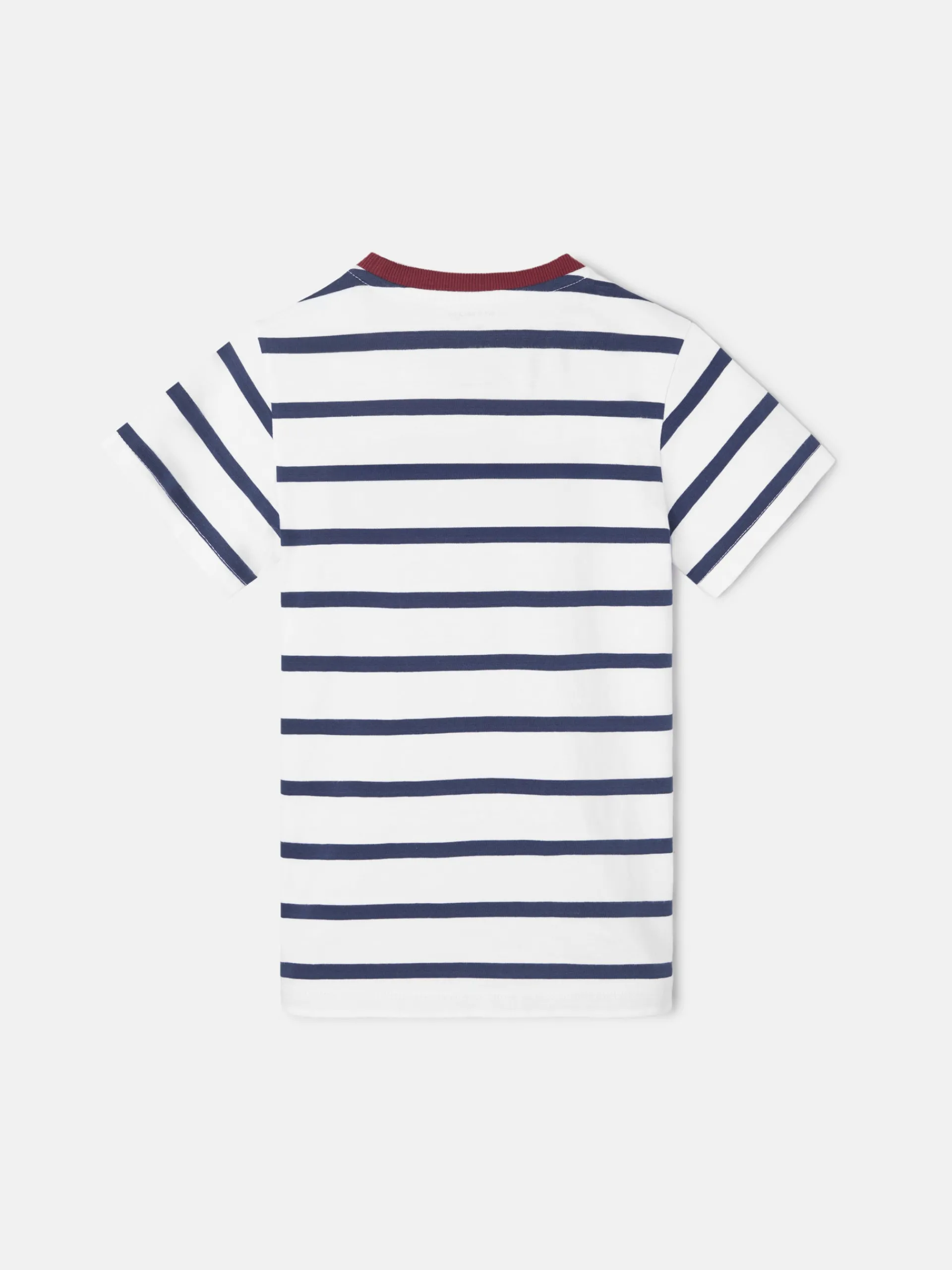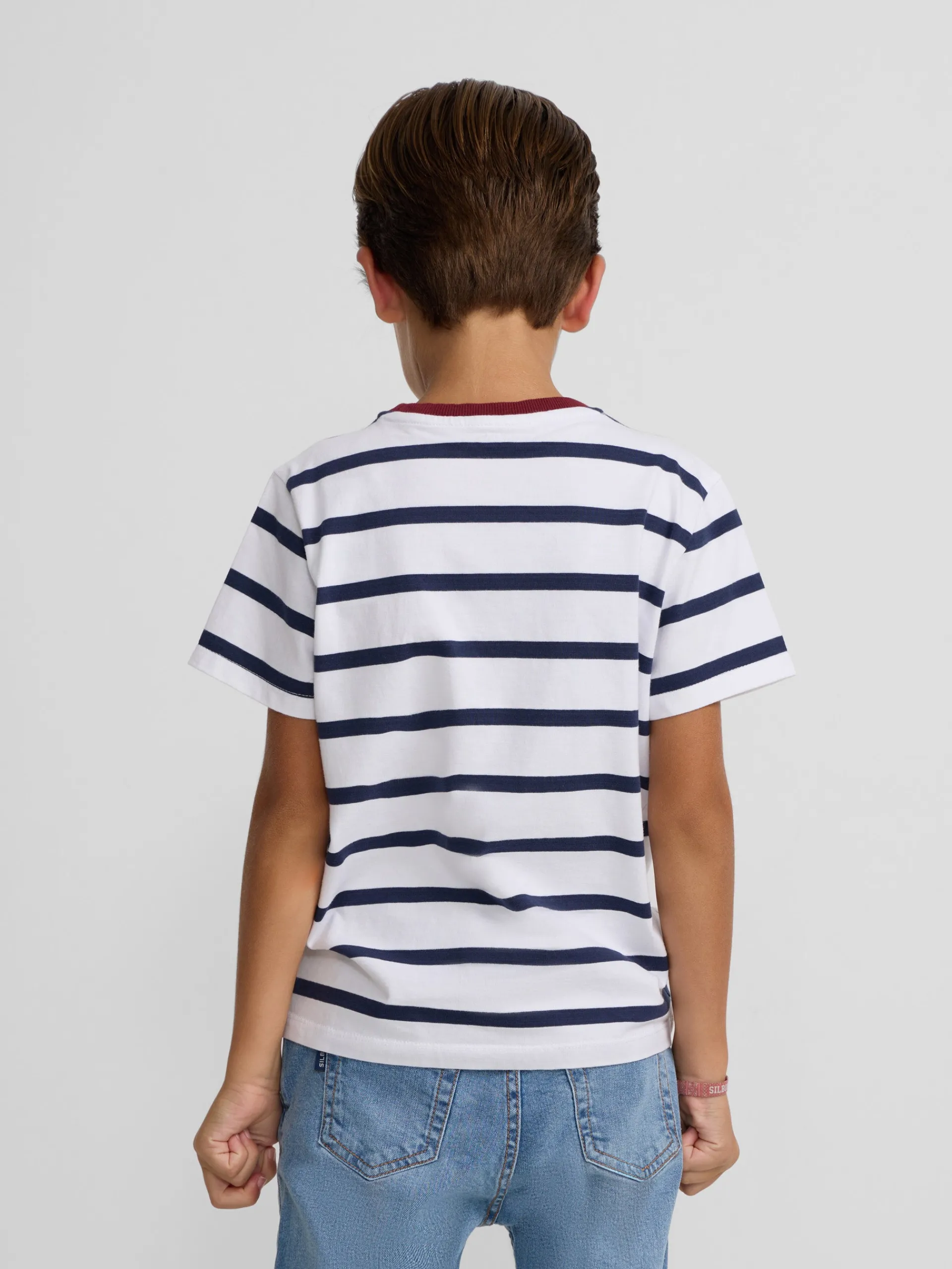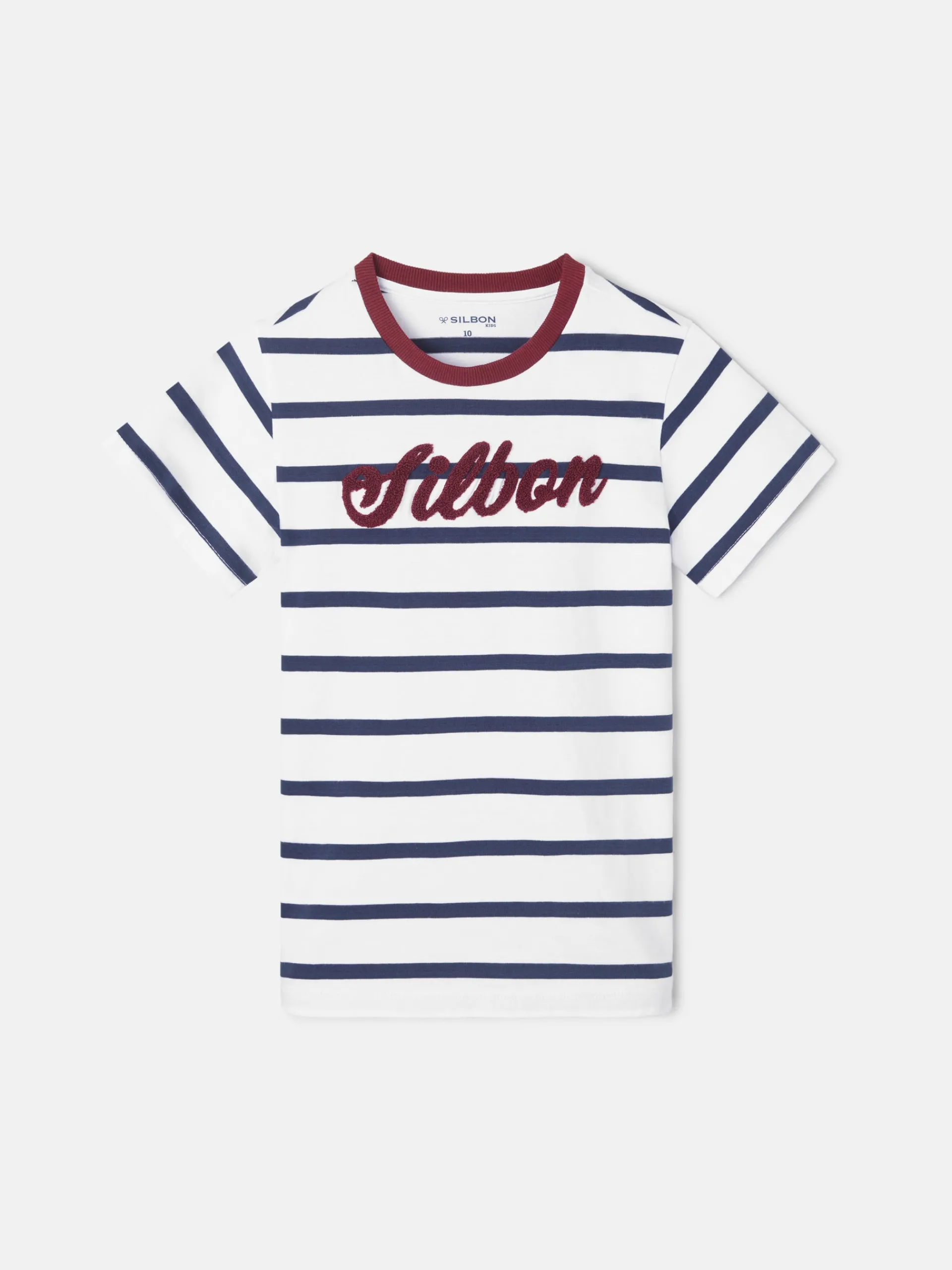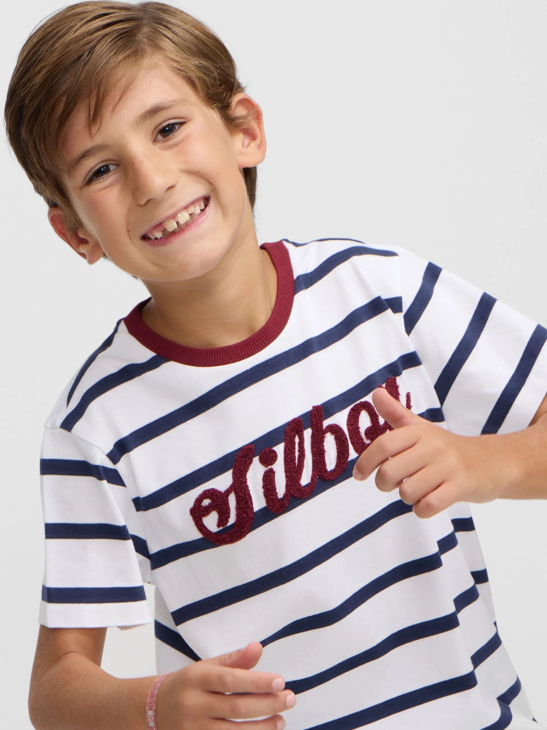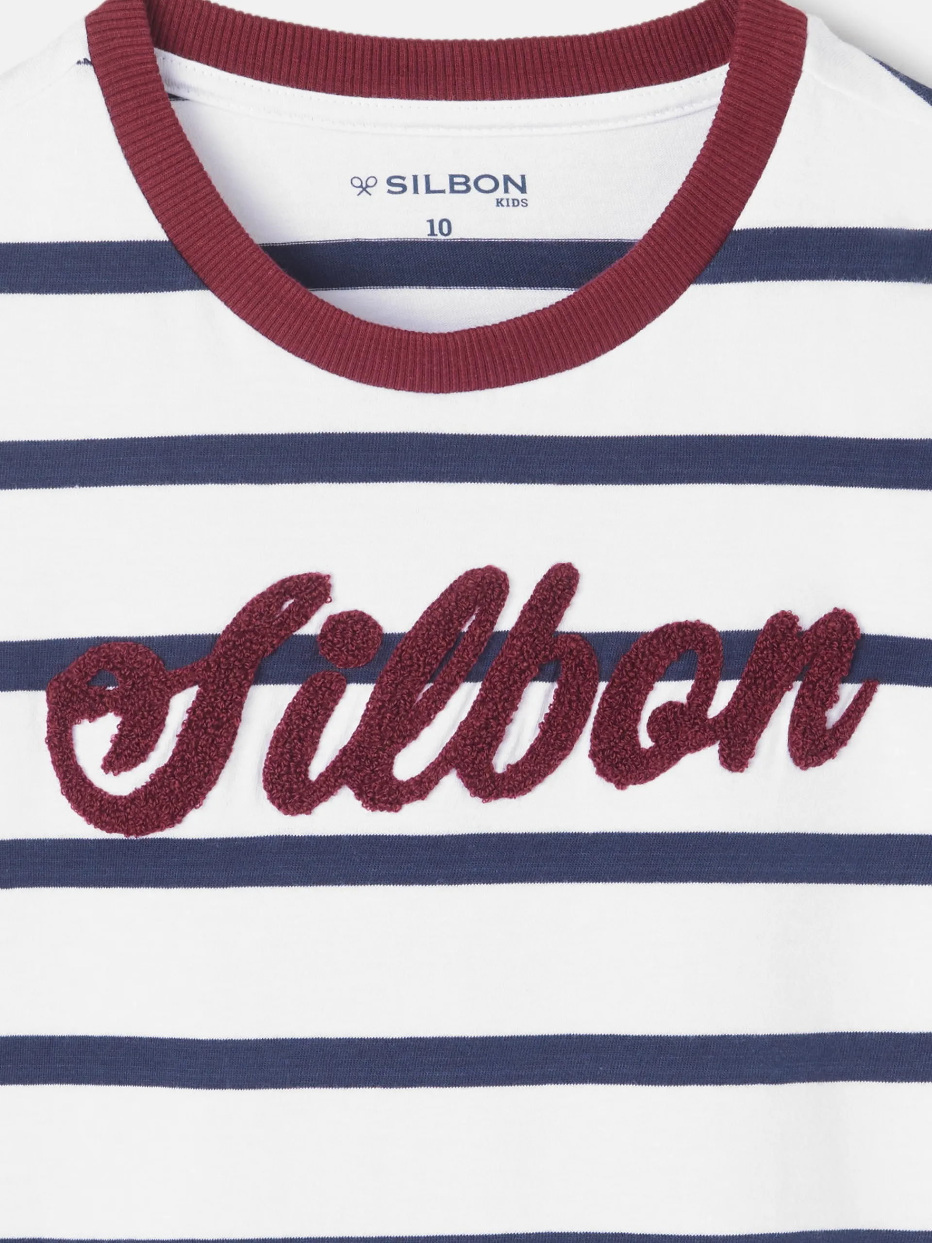 Camiseta kids de rayas marinas confeccionada en 100% algodón. Presenta cuello redondo en color burdeos y manga corta. Cuenta con bordado de Silbon en rizo de toalla en el torso. Fabricada en Portugal.