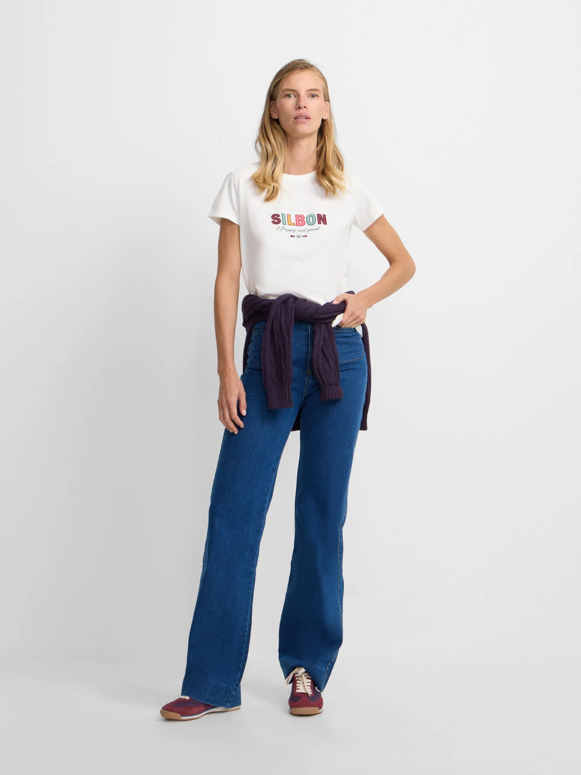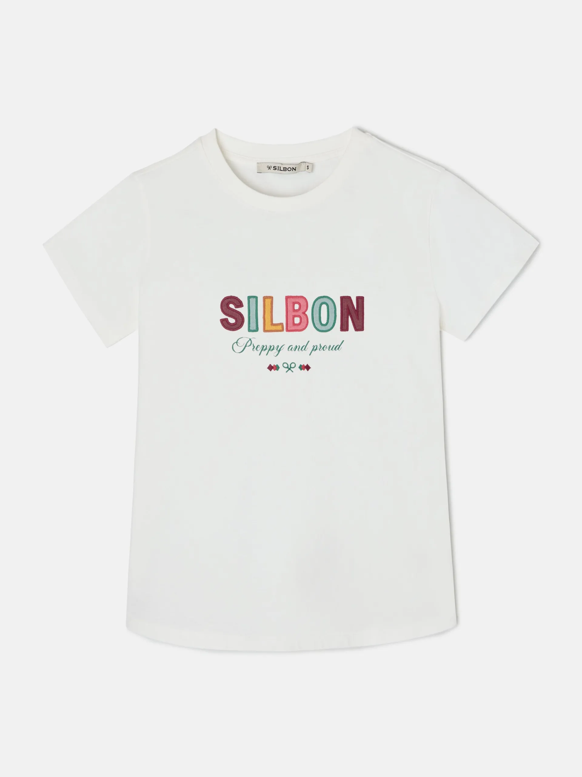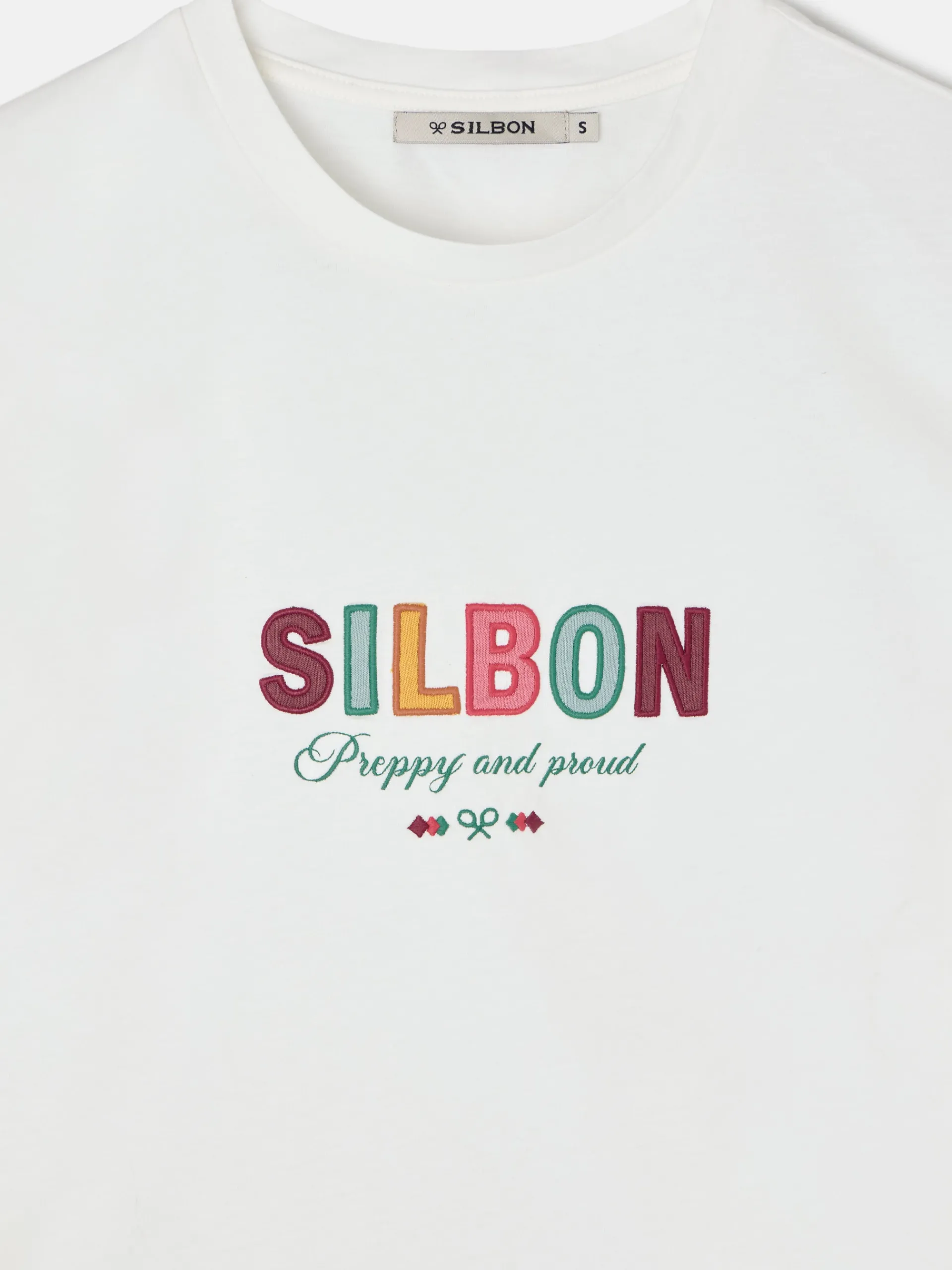 Camiseta woman blanca confeccionada en 100% algodón de corte regular fit. Presenta detalle de letras Silbon bordadas multicolor en el pecho. Cuenta con manga corta y cuello redondo.