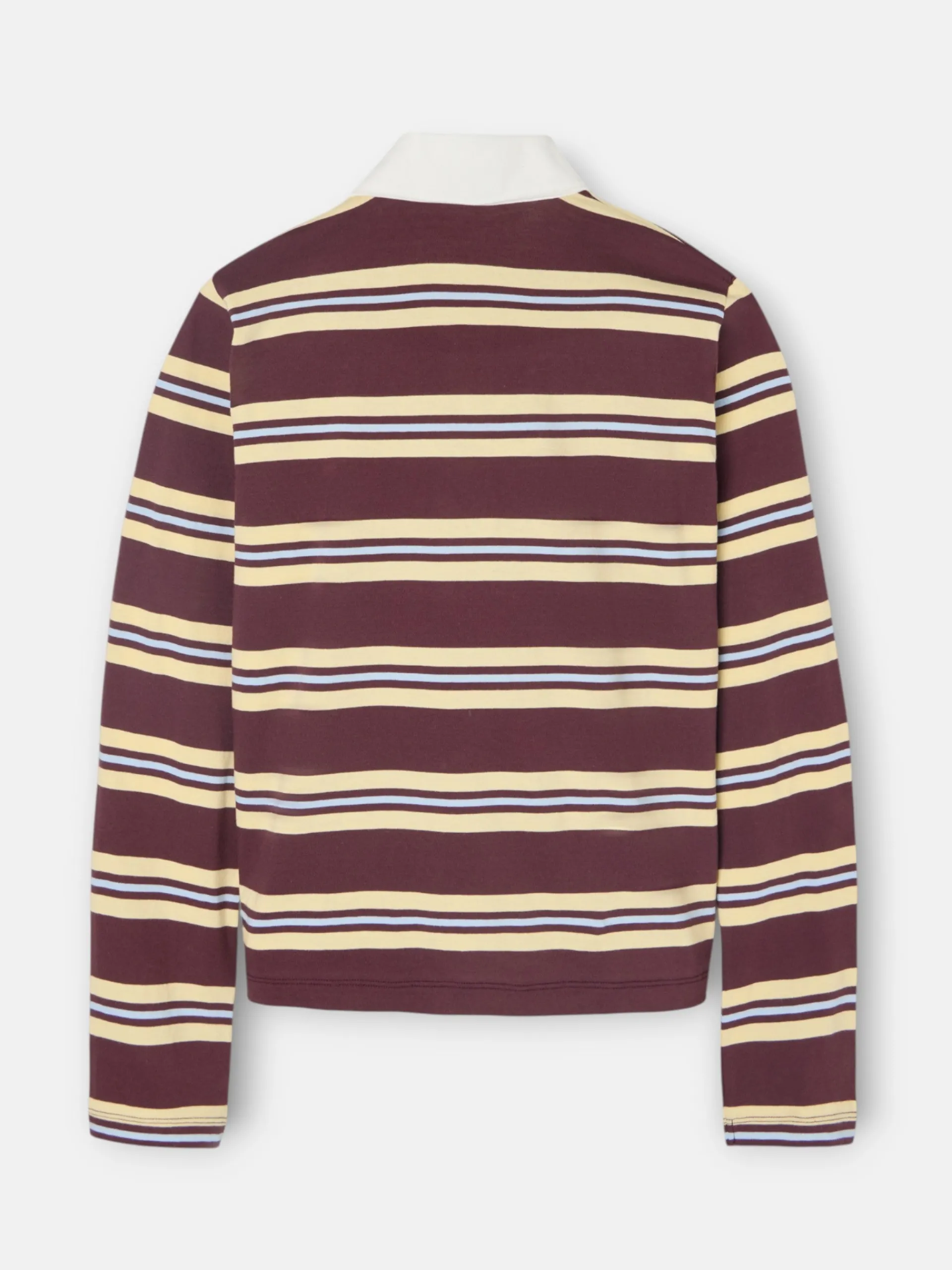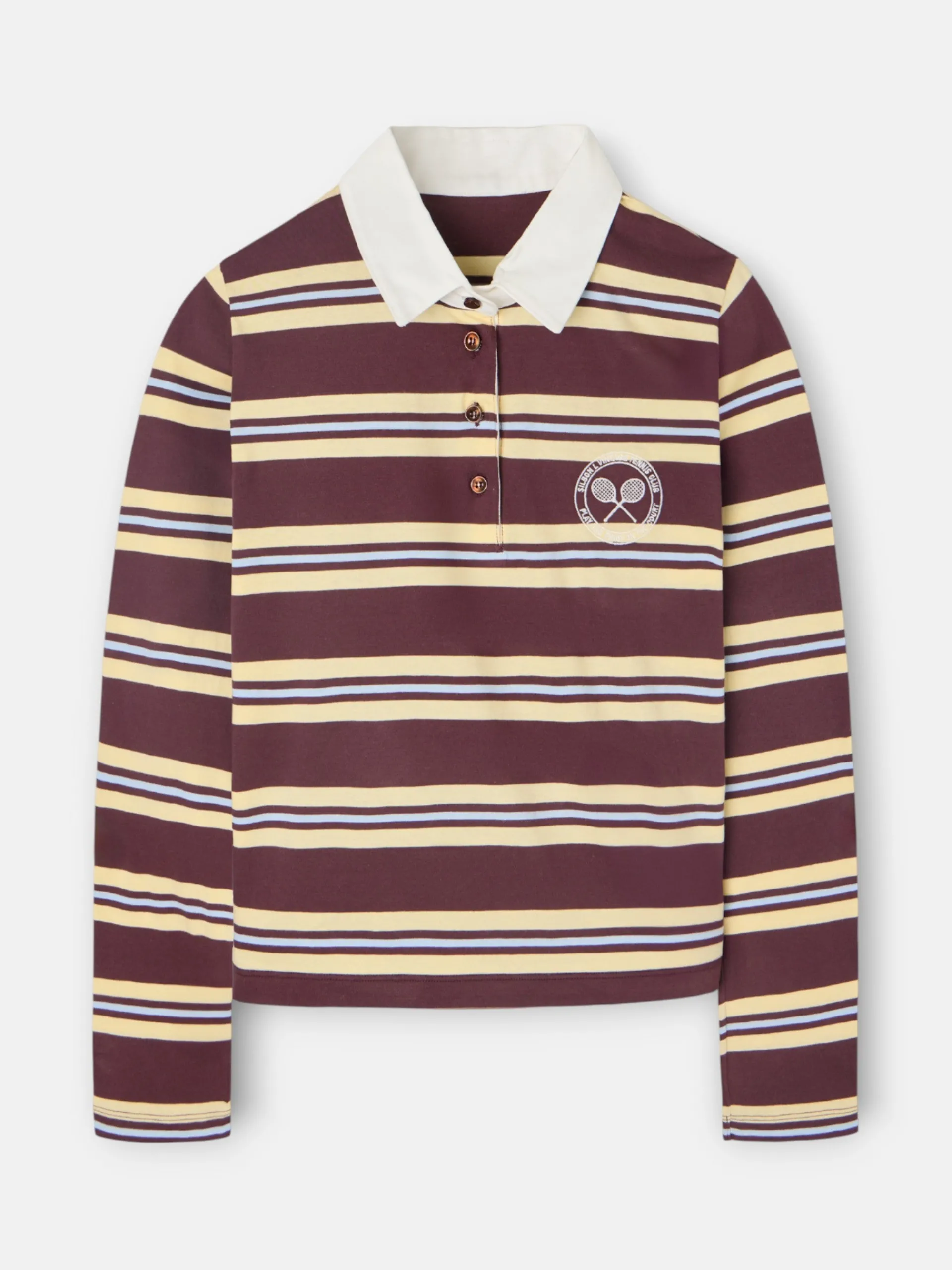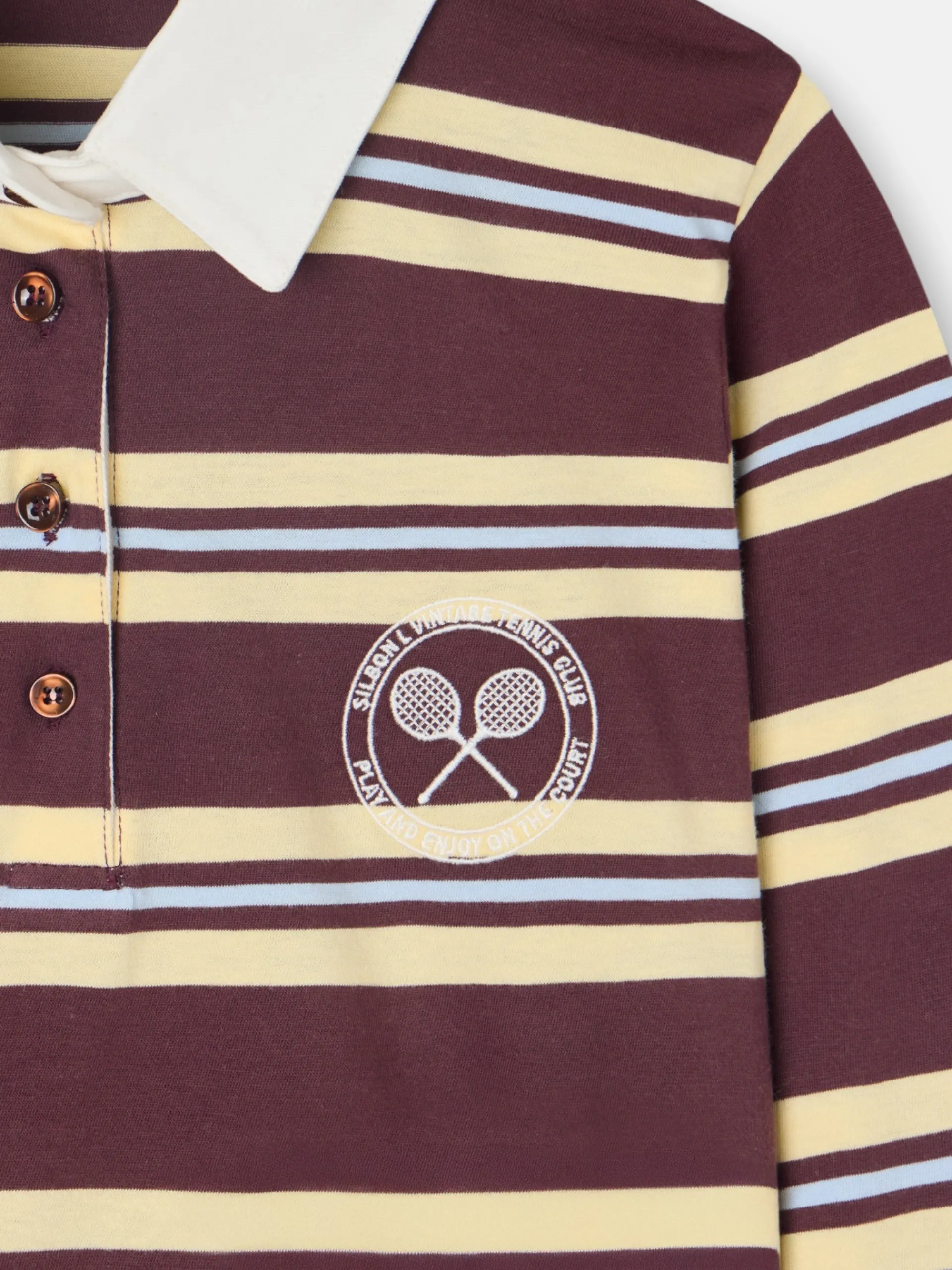 Polo woman de rayas burdeos y amarillo confeccionado en algodón100%. Presenta manga larga, cuello blanco clásico a contraste y bordado de escudo Silbon en el torso. Fabricado en Portugal.
