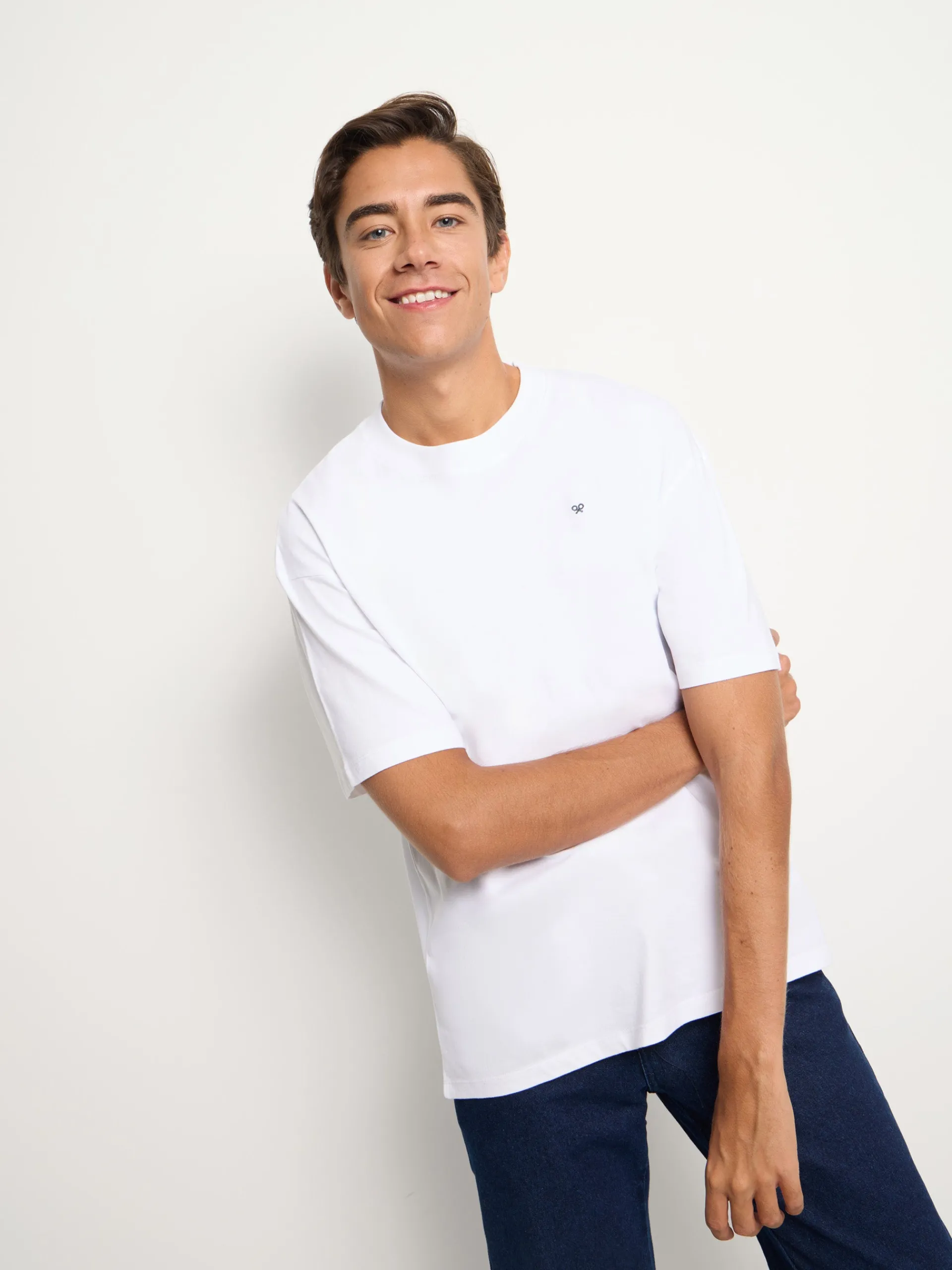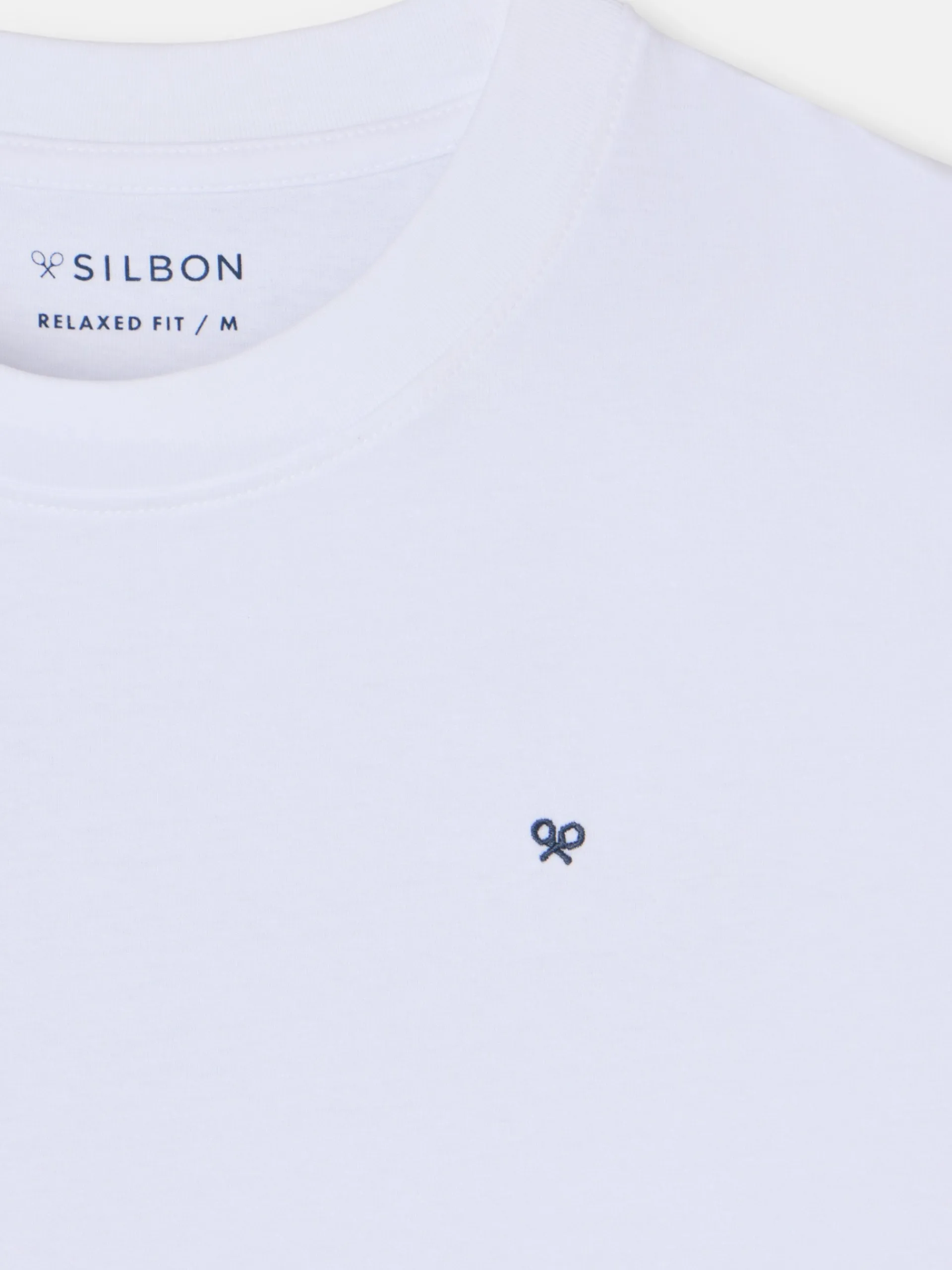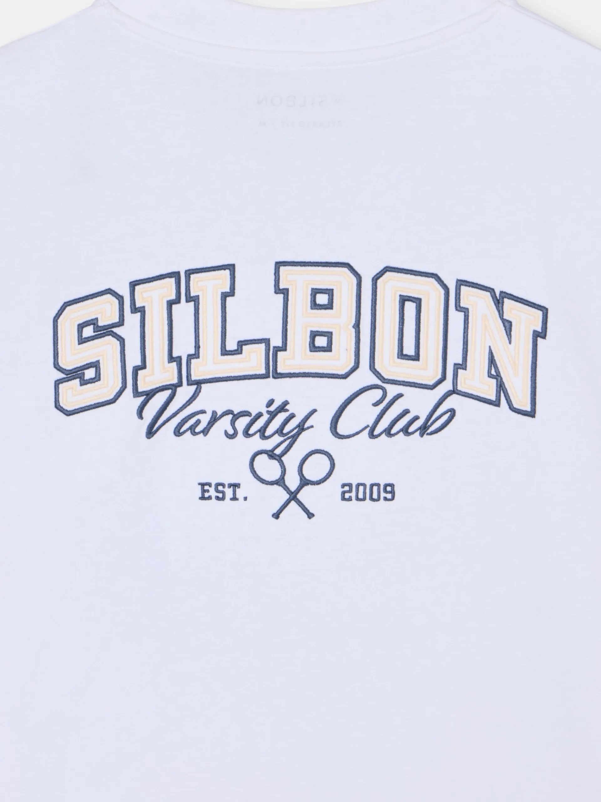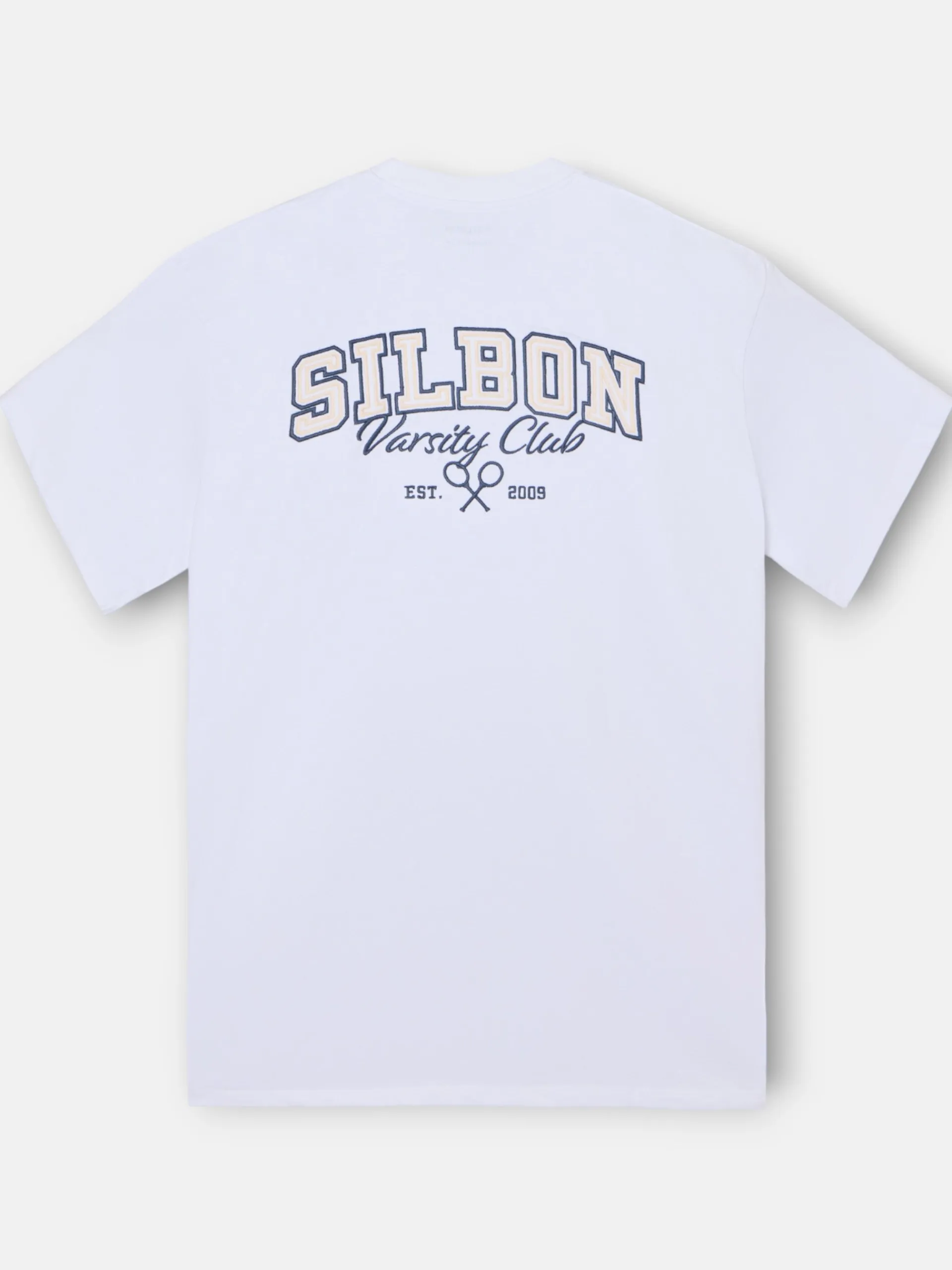 Camiseta College en color blanco de manga corta confeccionada en 100% algodón, con patrón Oversize. Presenta estampado print personalizado en la espalda y pequeño print de logo de raquetas Silbon en el torso.