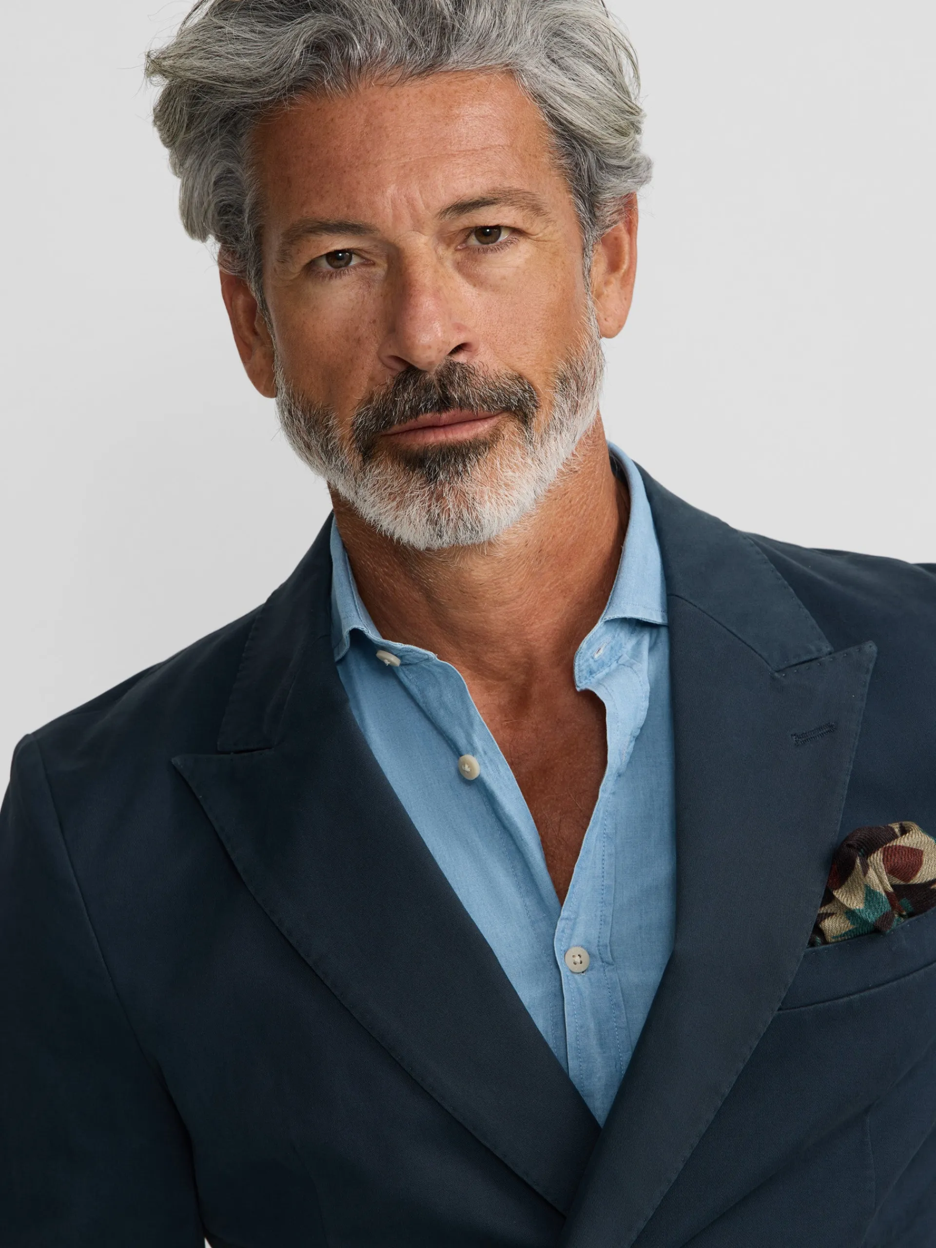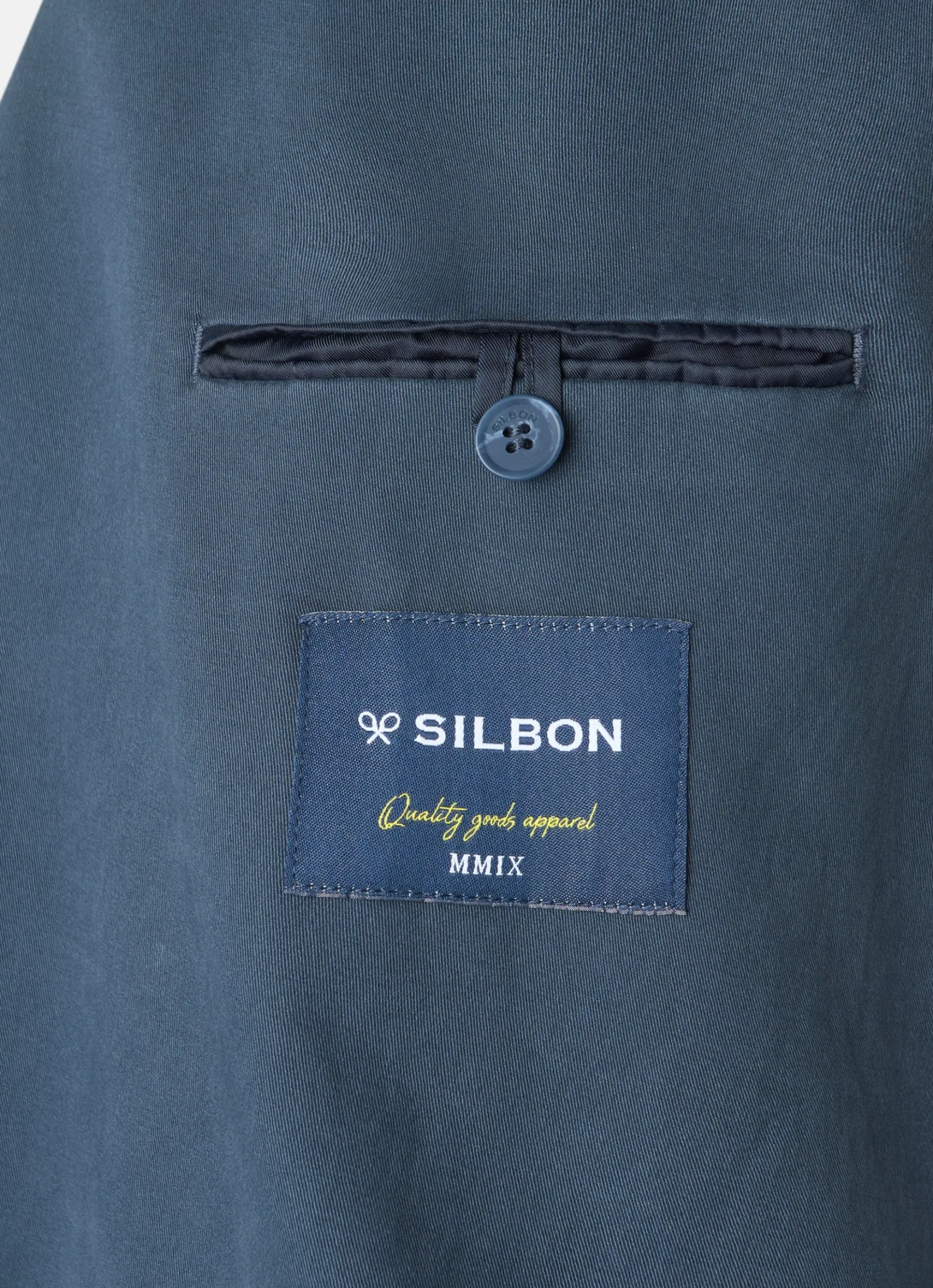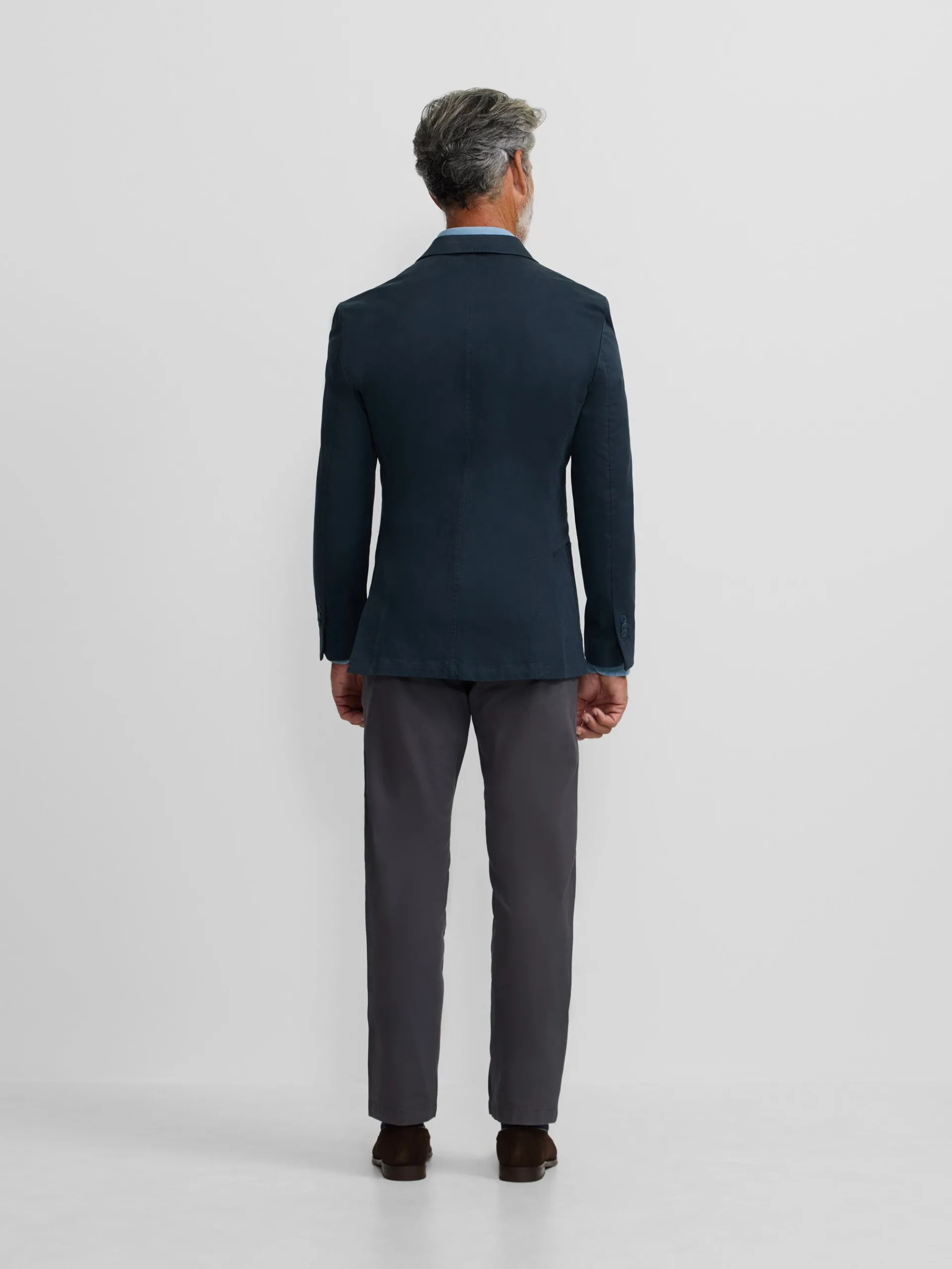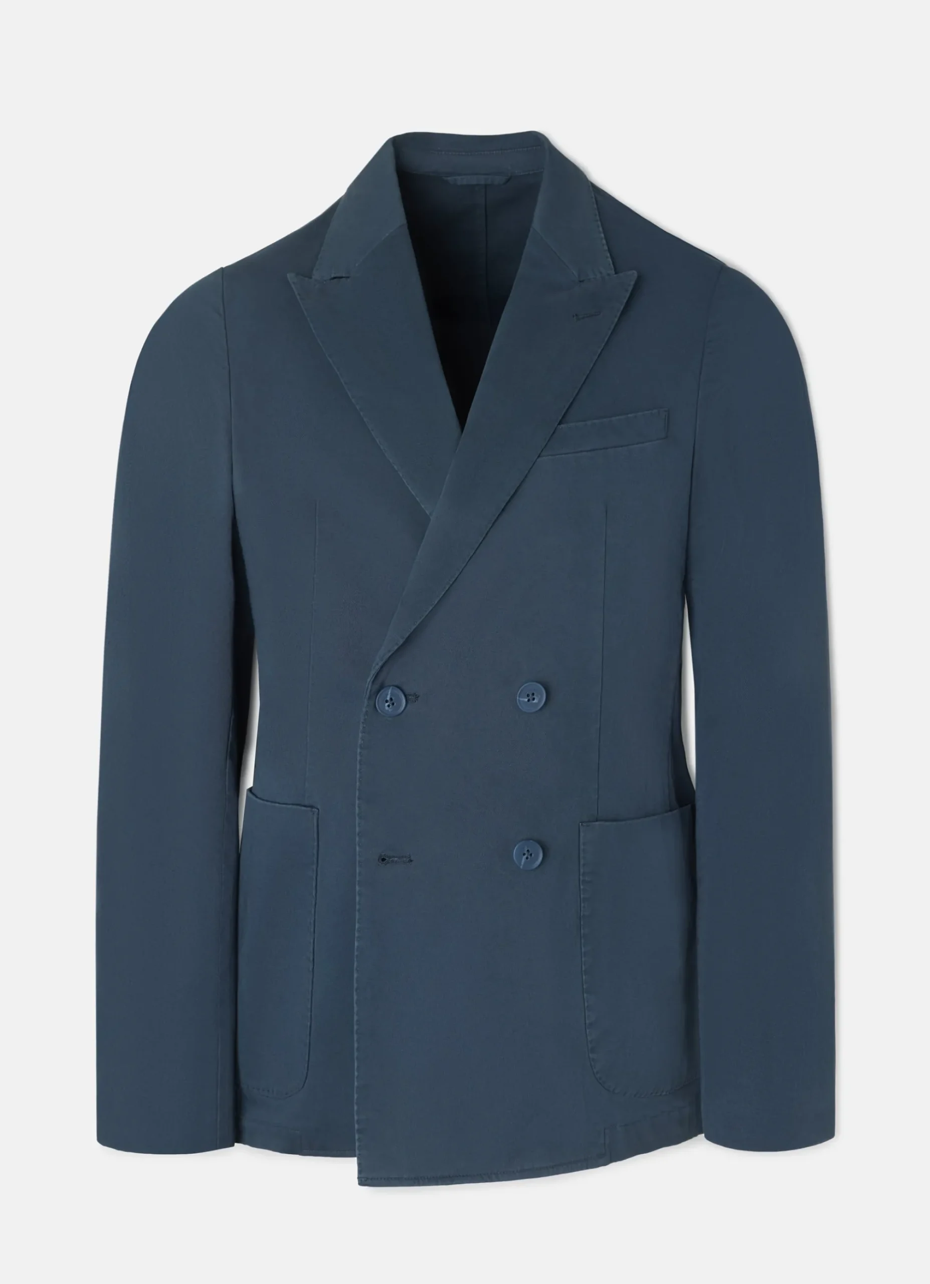 Americana casual cruzada azul confeccionada en mezcla de algodón. Presenta cierre cruzado con botones personalizados al tono, bolsillos delanteros tipo parche y bolsillo insertado en torso y mangas acabadas con ojales y botones realizables. Cuenta con cuello con solapas de punta de lanza. No contiene hombreras y no tiene forro interior.