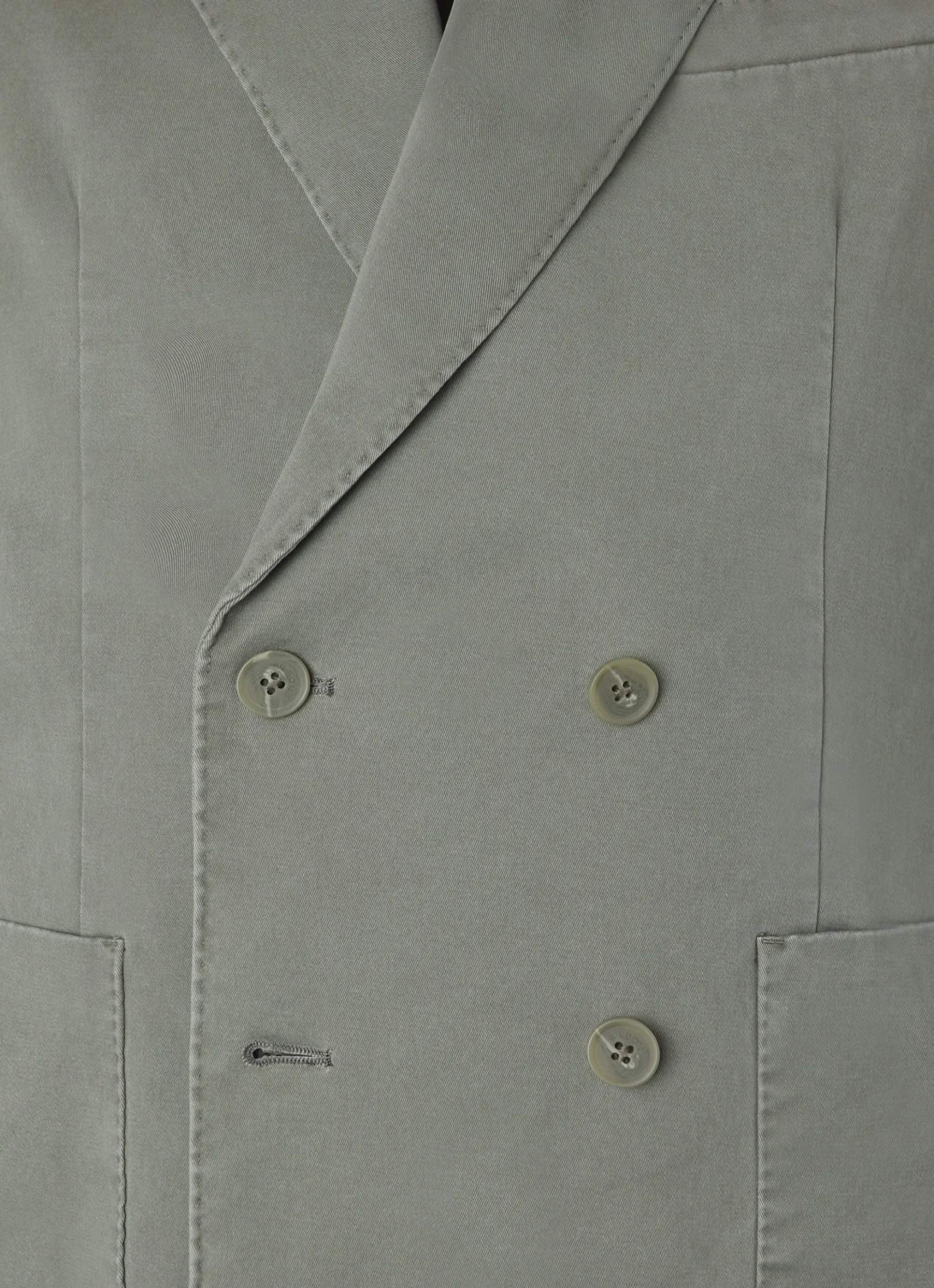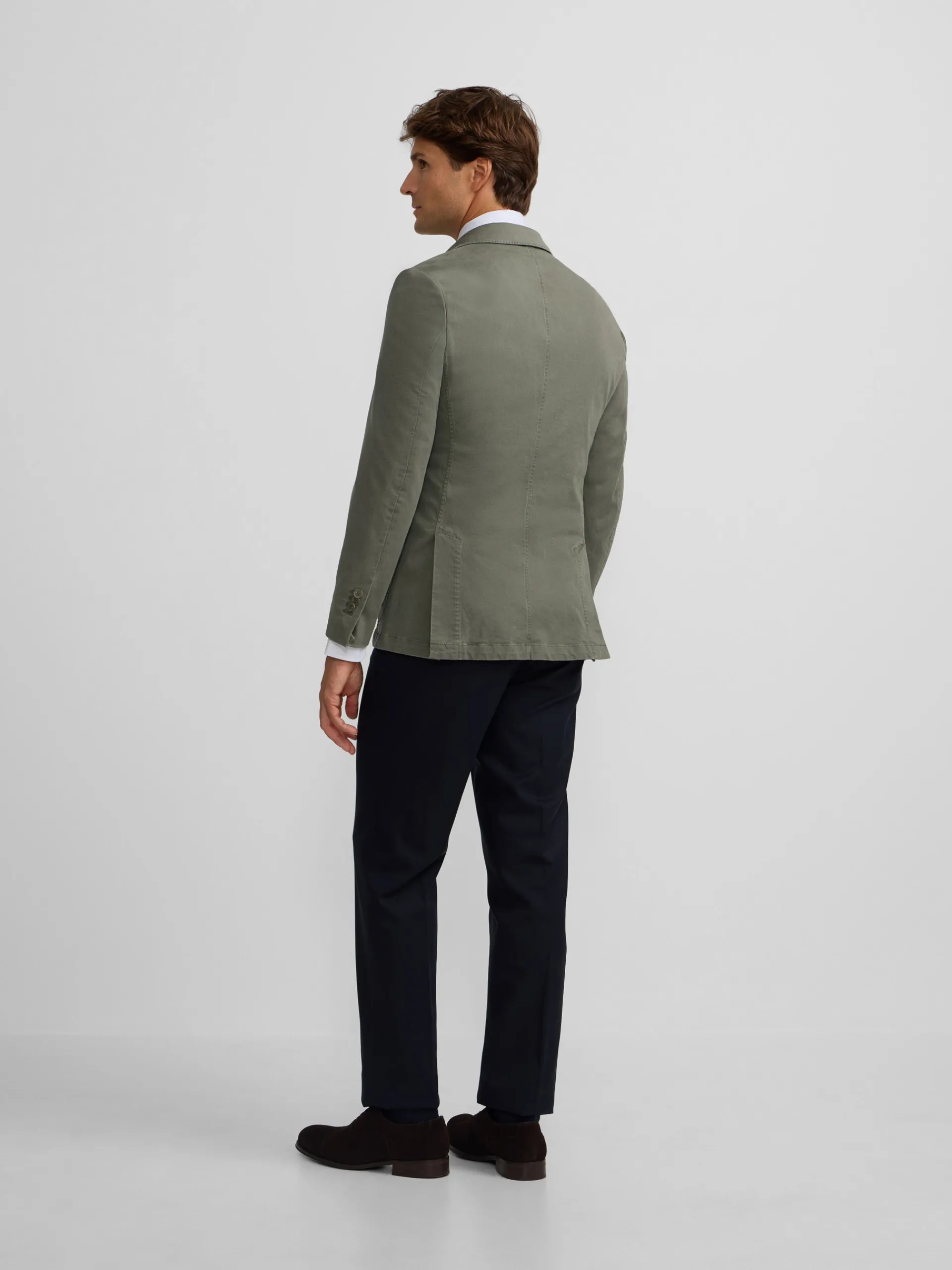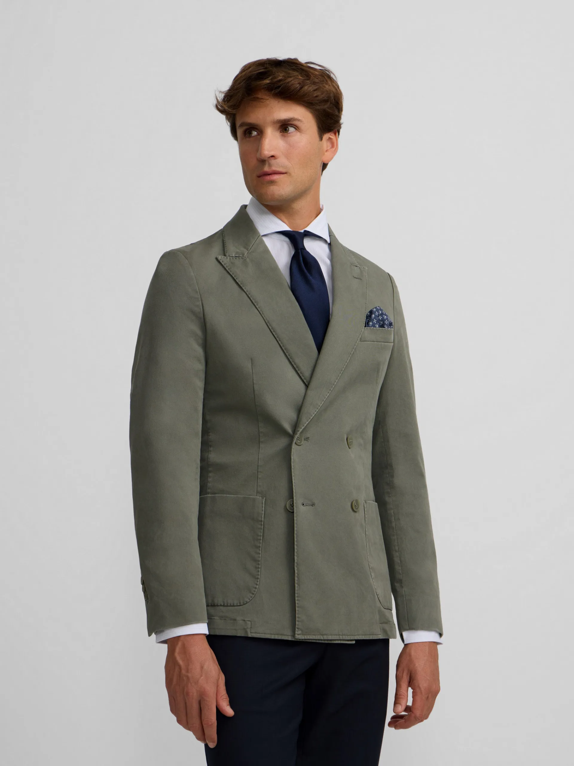 Americana casual cruzada verde confeccionada en mezcla de algodón. Presenta cierre cruzado con botones personalizados al tono, bolsillos delanteros tipo parche y bolsillo insertado en torso y mangas acabadas con ojales y botones realizables. Cuenta con cuello con solapas de punta de lanza. No contiene hombreras y no tiene forro interior.