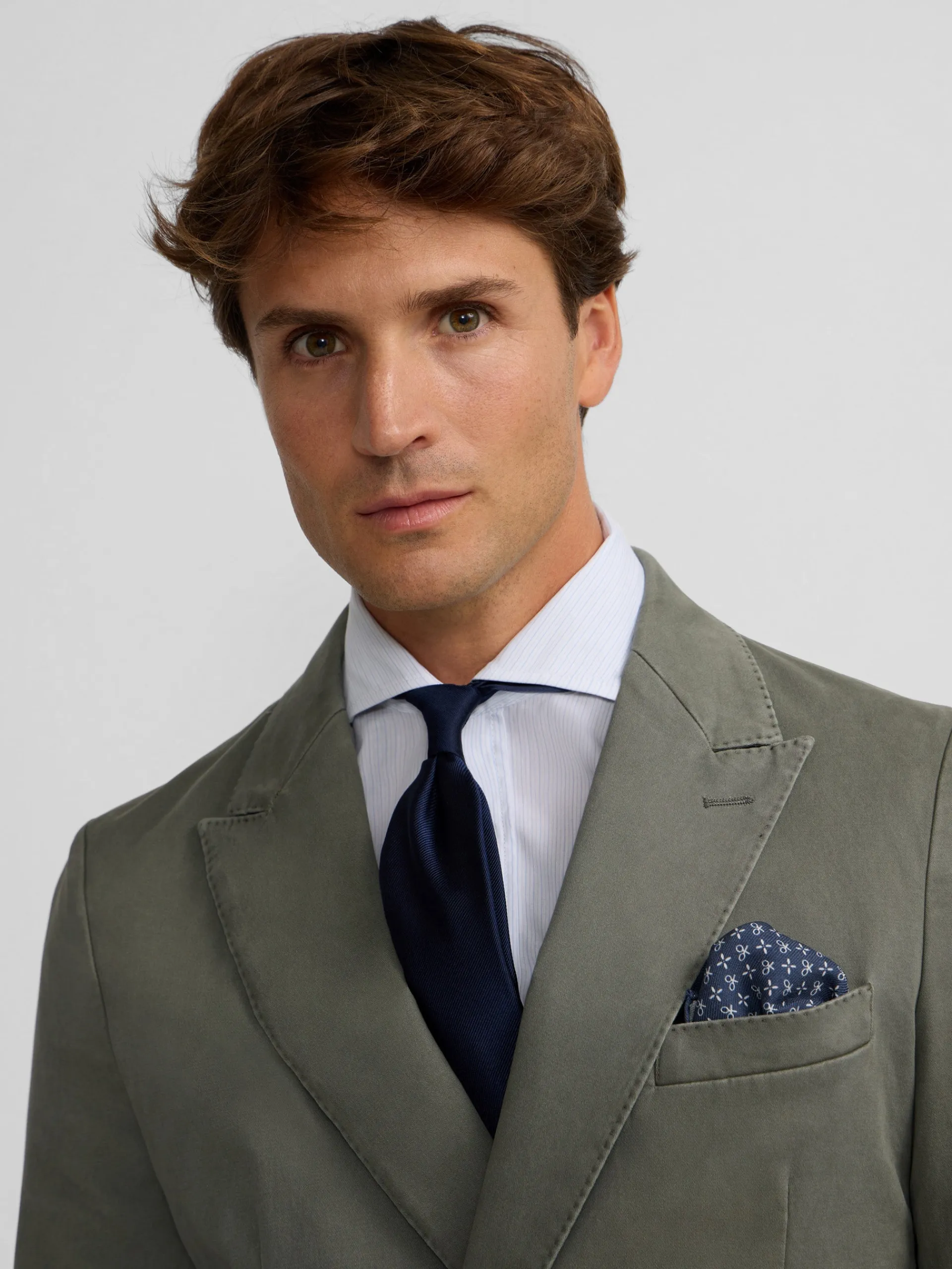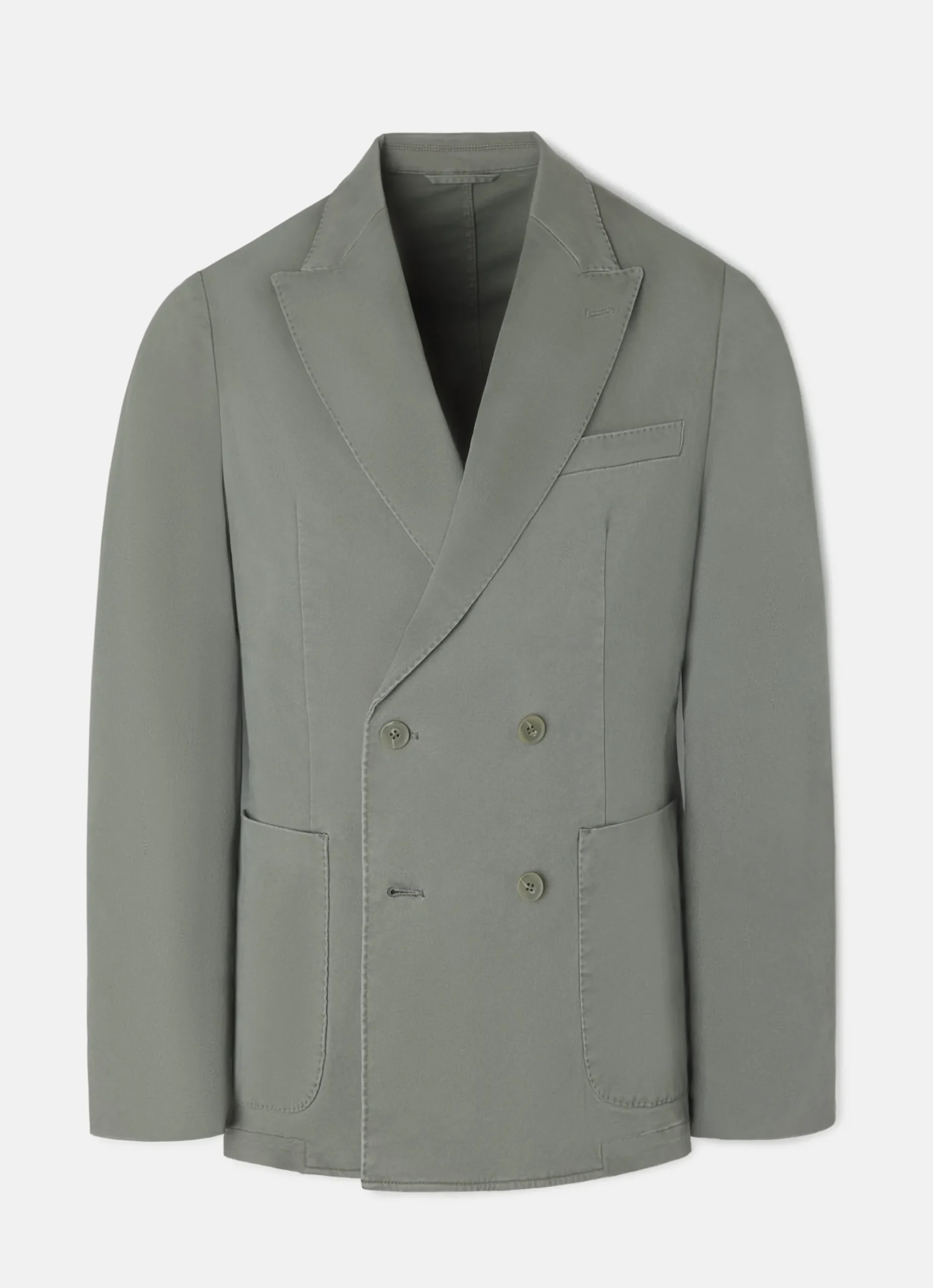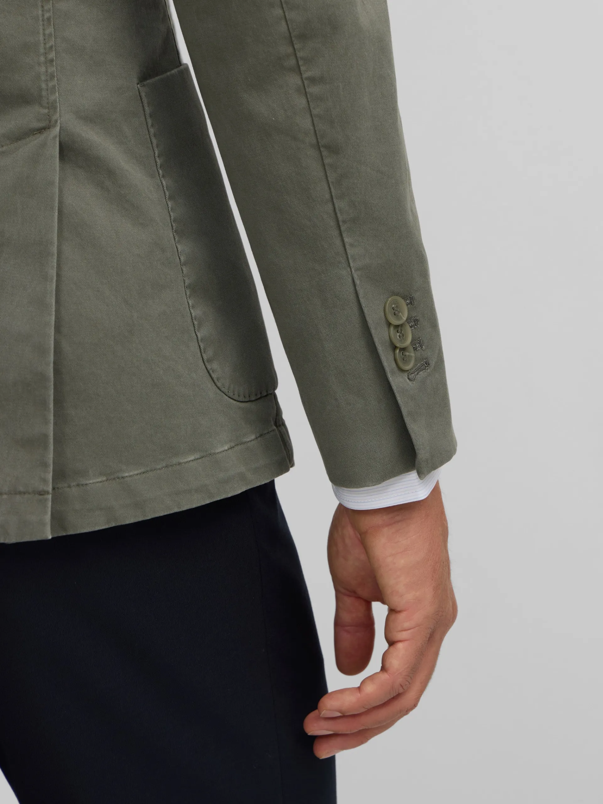 Americana casual cruzada verde confeccionada en mezcla de algodón. Presenta cierre cruzado con botones personalizados al tono, bolsillos delanteros tipo parche y bolsillo insertado en torso y mangas acabadas con ojales y botones realizables. Cuenta con cuello con solapas de punta de lanza. No contiene hombreras y no tiene forro interior.