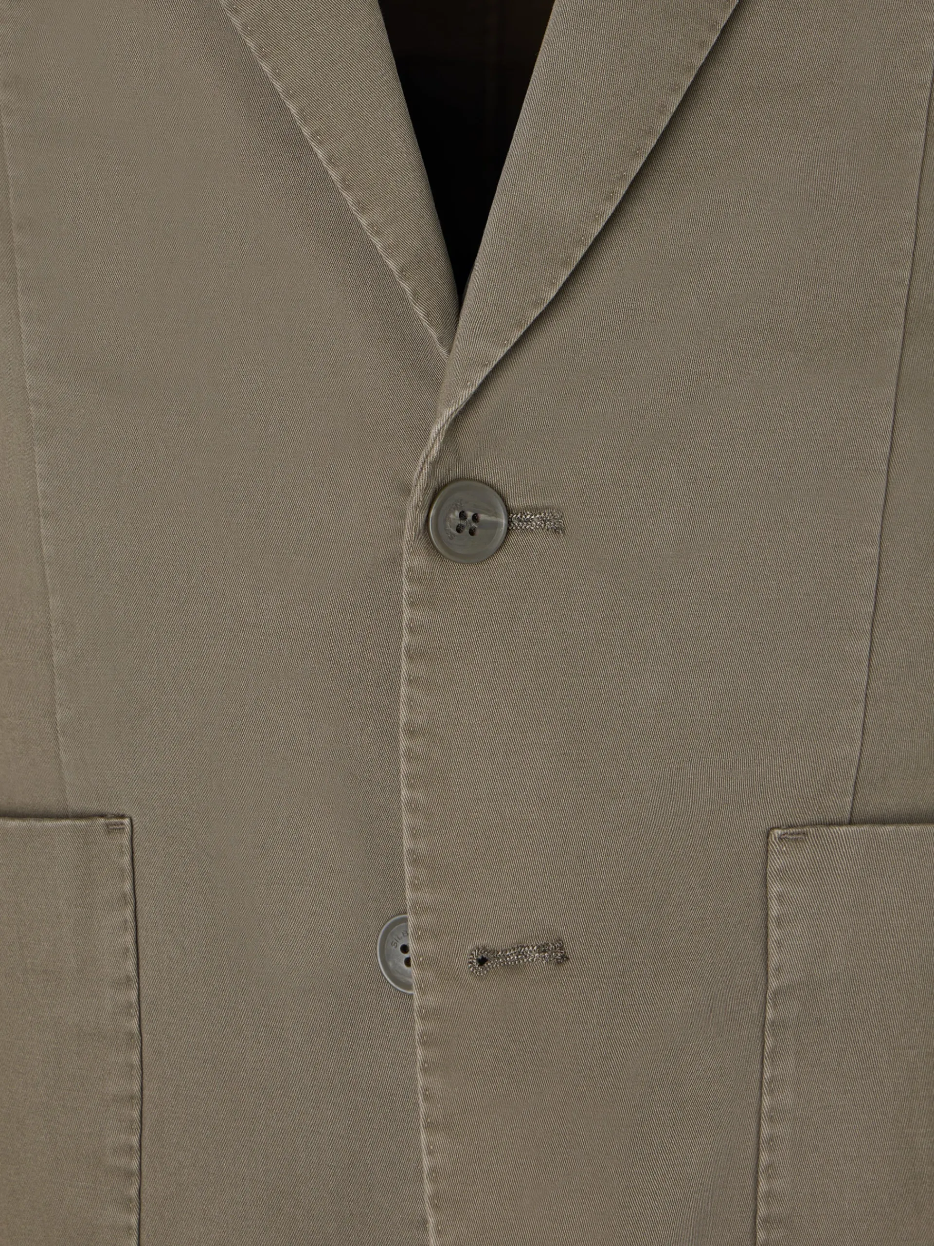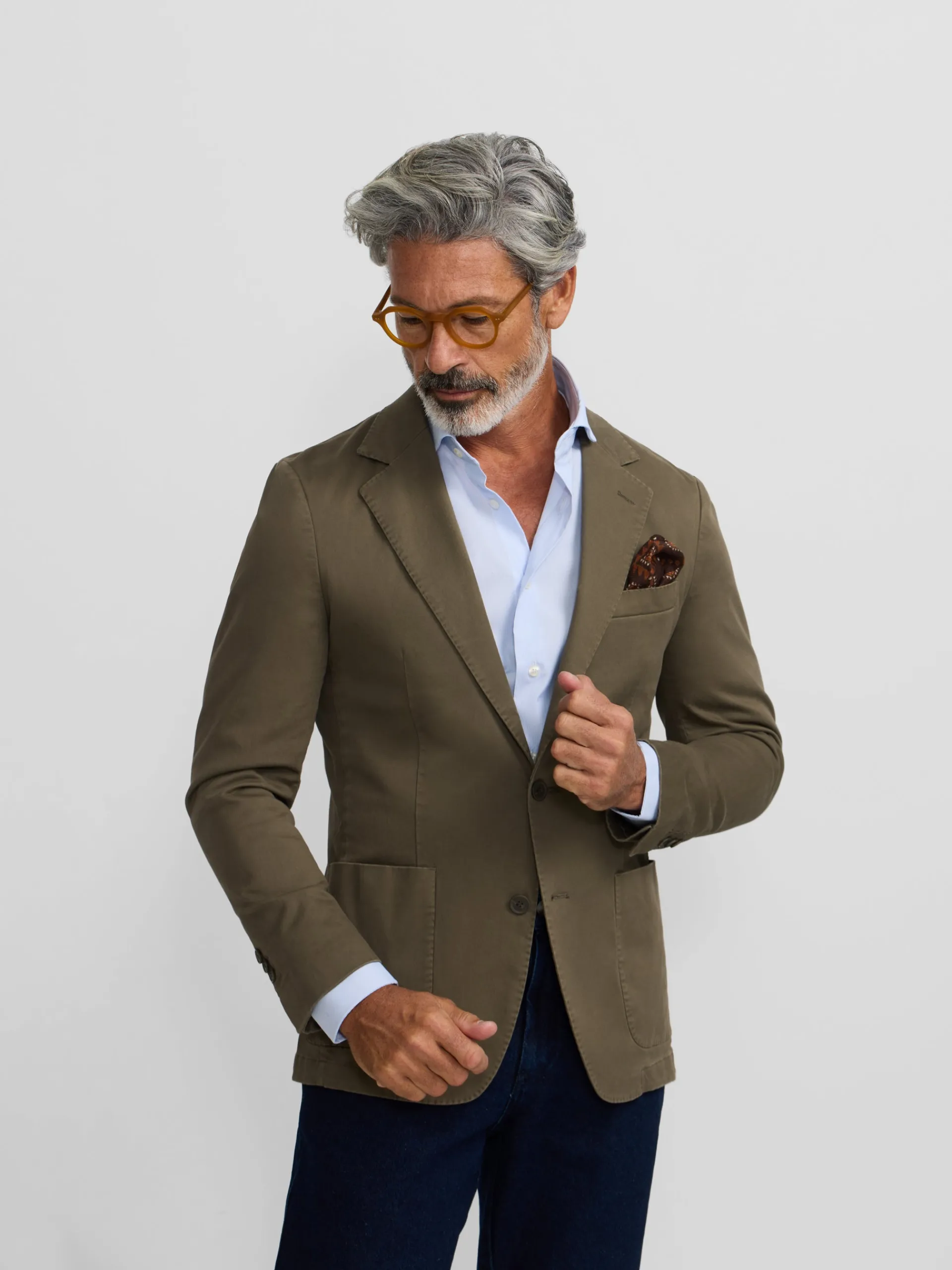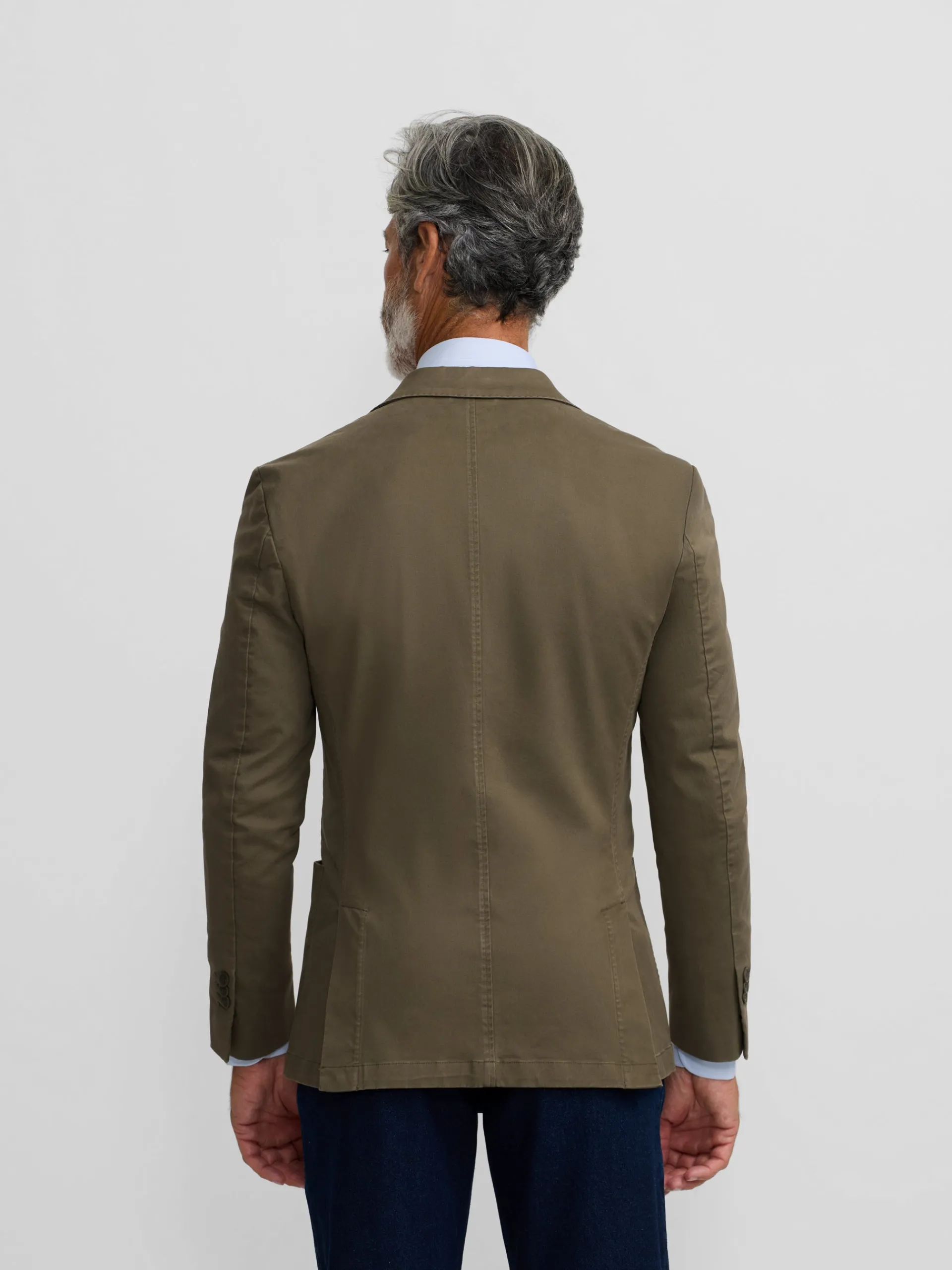 Americana casual khaki confeccionada en mezcla de algodón de corte Tailored fit. Presenta cierre recto con botones personalizados, bolsillos delanteros tipo parche, bolsillo insertado en torso. Cuenta con cuello con solapas de muesca. No contiene hombreras y no tiene forro interior.