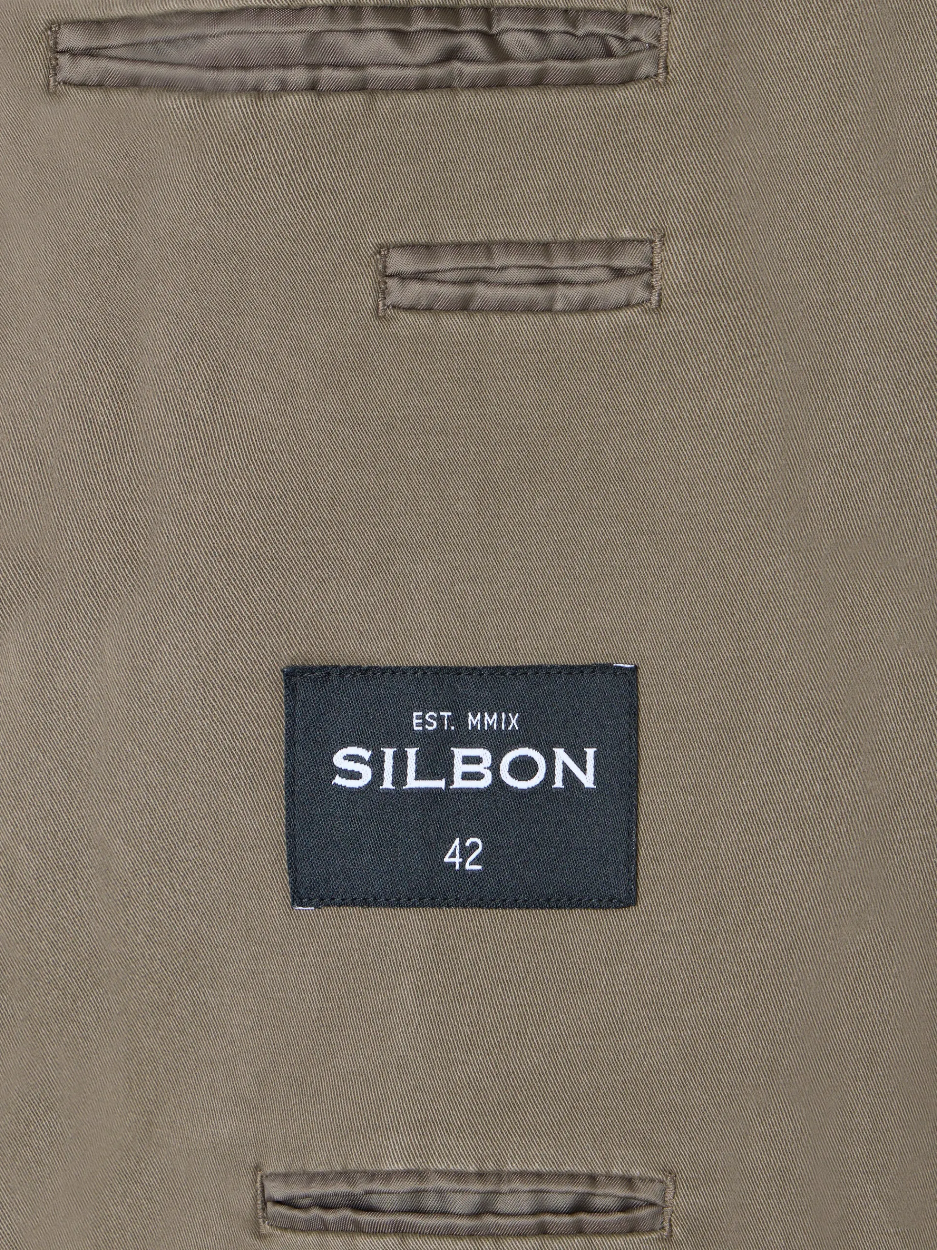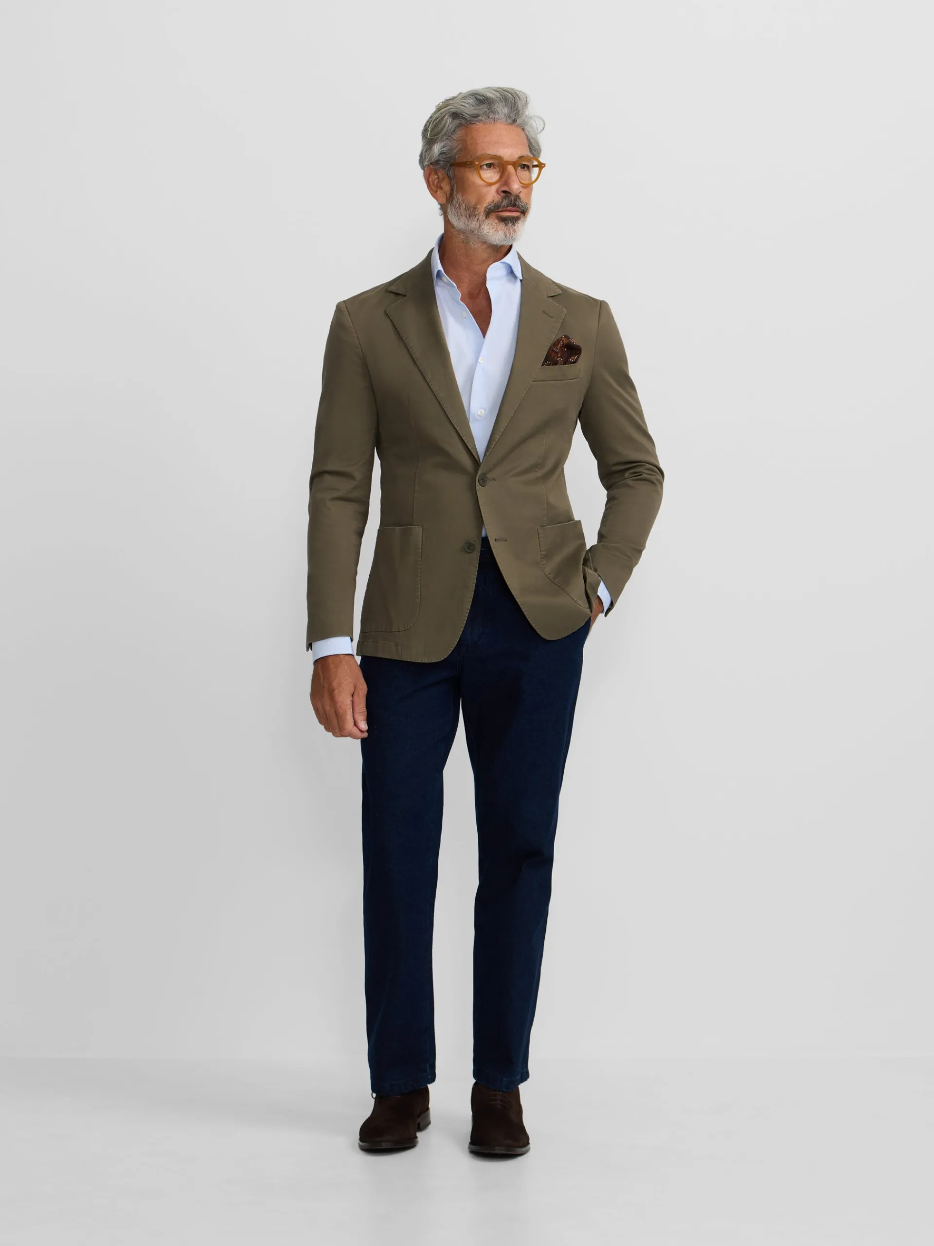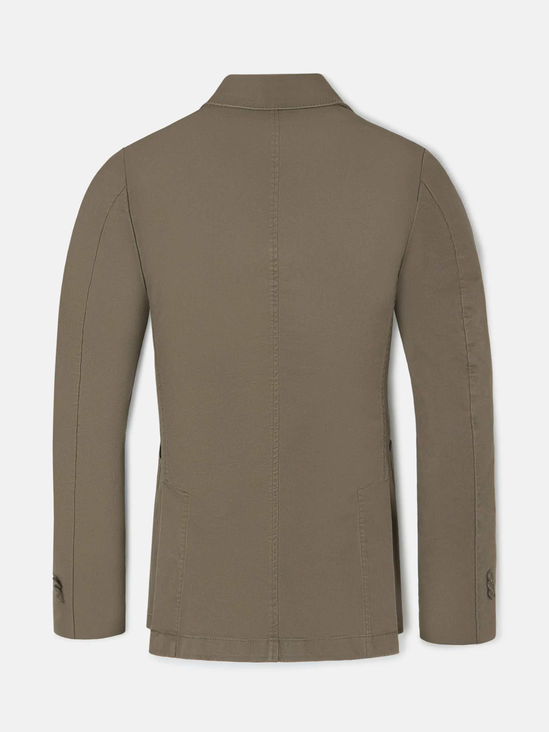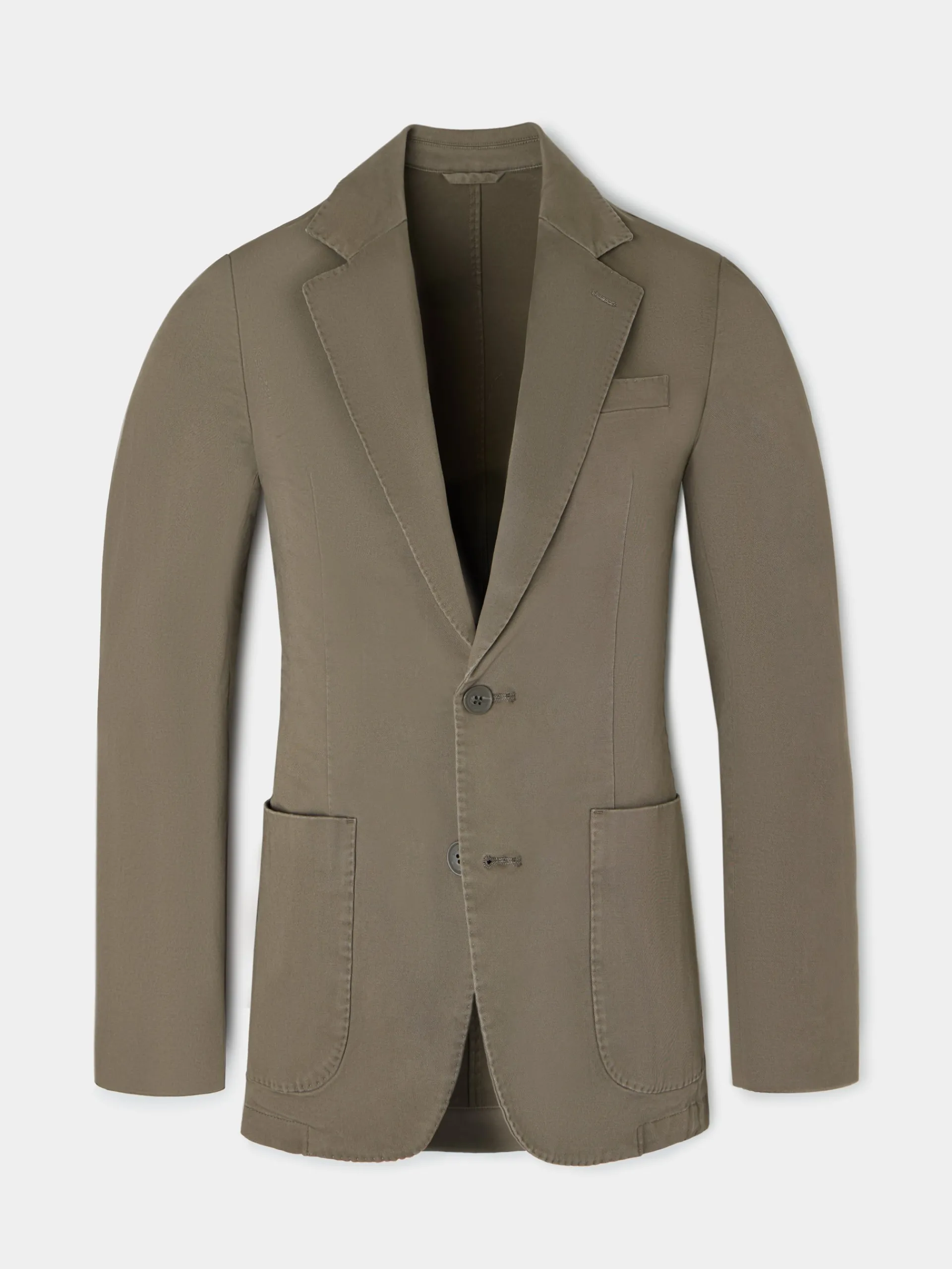 Americana casual khaki confeccionada en mezcla de algodón de corte Tailored fit. Presenta cierre recto con botones personalizados, bolsillos delanteros tipo parche, bolsillo insertado en torso. Cuenta con cuello con solapas de muesca. No contiene hombreras y no tiene forro interior.