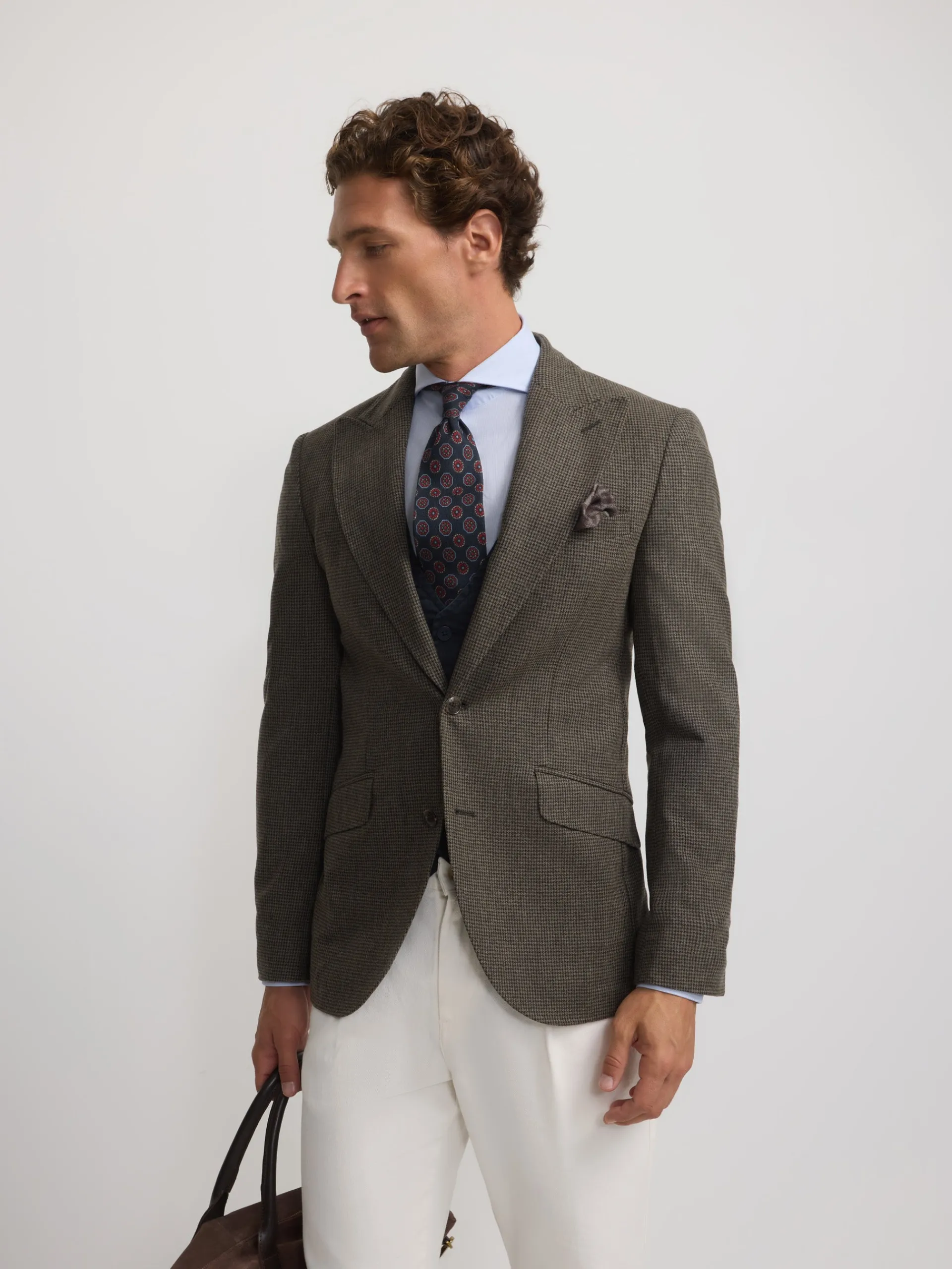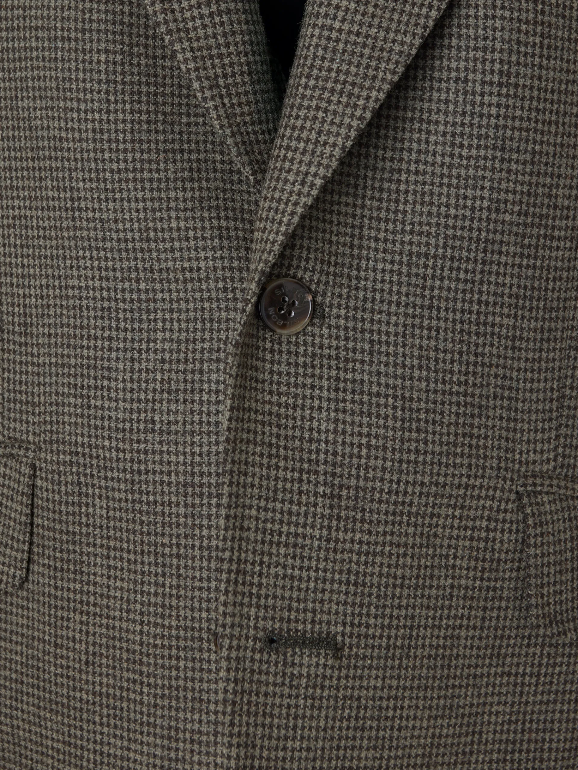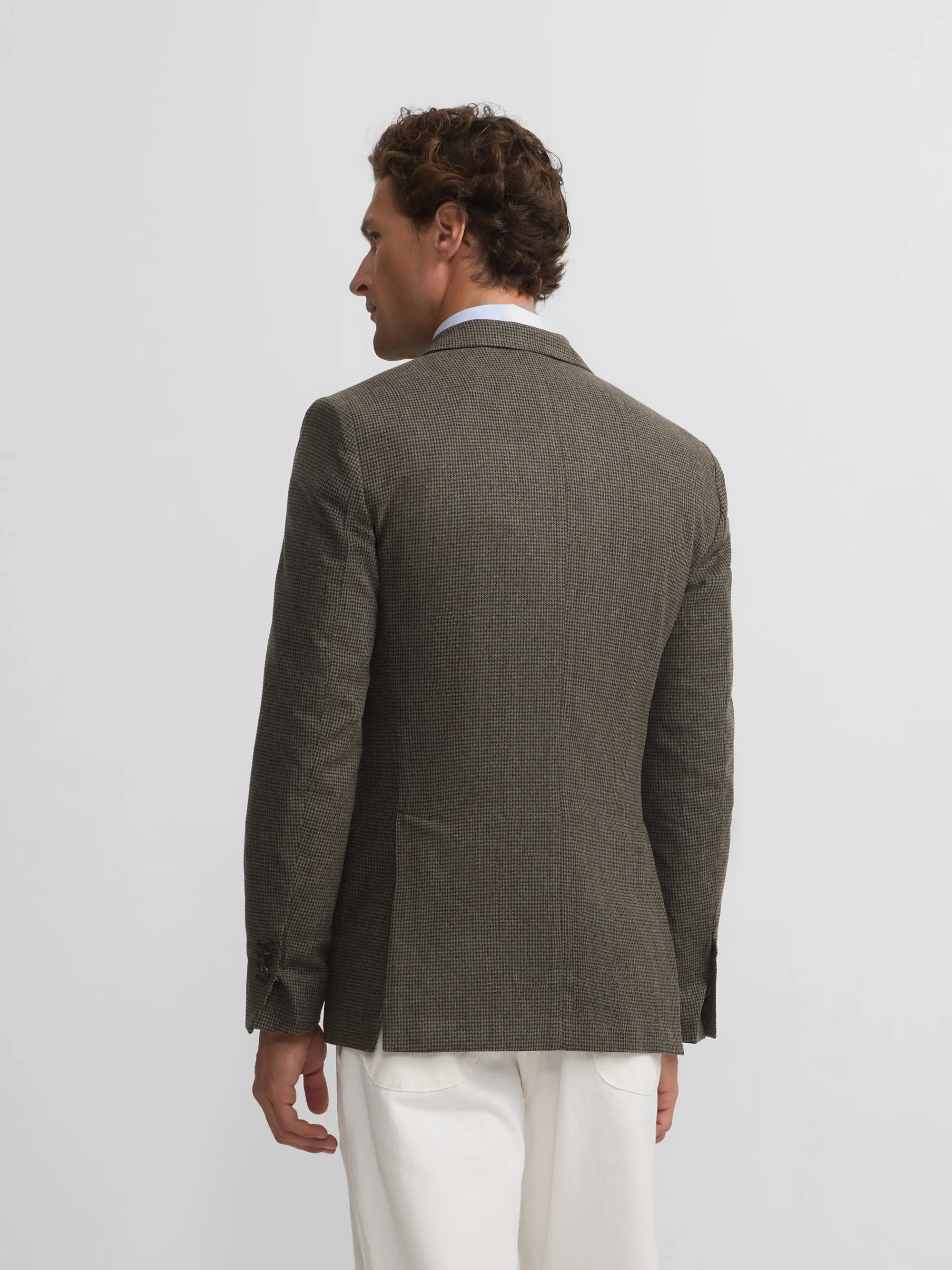 Americana pata de gallo verde confeccionada en 100% lana de corte Tailored Fit. Presenta cierre recto con bolsillos de solapa delanteros y mangas acabadas con ojales y botones realizables. Cuenta con cuello con solapas de muesca. El tejido destaca por su textura y estructura firme, lo que proporciona un ajuste elegante y confortable. Ideal para ocasiones formales o para elevar looks más casuales con un toque sofisticado. Fabricado en Portugal.