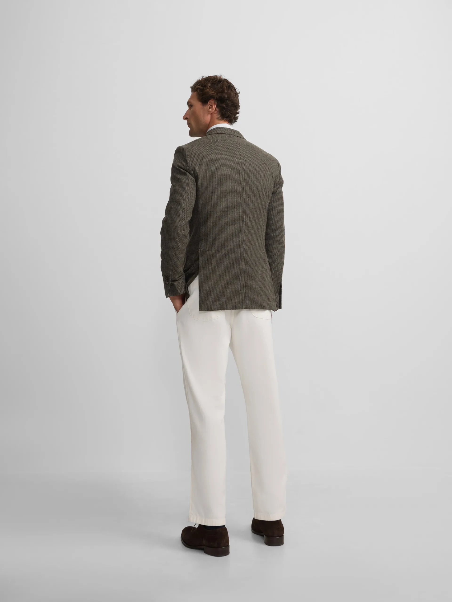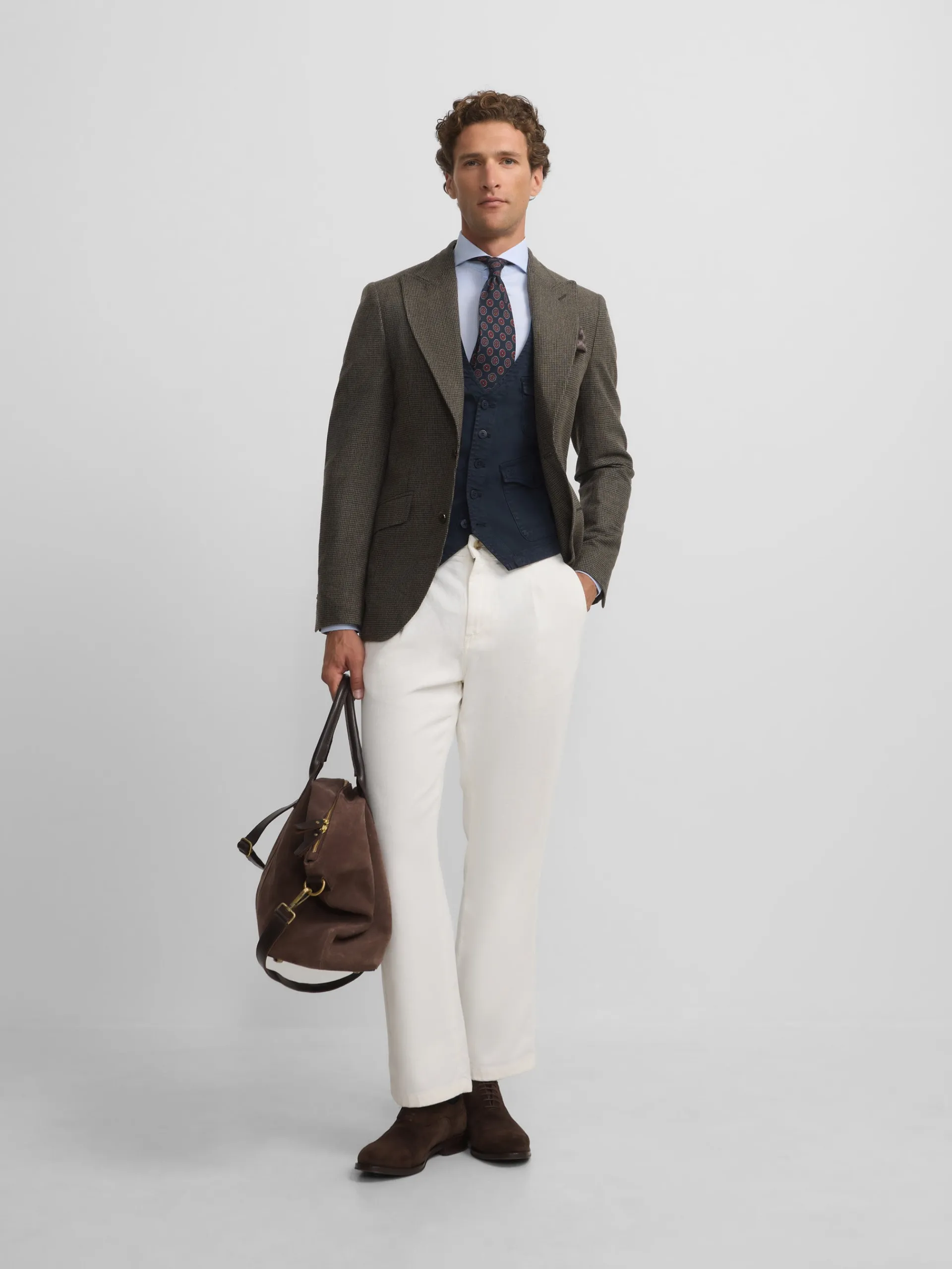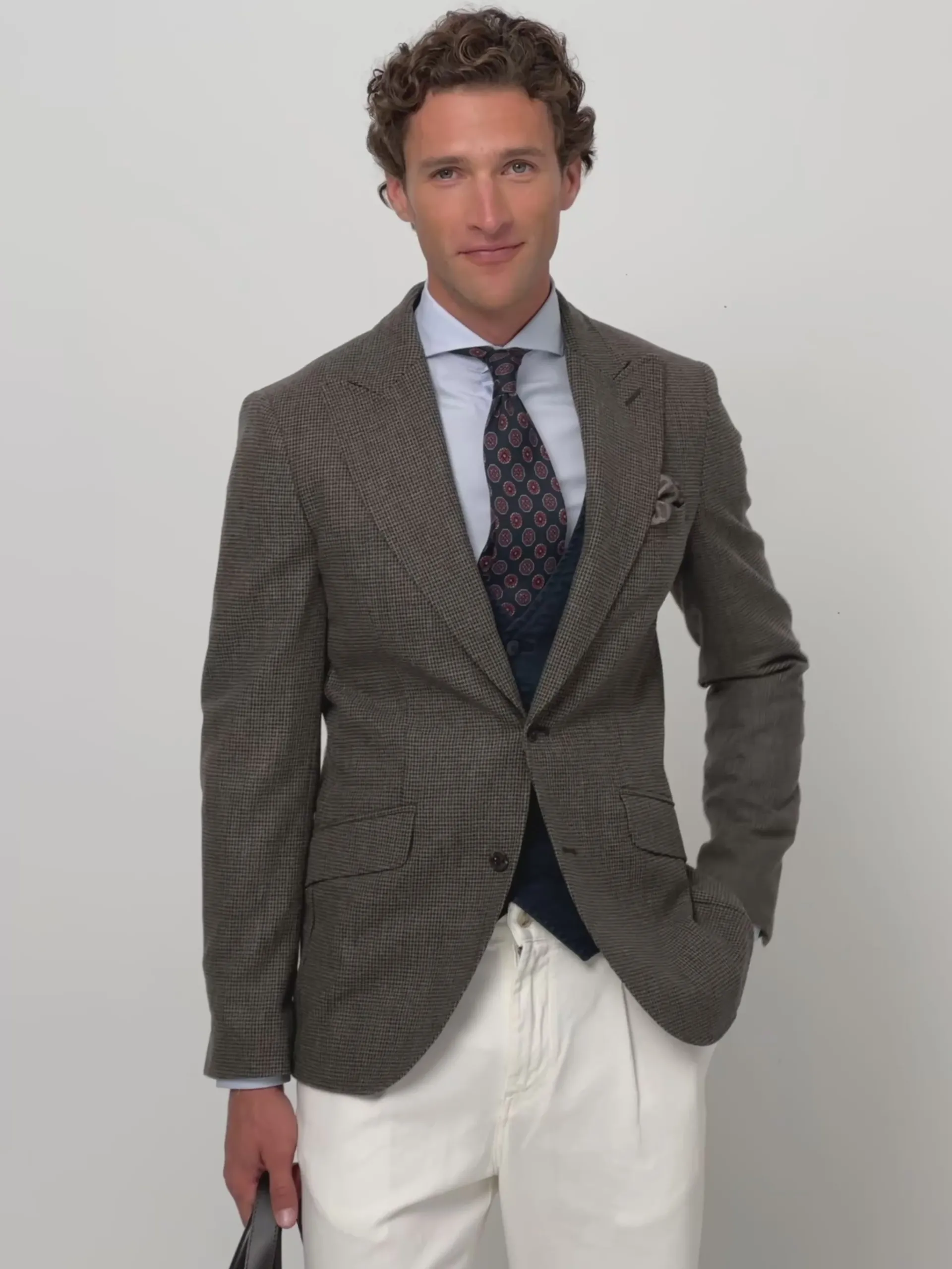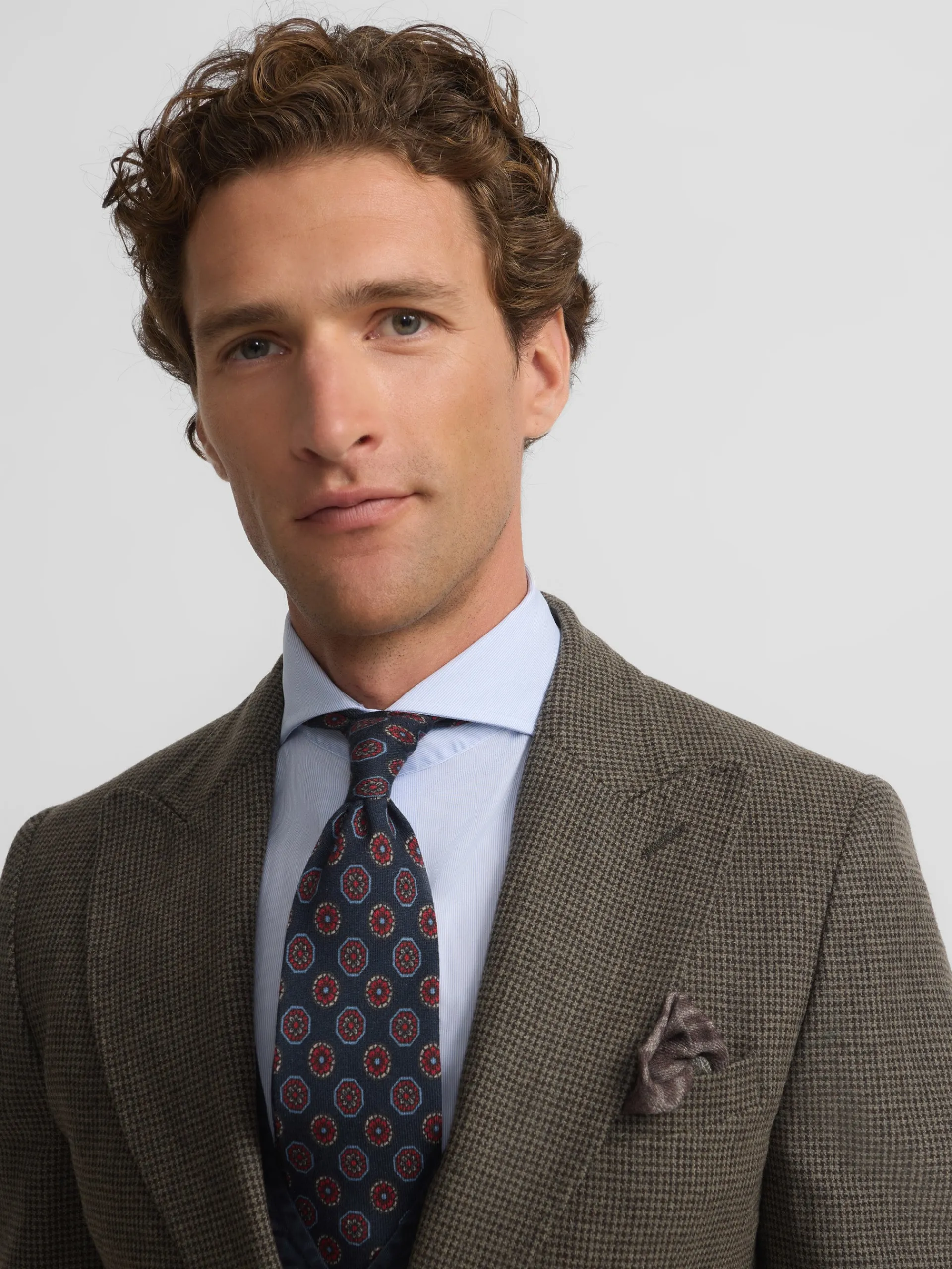 Americana pata de gallo verde confeccionada en 100% lana de corte Tailored Fit. Presenta cierre recto con bolsillos de solapa delanteros y mangas acabadas con ojales y botones realizables. Cuenta con cuello con solapas de muesca. El tejido destaca por su textura y estructura firme, lo que proporciona un ajuste elegante y confortable. Ideal para ocasiones formales o para elevar looks más casuales con un toque sofisticado. Fabricado en Portugal.