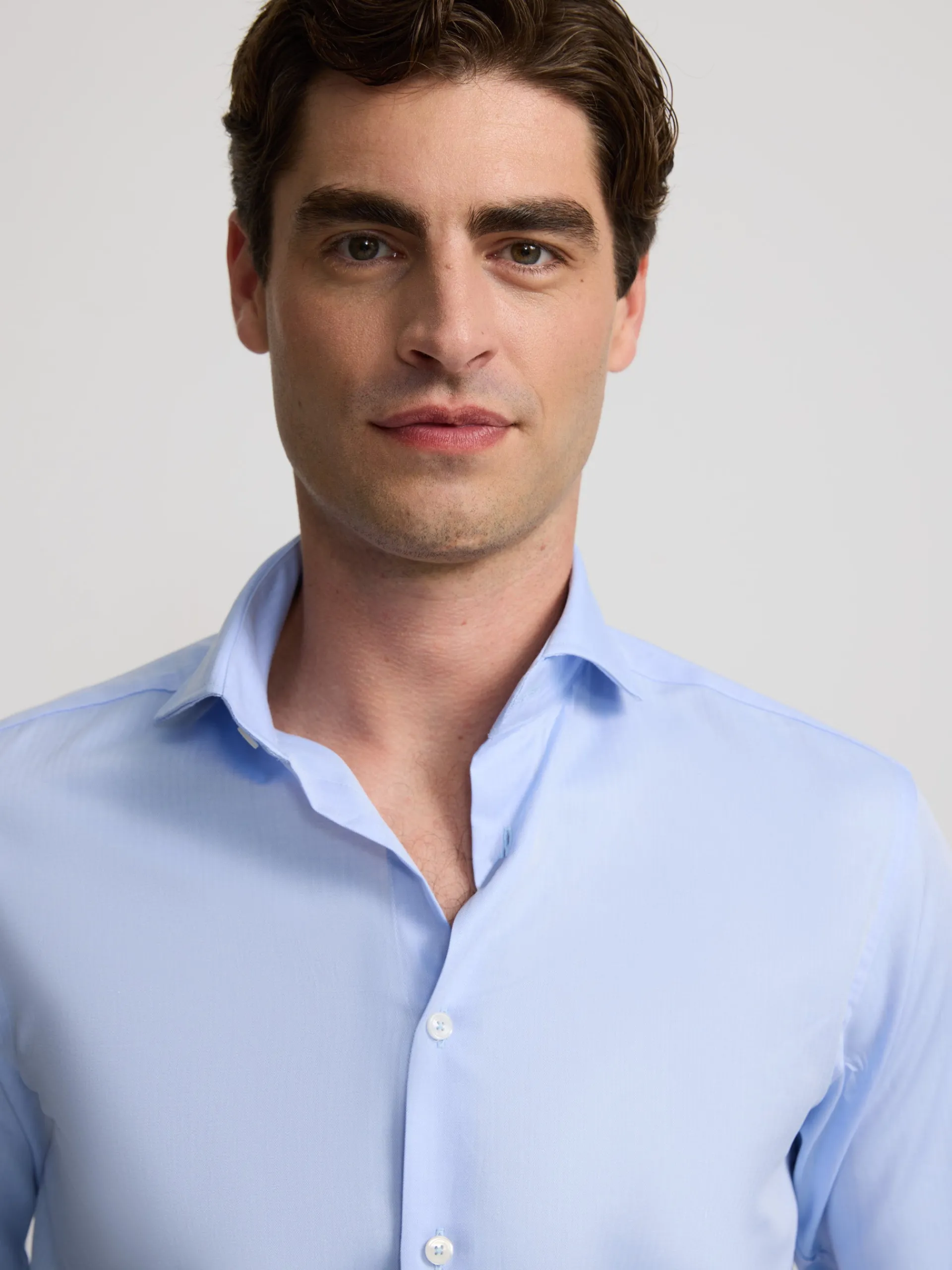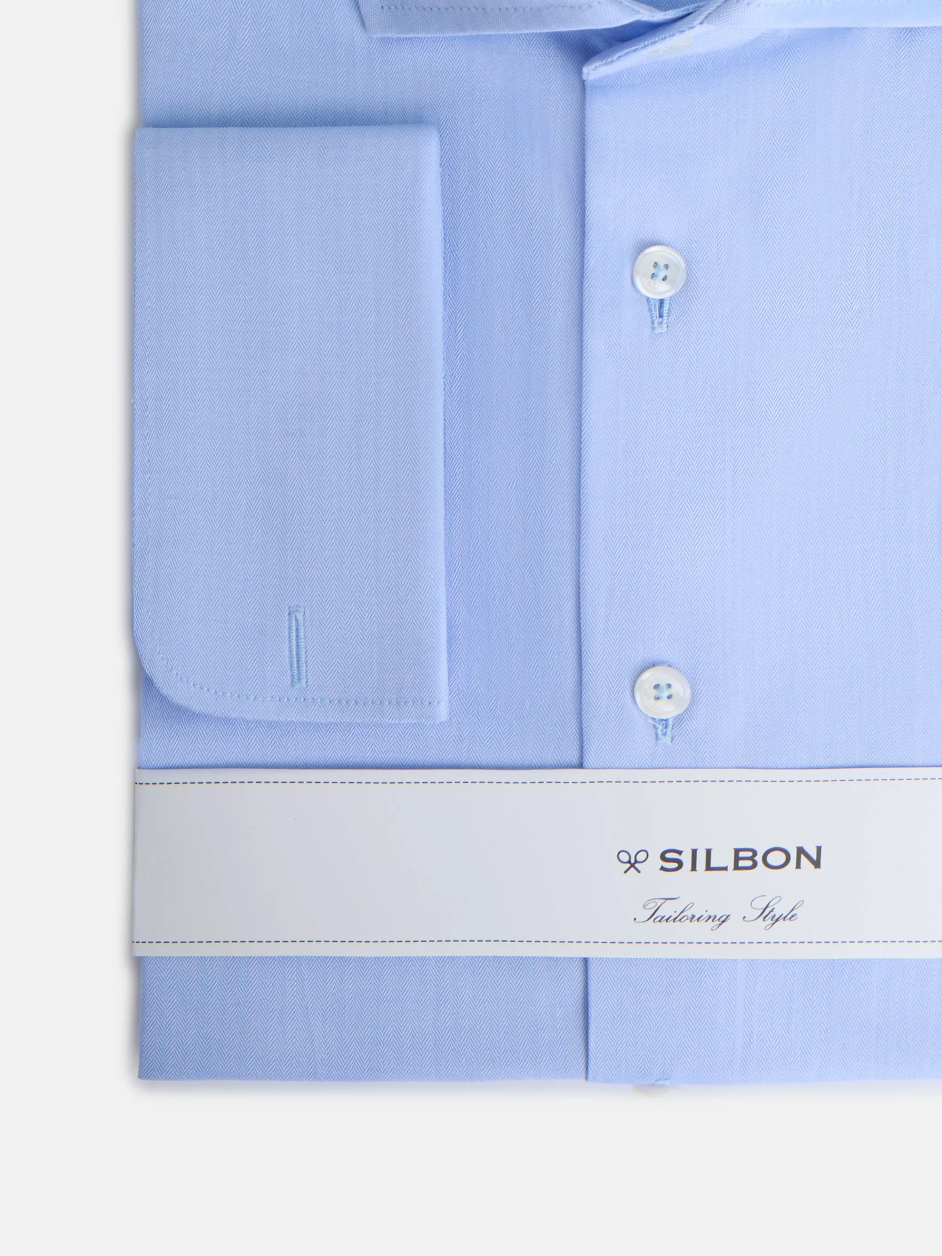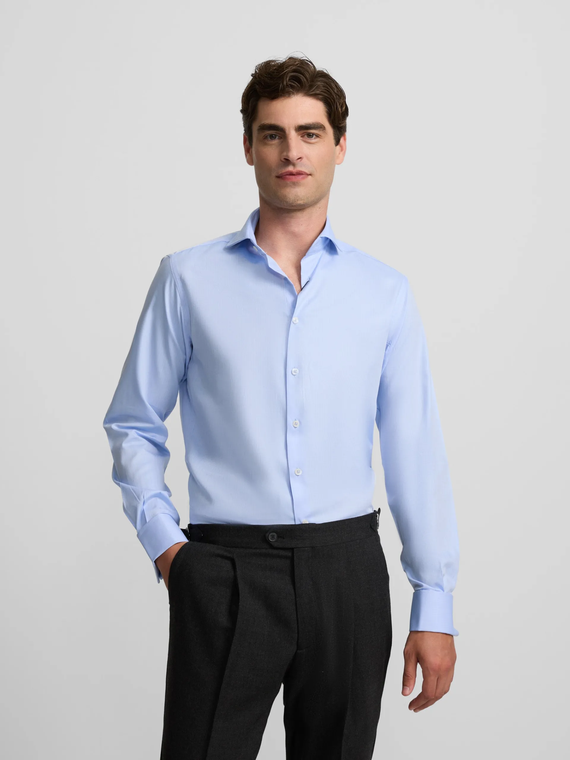 Camisa de vestir confeccionada en tejido espiga de algodón celeste con patrón “Slim fit”, cuello cutaway y puños para gemelos. Incluye nuestras raquetas bordadas en la tapeta y botones personalizados Silbon. Fabricado en España.