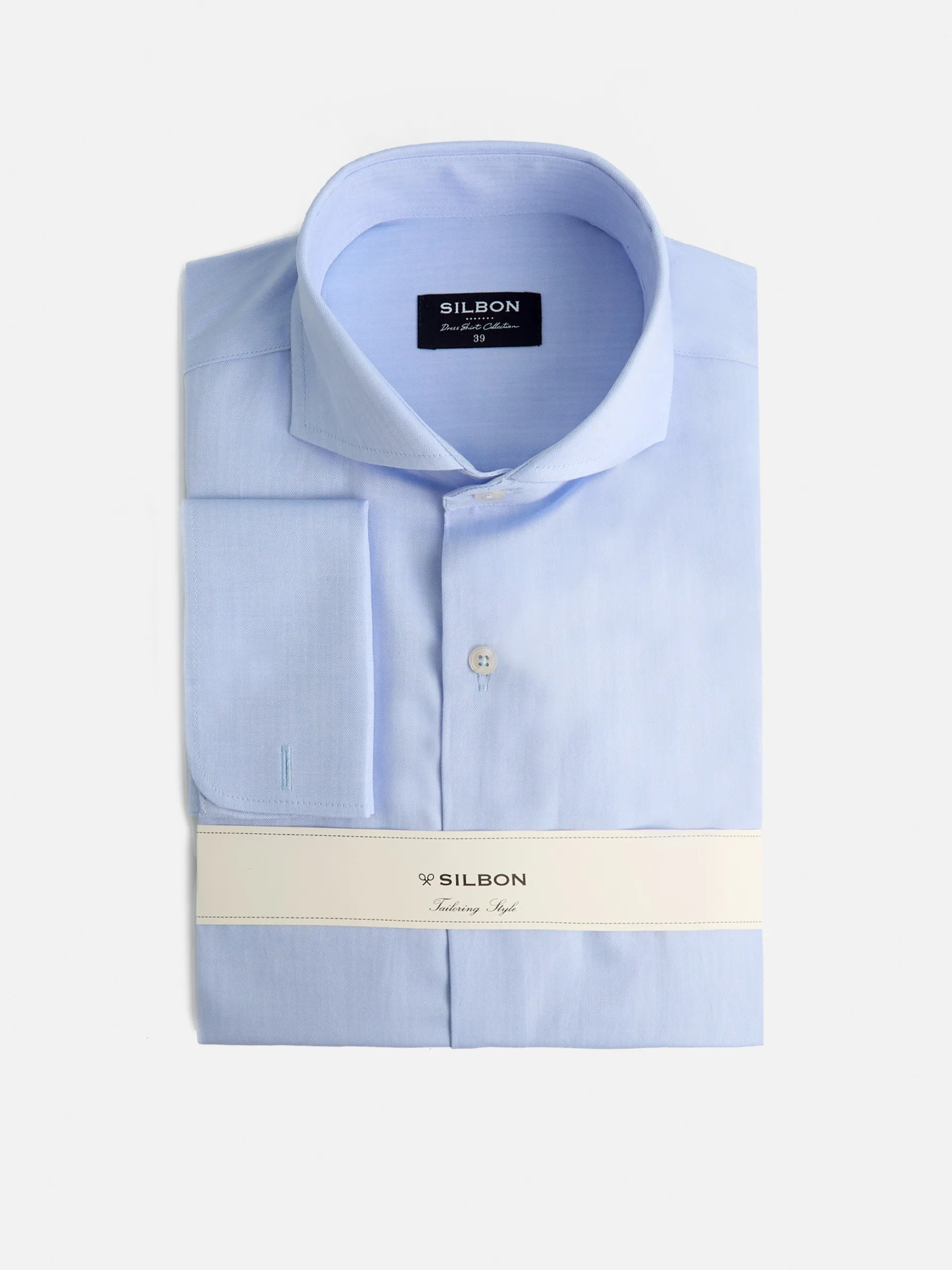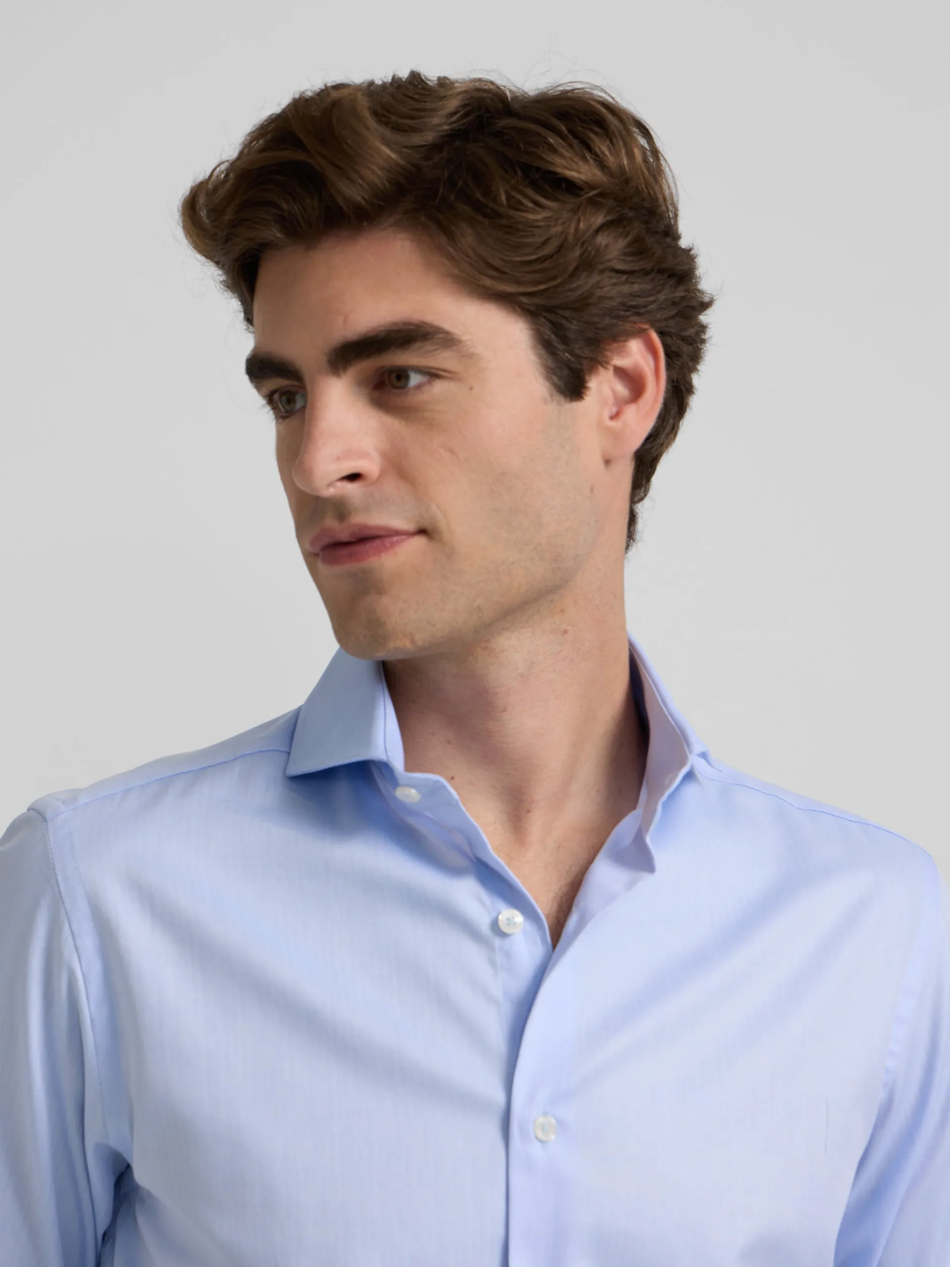 Camisa de vestir confeccionada en tejido espiga de algodón celeste con patrón “Slim fit”, cuello cutaway y puños para gemelos. Incluye nuestras raquetas bordadas en la tapeta y botones personalizados Silbon. Fabricada en España.