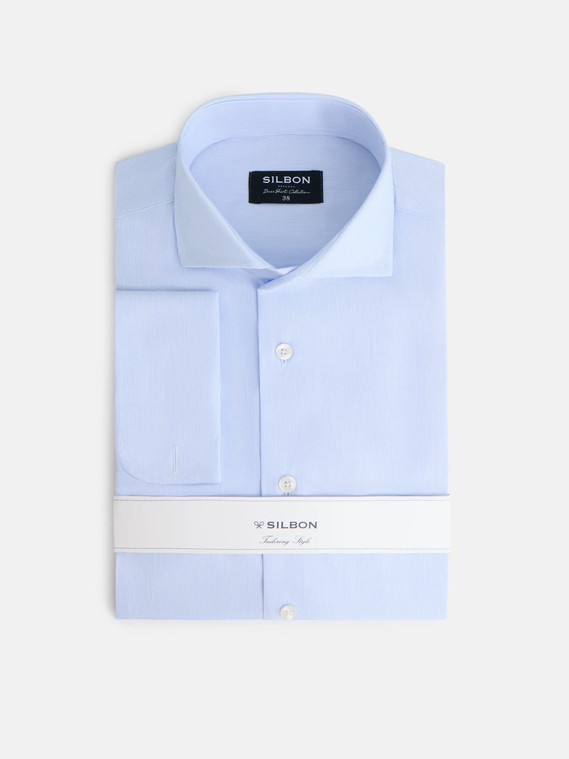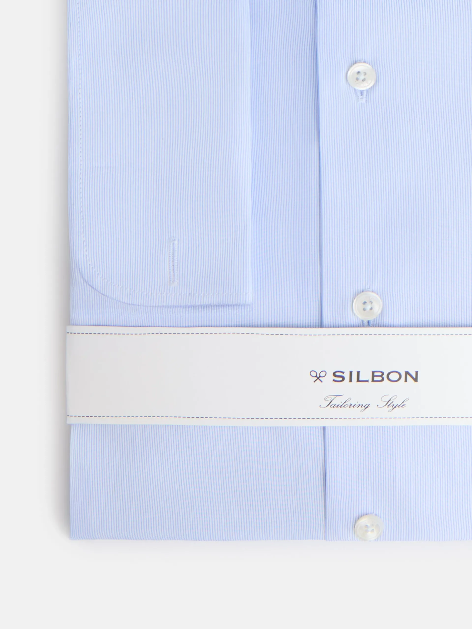 Camisa de vestir confeccionada en 100% algodón con pequeñas rayas azules con patrón «Slim fit», cuello cutaway y puño doble para gemelos. Cuenta con personalizado de raquetas bordadas en la tapeta y botones personalizados Silbon. Fabricada en España.