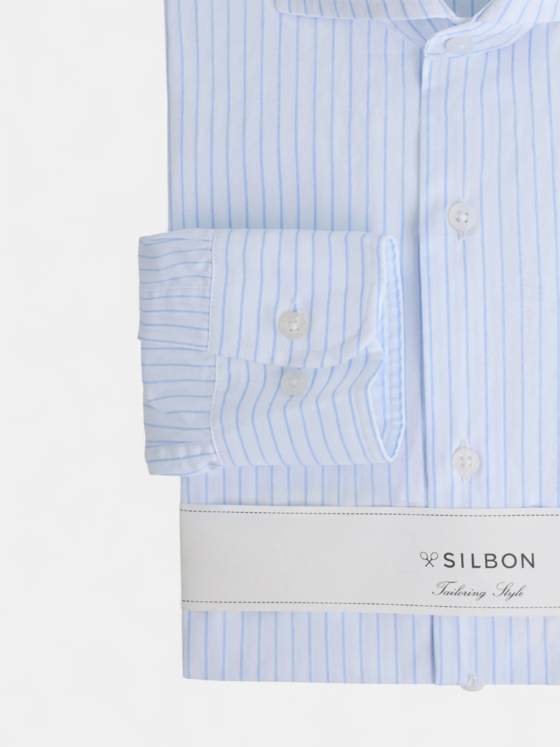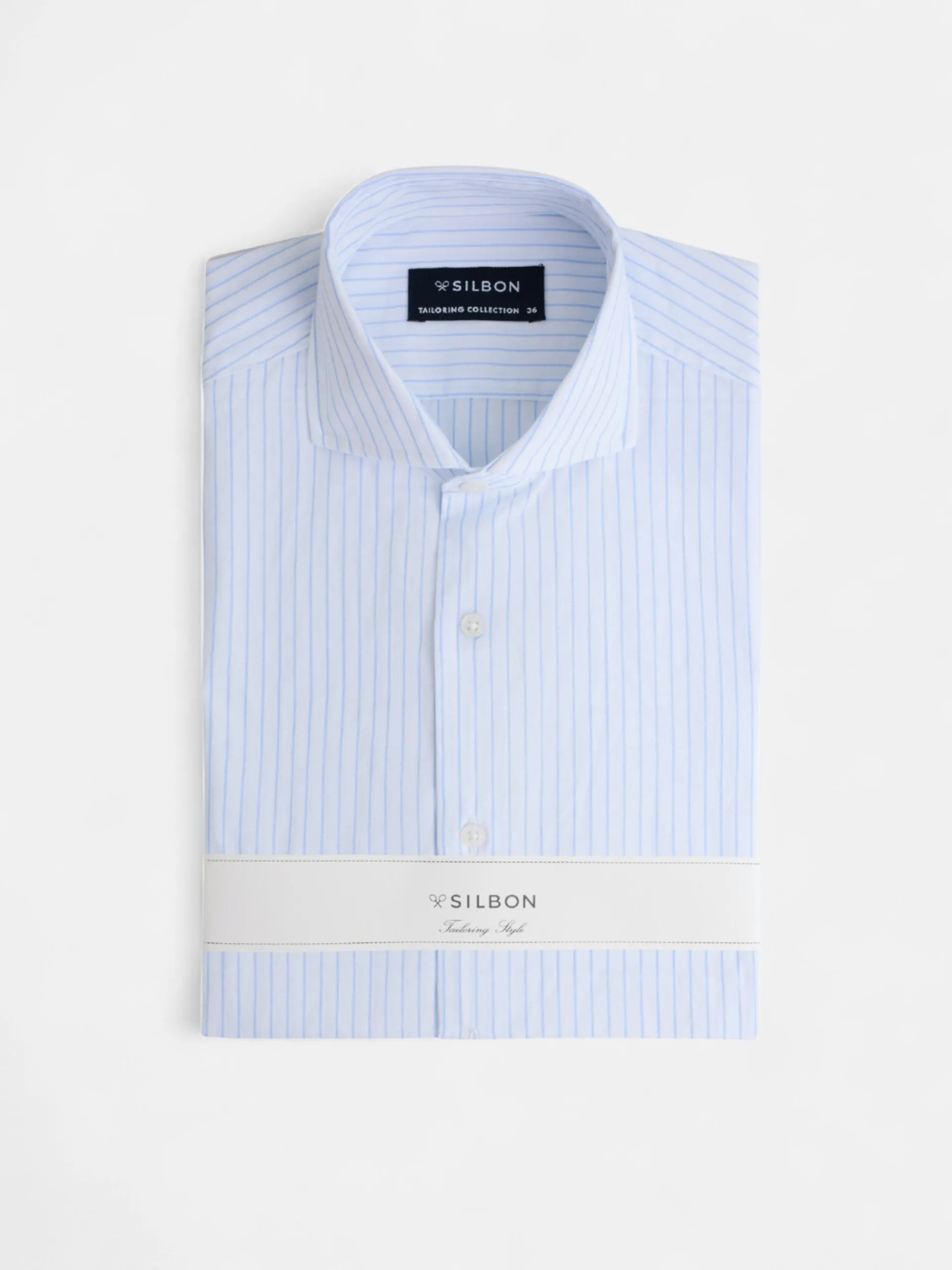 Camisa de vestir de raya ancha celeste confeccionada en tejido de 100% algodón. Presenta cuello cutaway y puño simple. Incluye nuestras raquetas bordadas en la tapeta y botones personalizados Silbon. Fabricada en España.