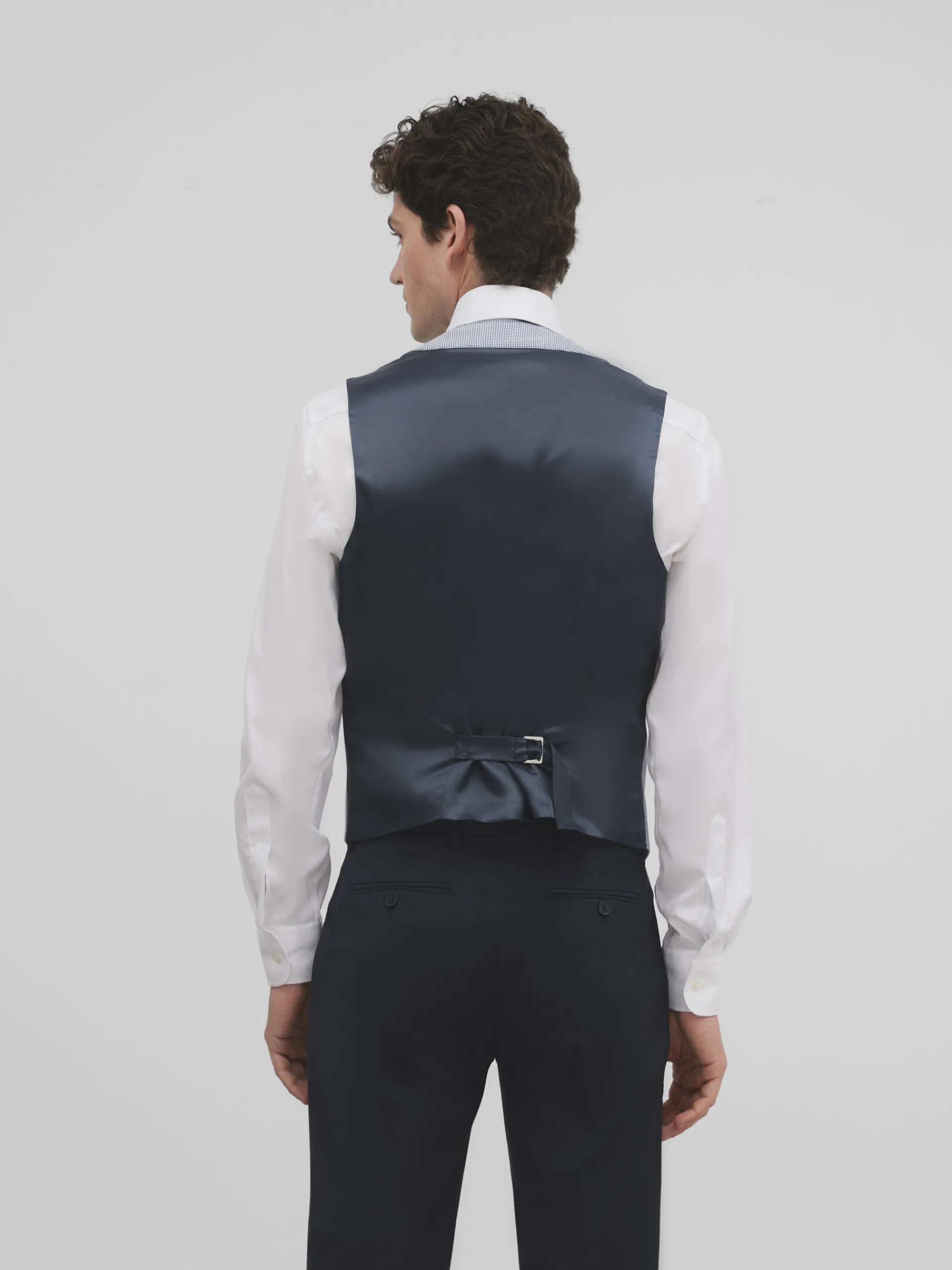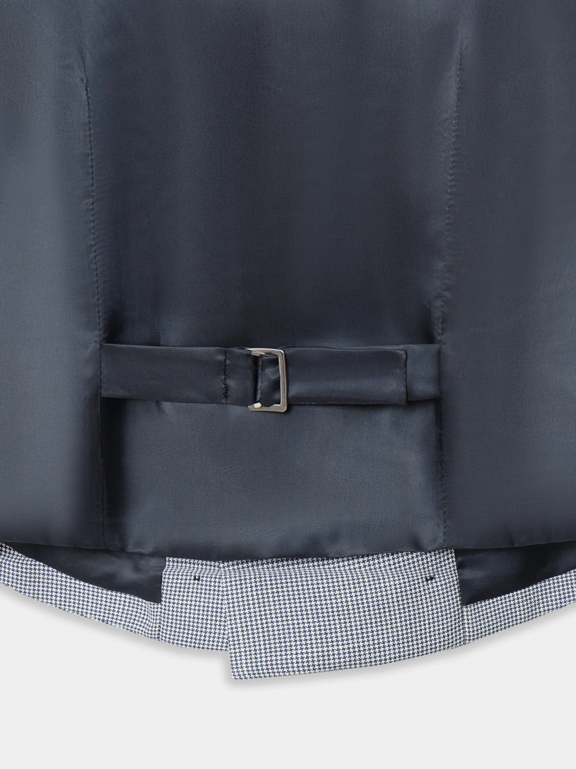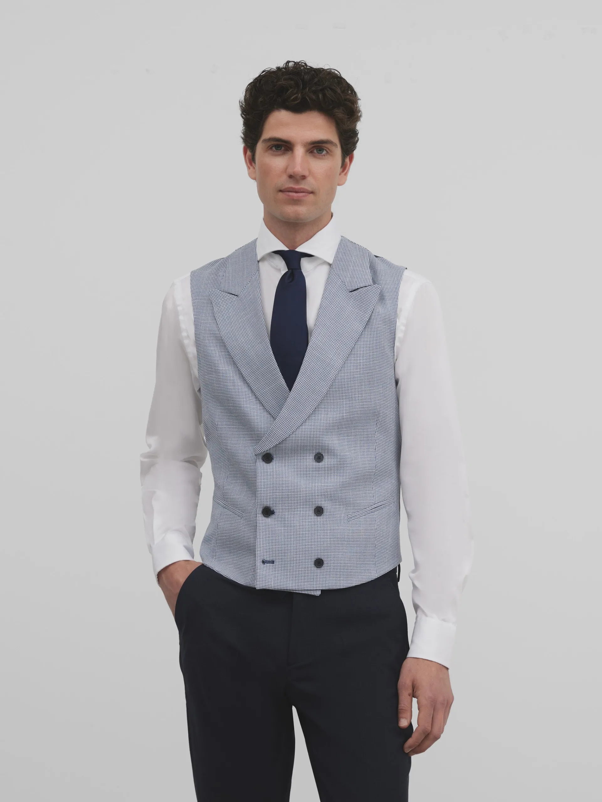 Chaleco de vestir clásico de pata de gallo de corte Regular fit. Presenta forro azul marino con ajustable metálico. Este chaleco presenta solapas con forma de punta de lanza y cierre cruzado con seis botones personalizados de color azul marino nacarado. Fabricado en España.