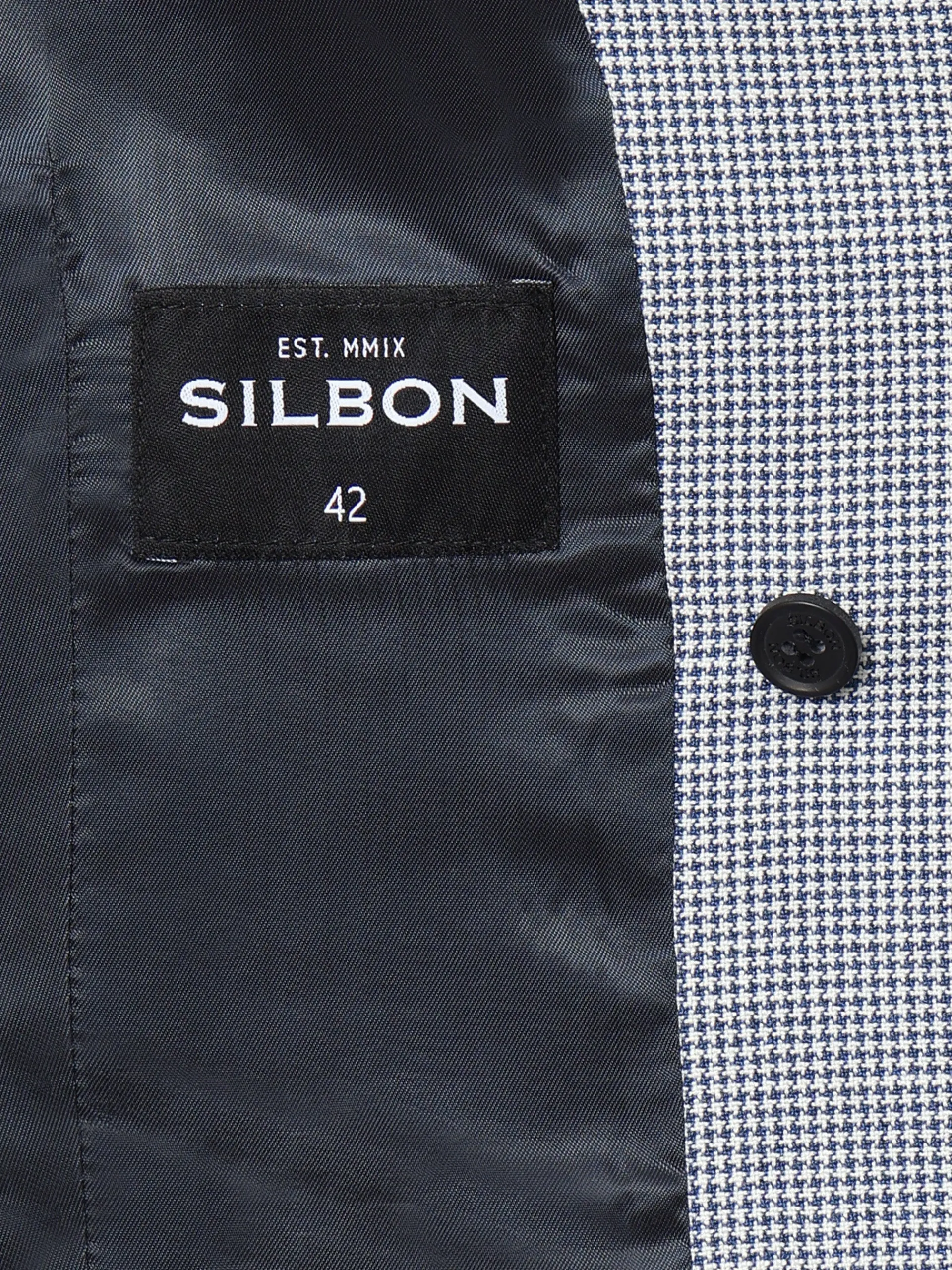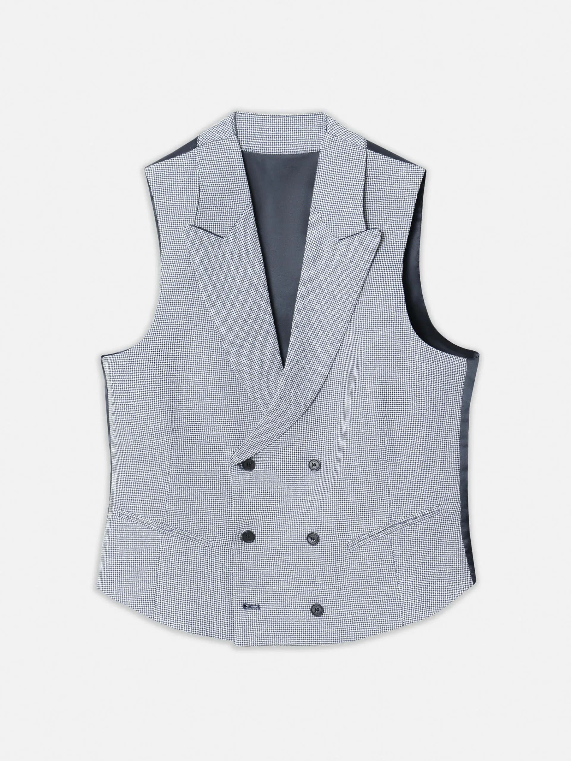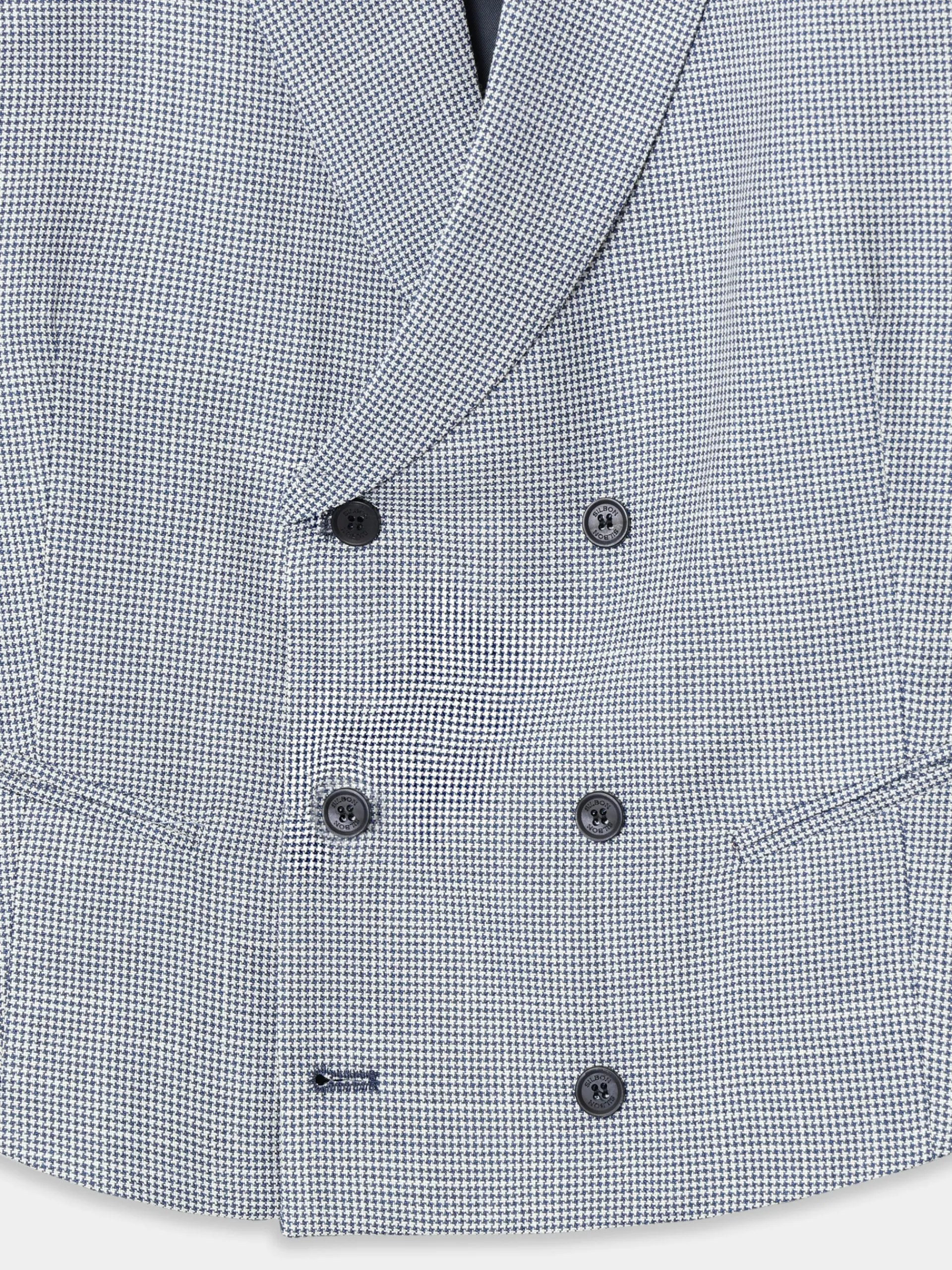 Chaleco de vestir clásico de pata de gallo de corte Regular fit. Presenta forro azul marino con ajustable metálico. Este chaleco presenta solapas con forma de punta de lanza y cierre cruzado con seis botones personalizados de color azul marino nacarado. Fabricado en España.