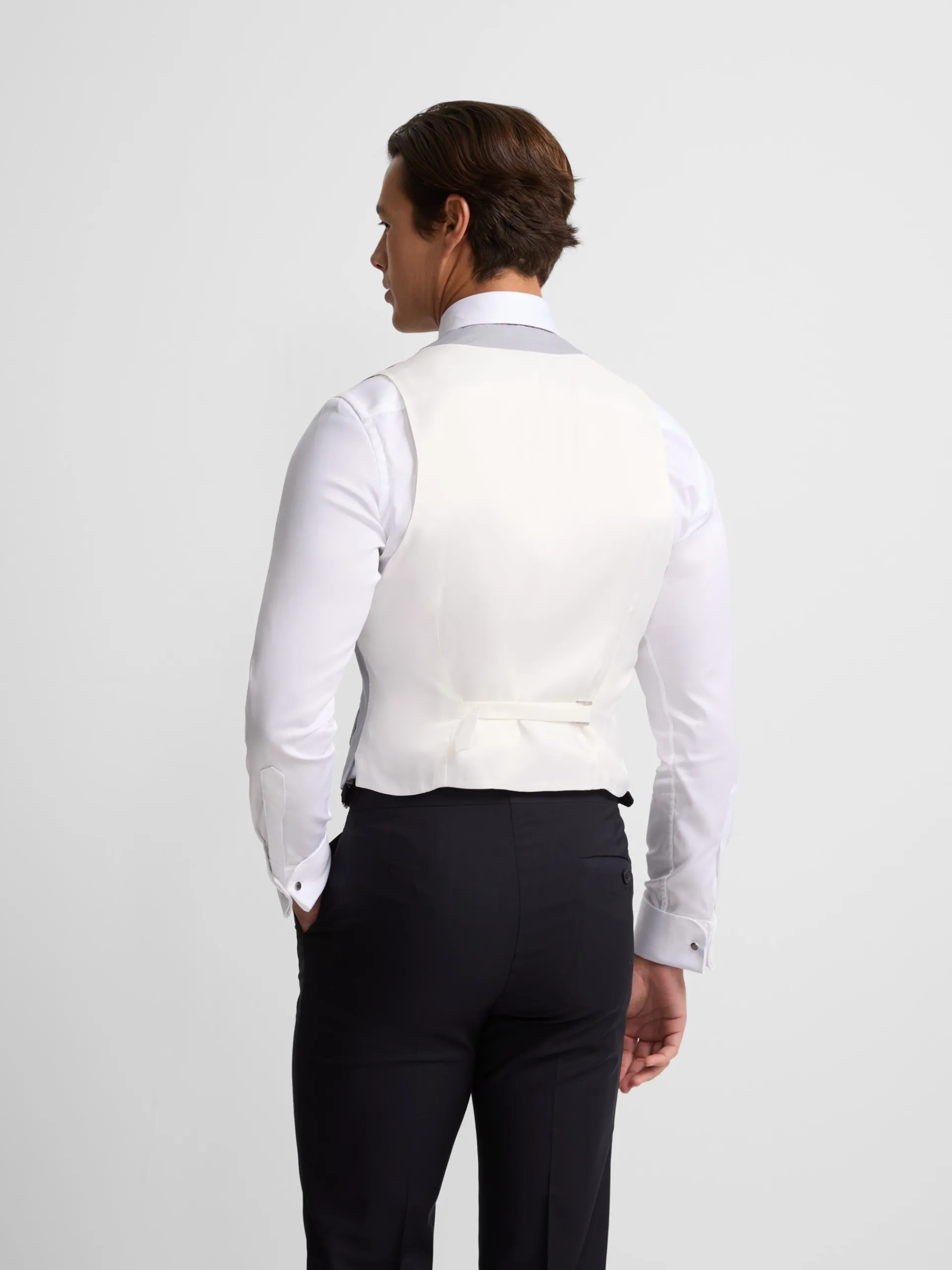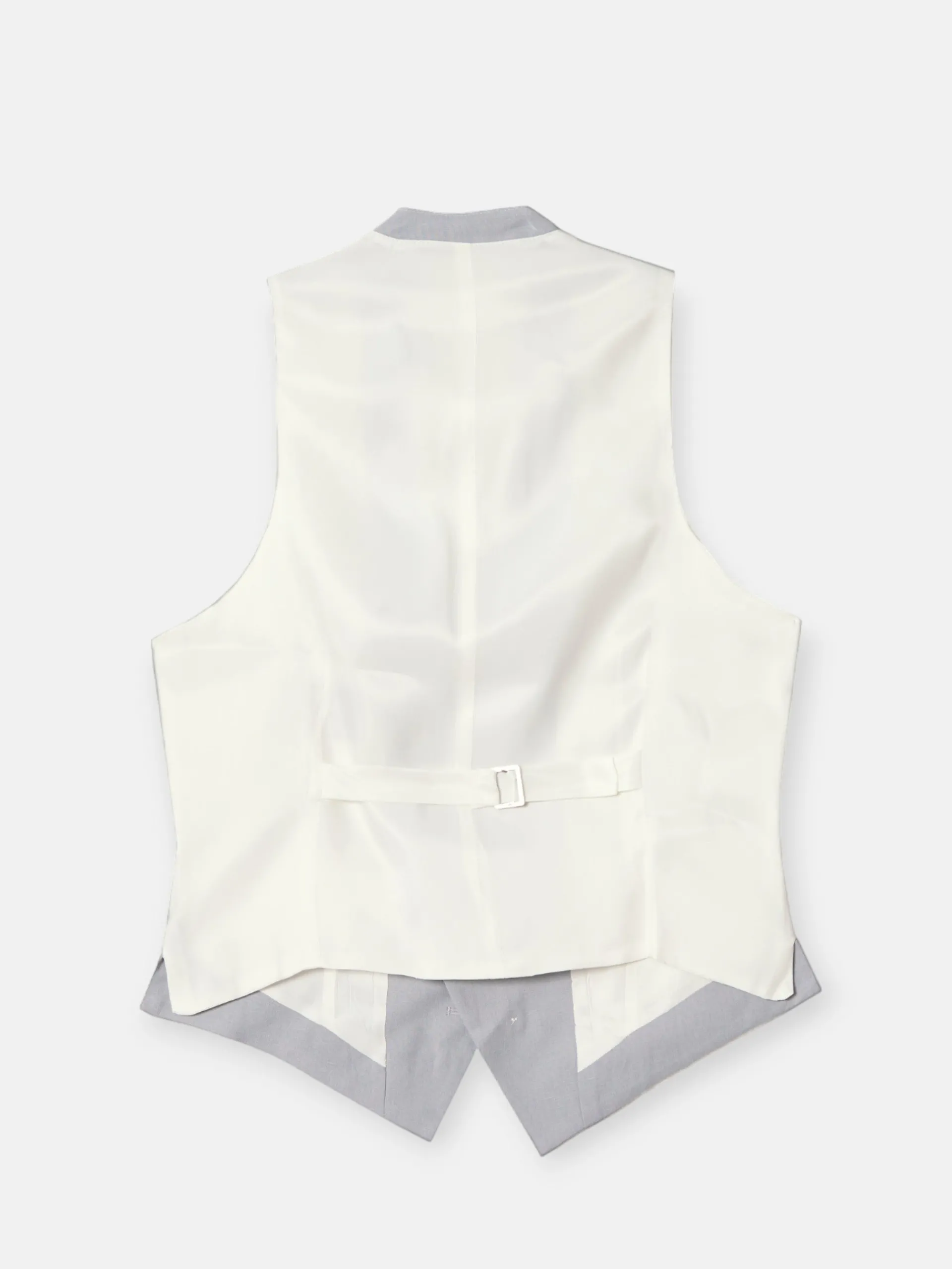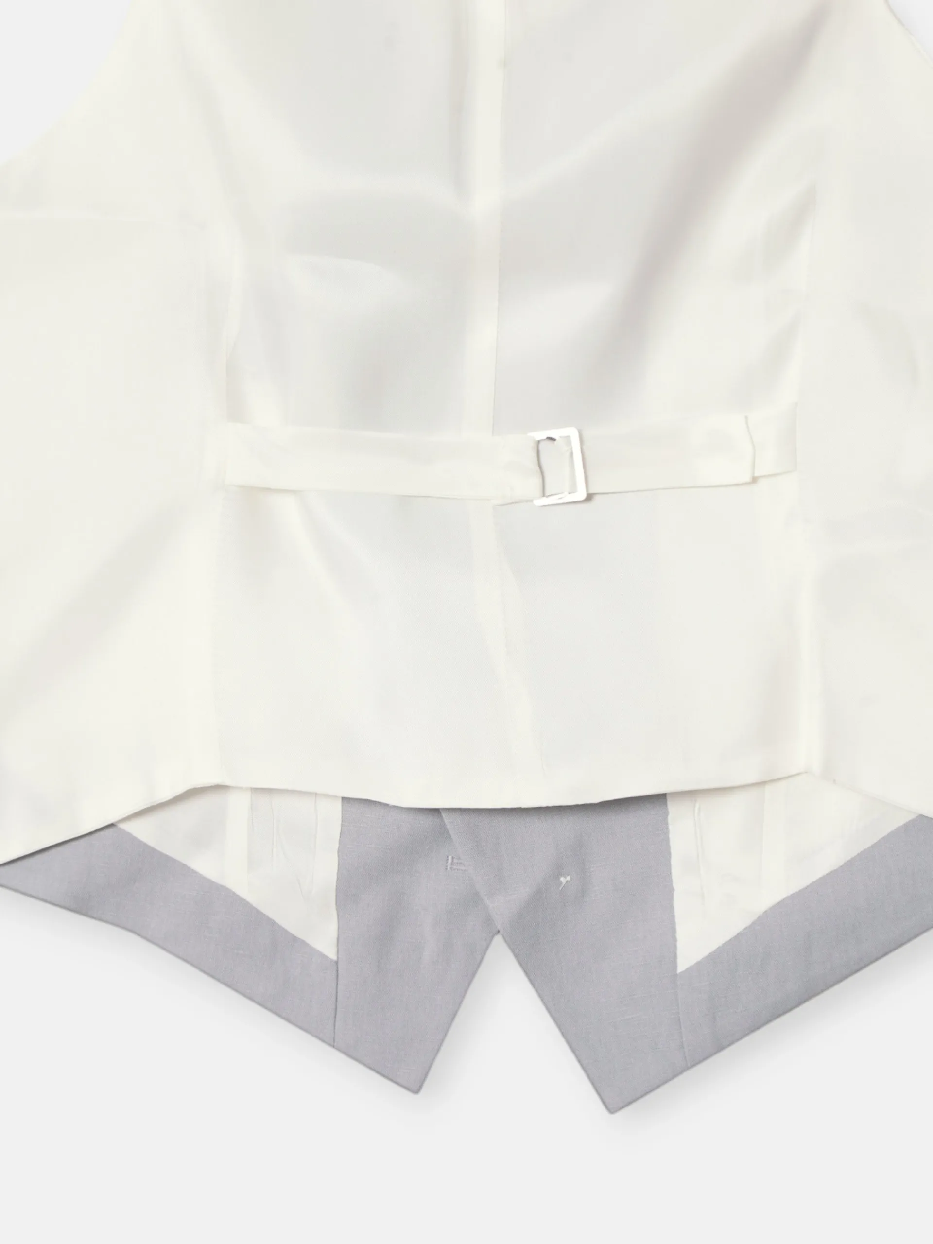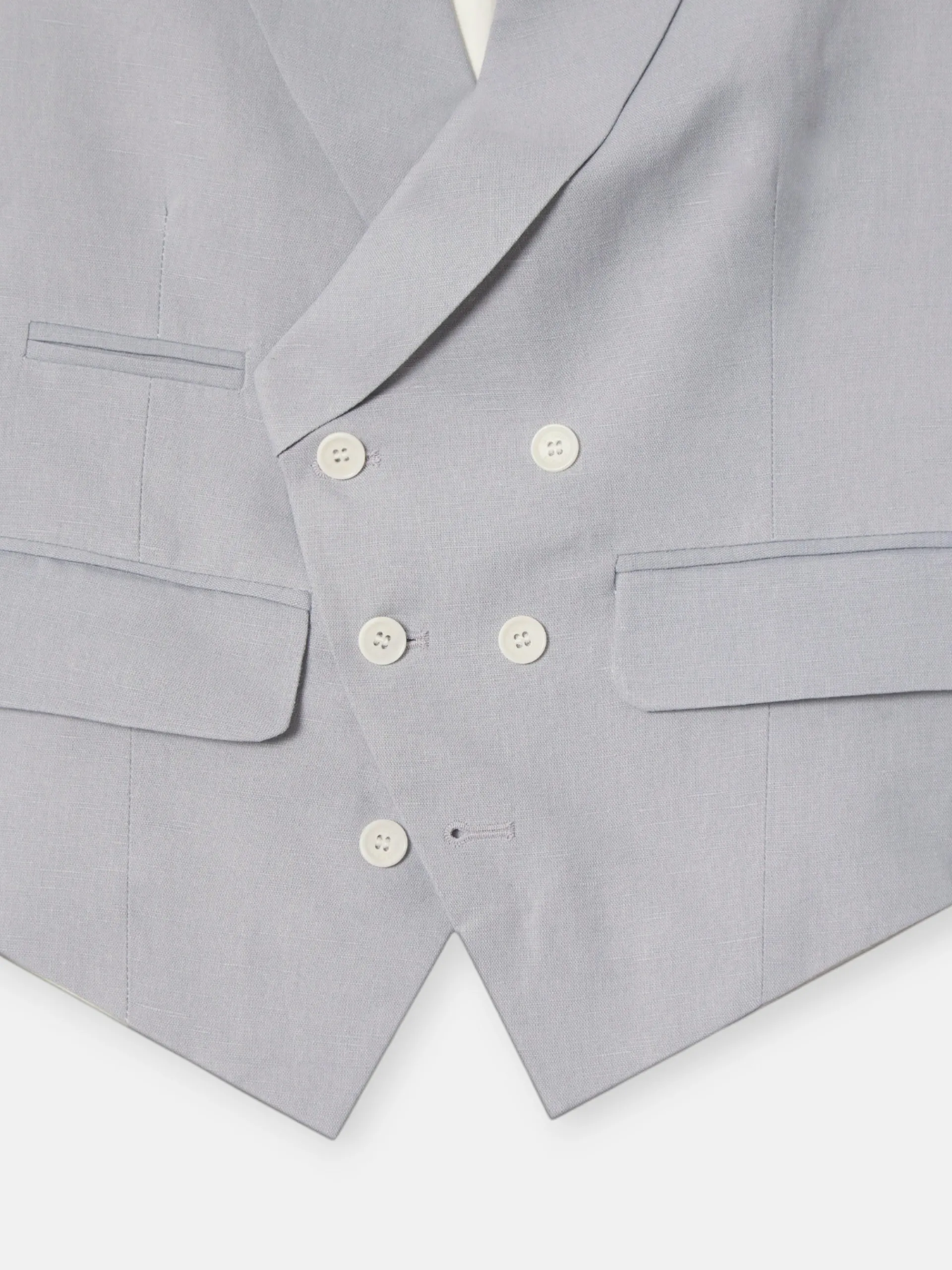 Chaleco chaqué Silbon tailoring confeccionado en mezcla de lino y algodón de color azul medio y forro blanco con ajustable. Este chaleco presenta solapas con forma de pico y cierre cruzado con botones personalizados en color blanco. «Fabricado en España»