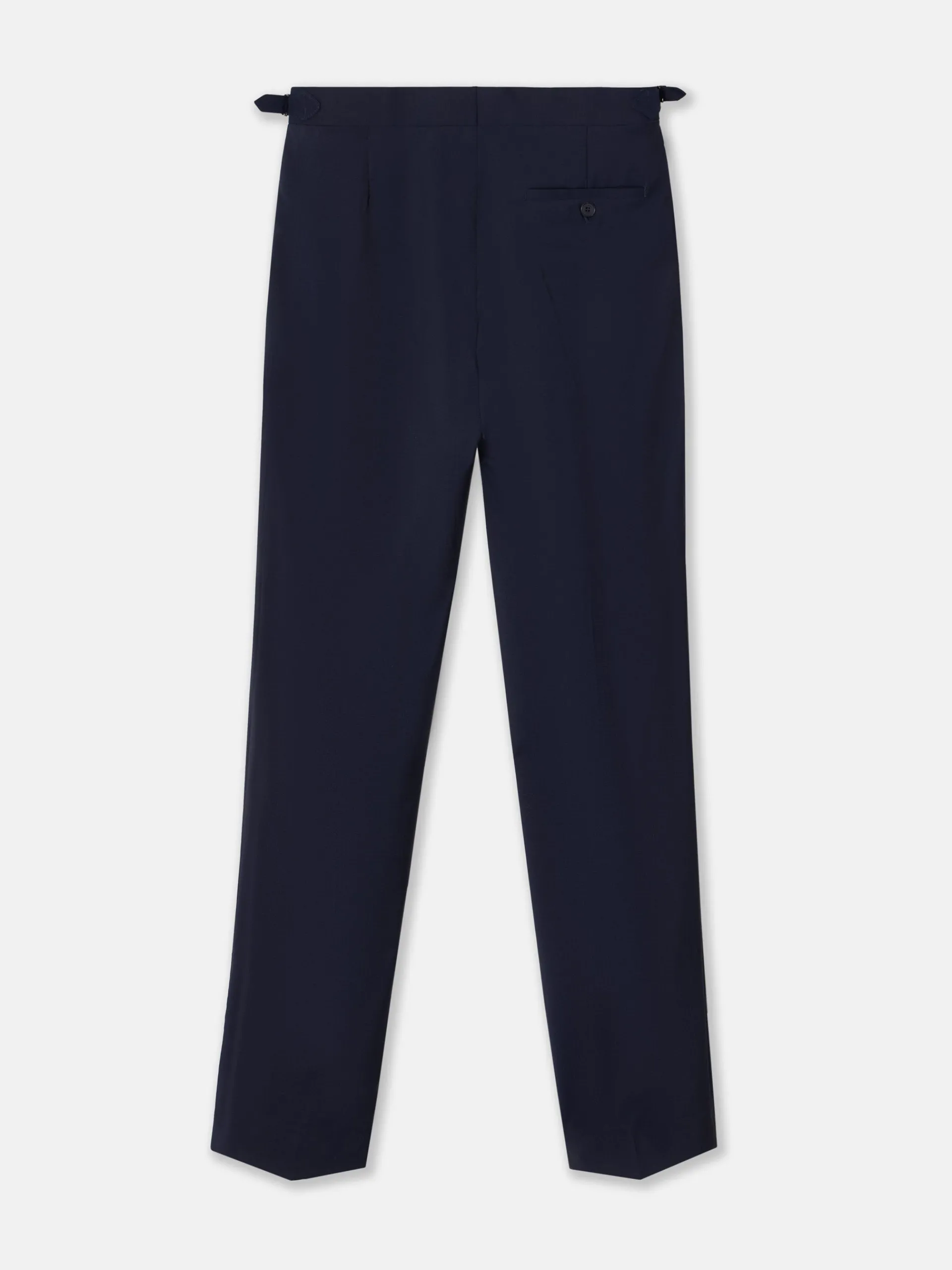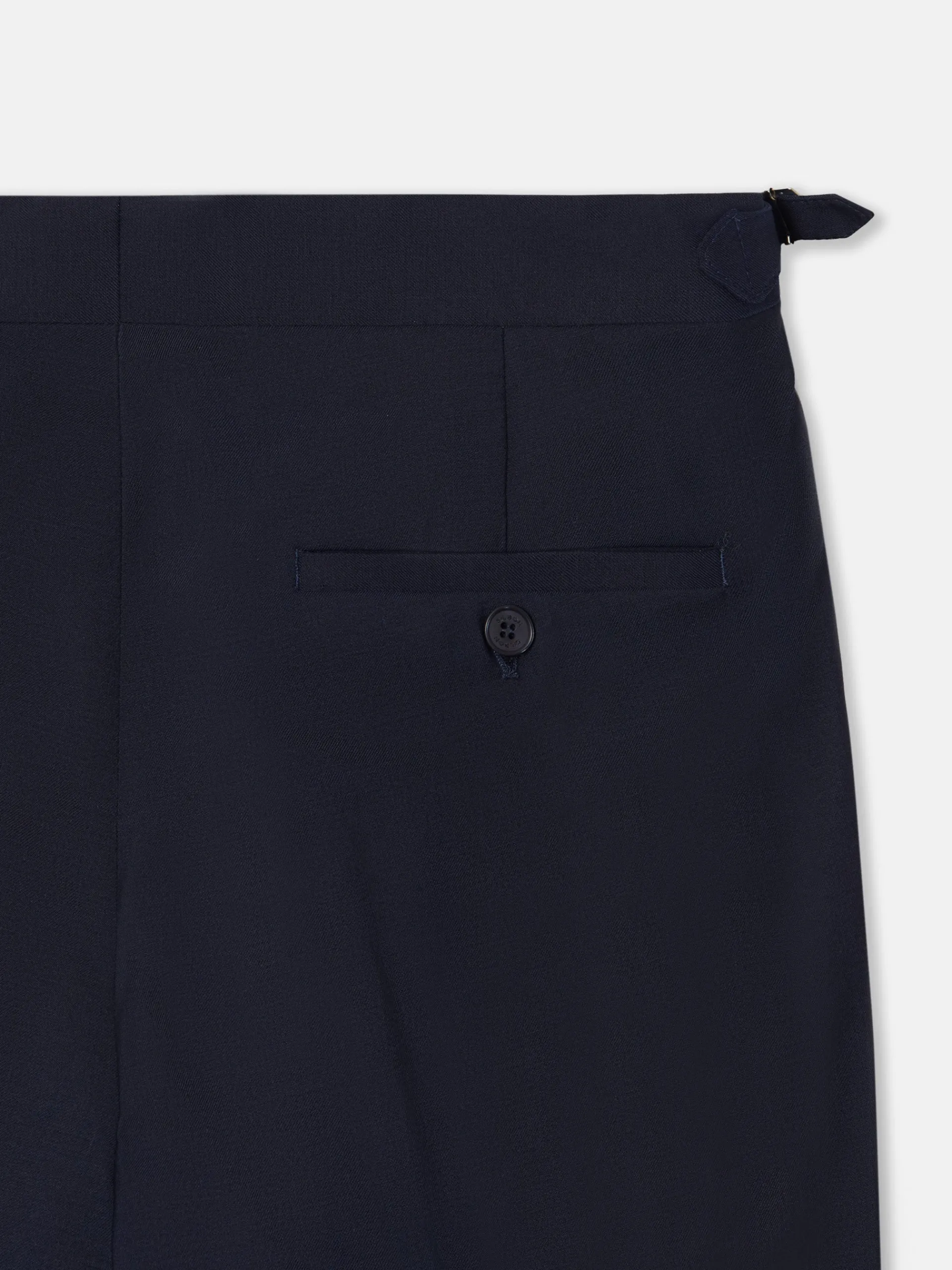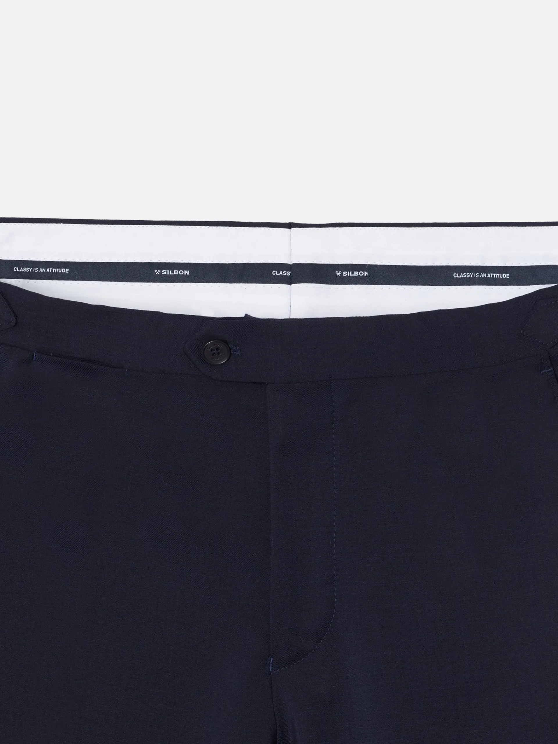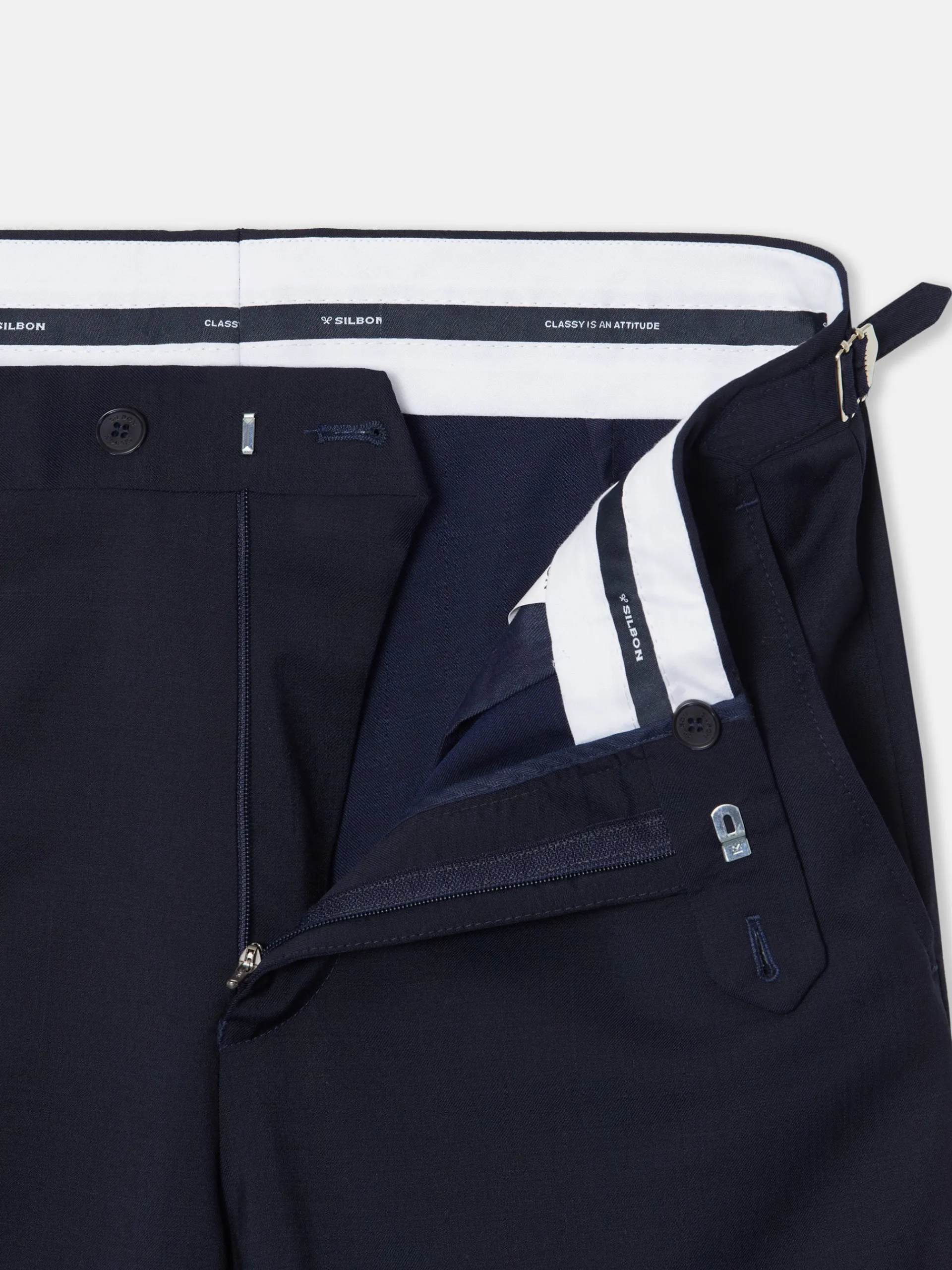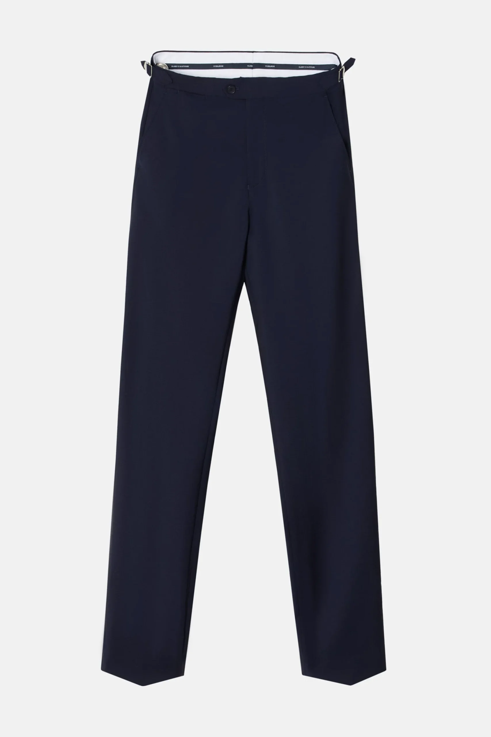 Pantalón de chaqué natural strech confeccionado en 100% lana. Presenta un corte clásico con cierre prolonga con botón personalizado y cremallera, bolsillos laterales y bolsillos insertados en trasero. Cuenta con ajustadores laterales en cintura y bajo sin vuelta. Fabricado en Portugal.