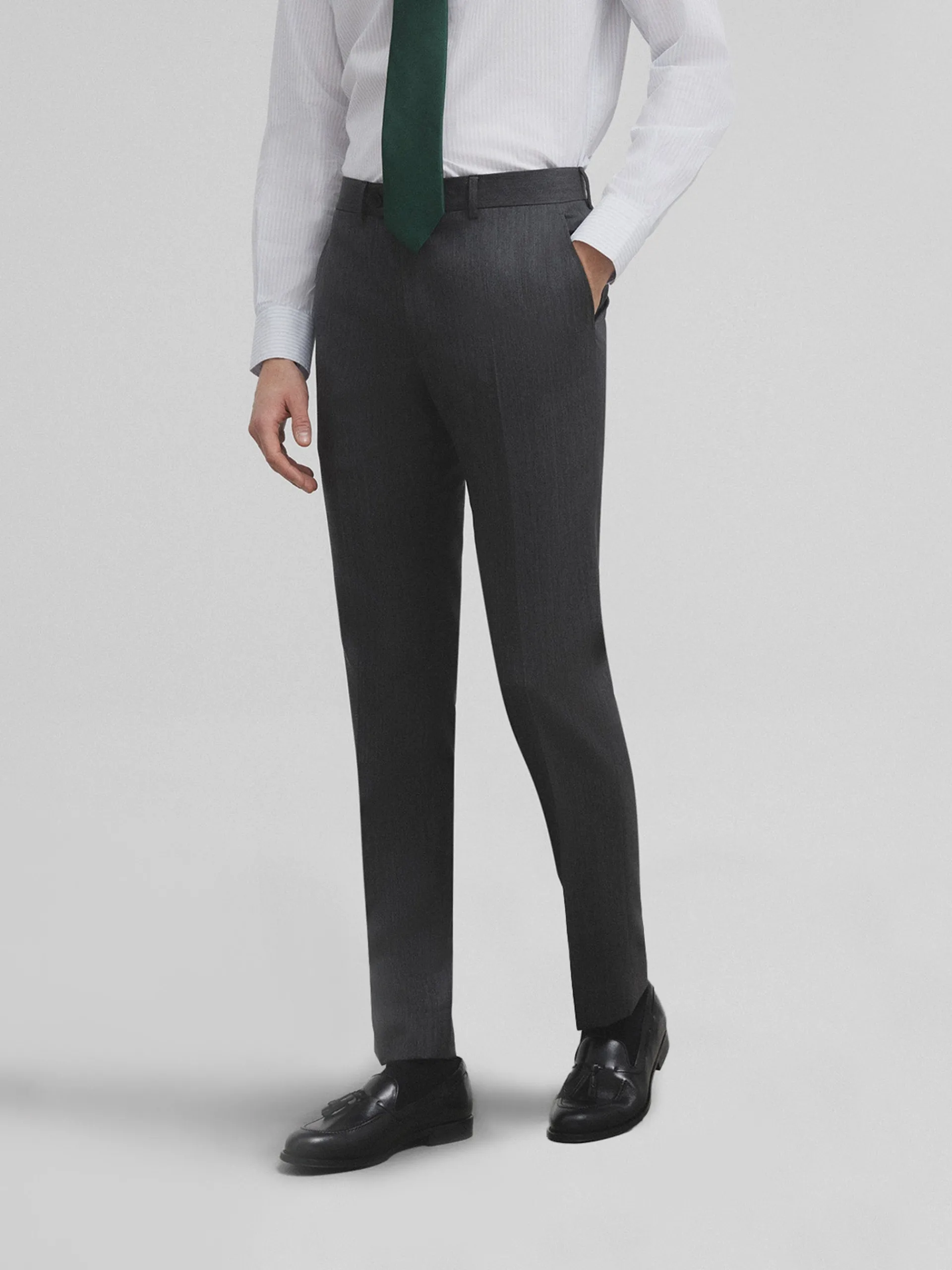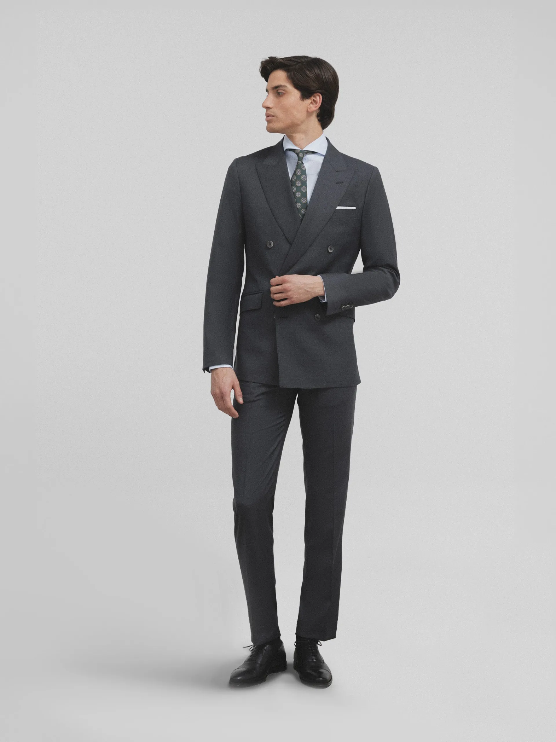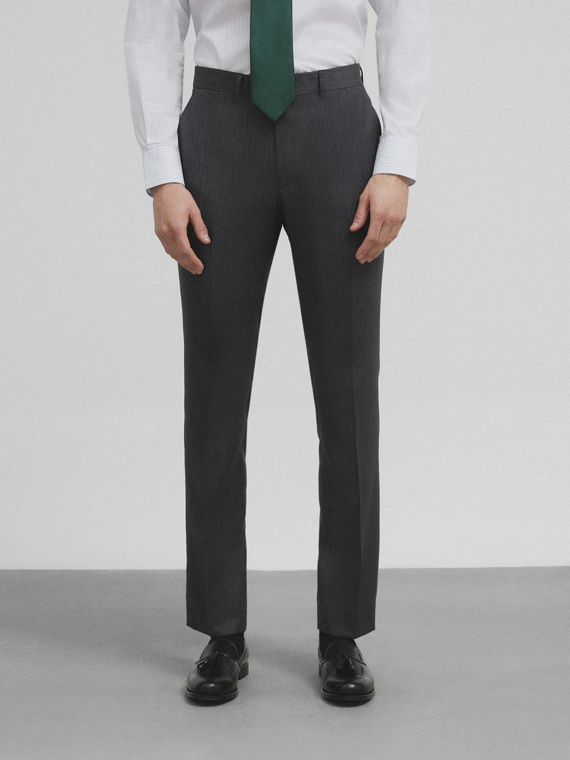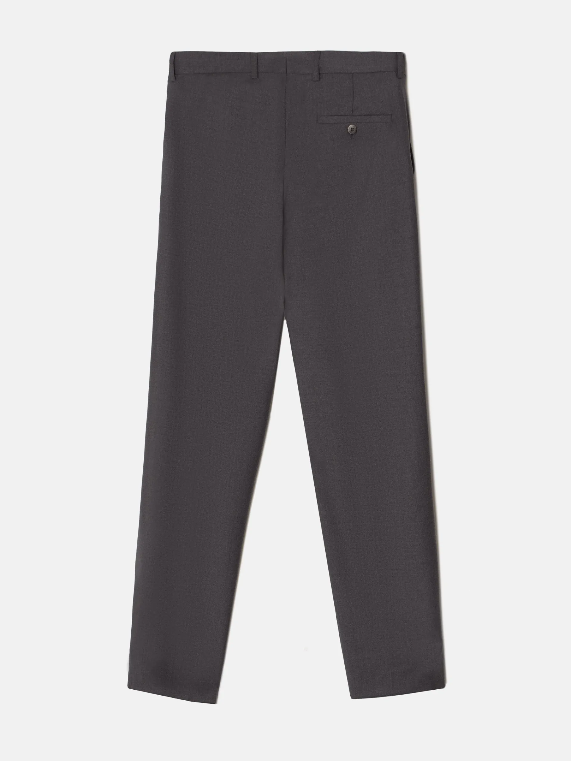 Pantalón de traje cruzado strech confeccionado en 100% lana. Presenta un corte clásico con cierre prolonga con botón personalizado y cremallera, bolsillos laterales y bolsillos insertados en trasero. Cuenta con trabillas y bajo sin vuelta. Fabricado en Portugal.