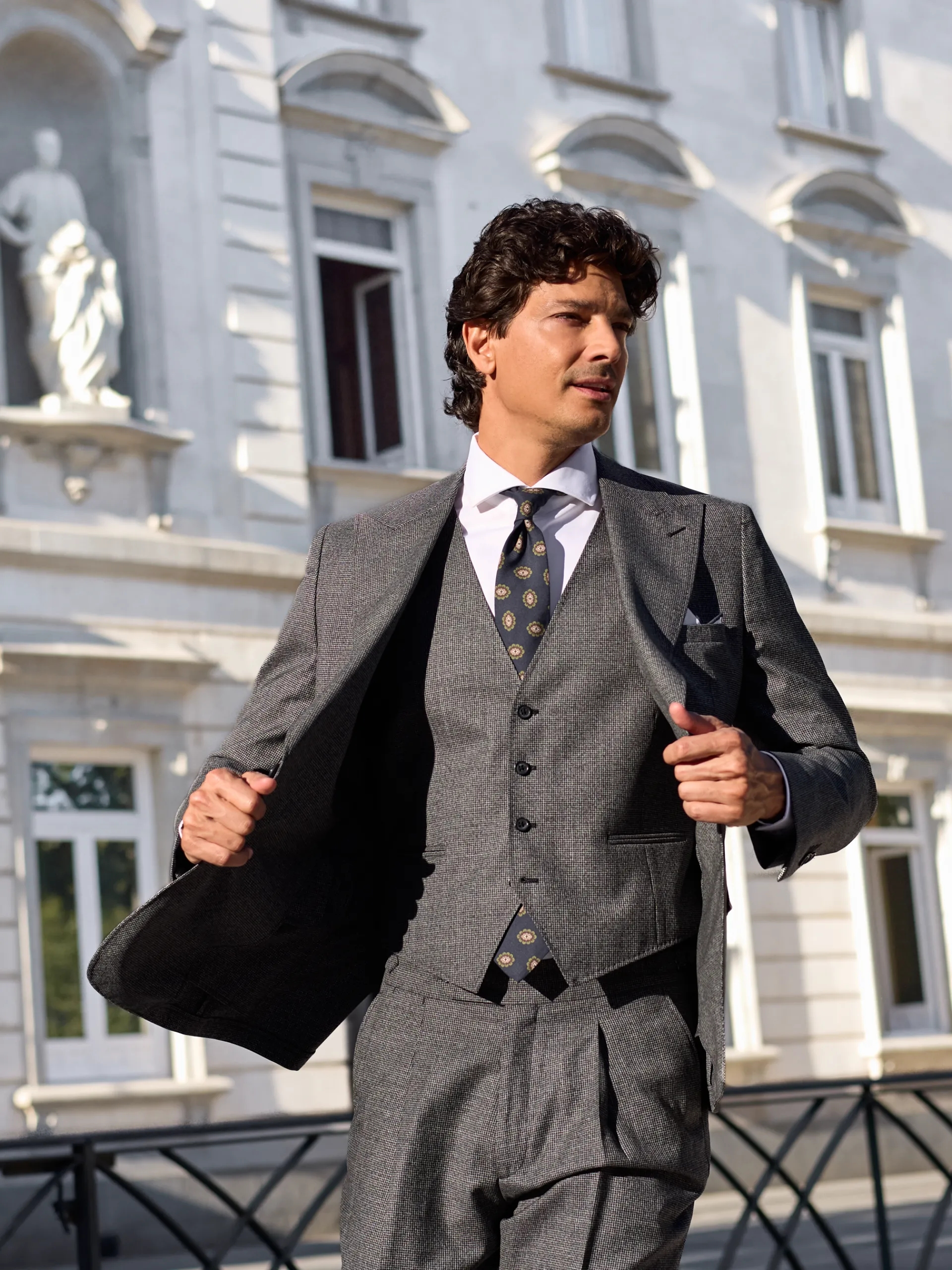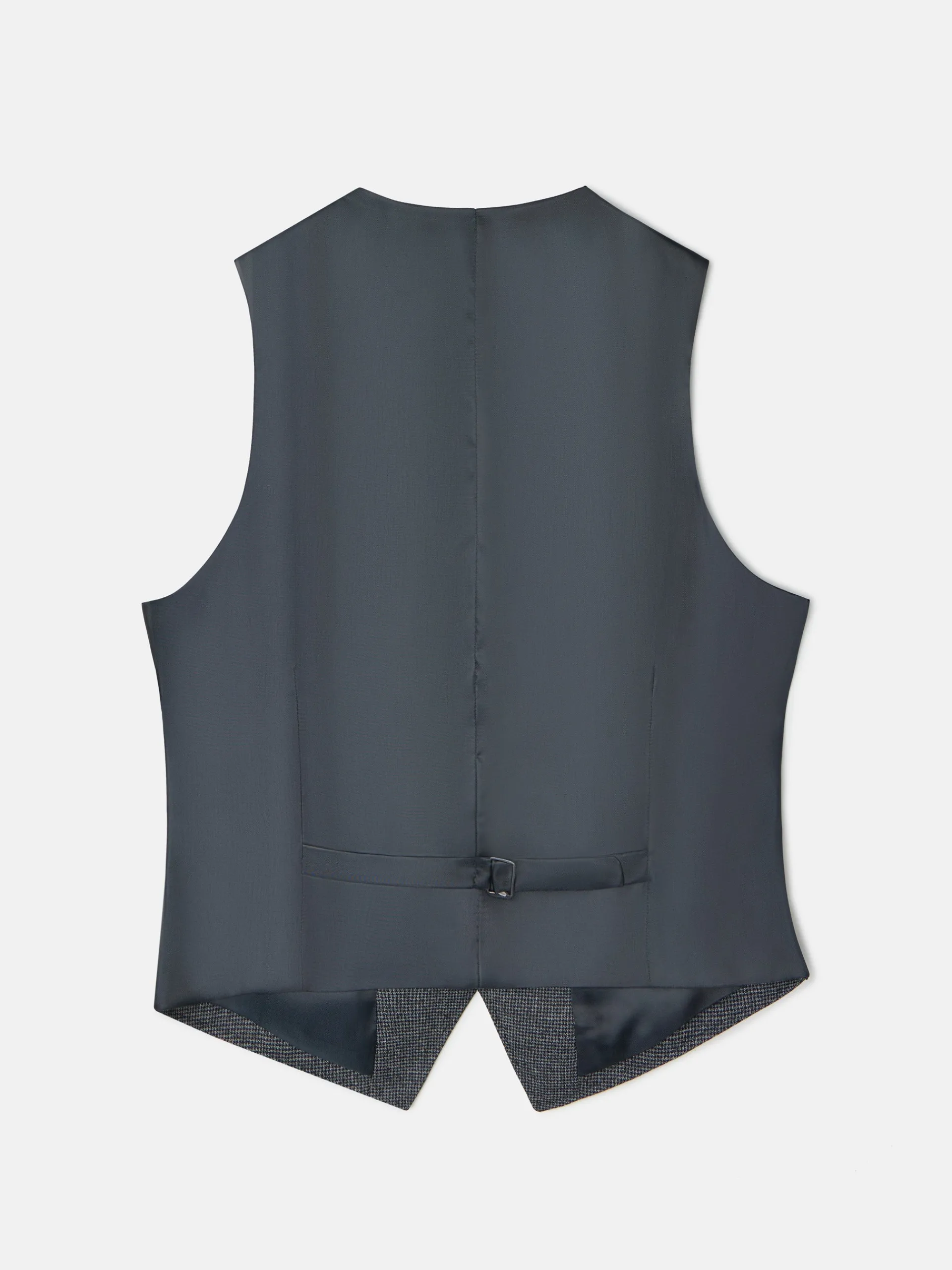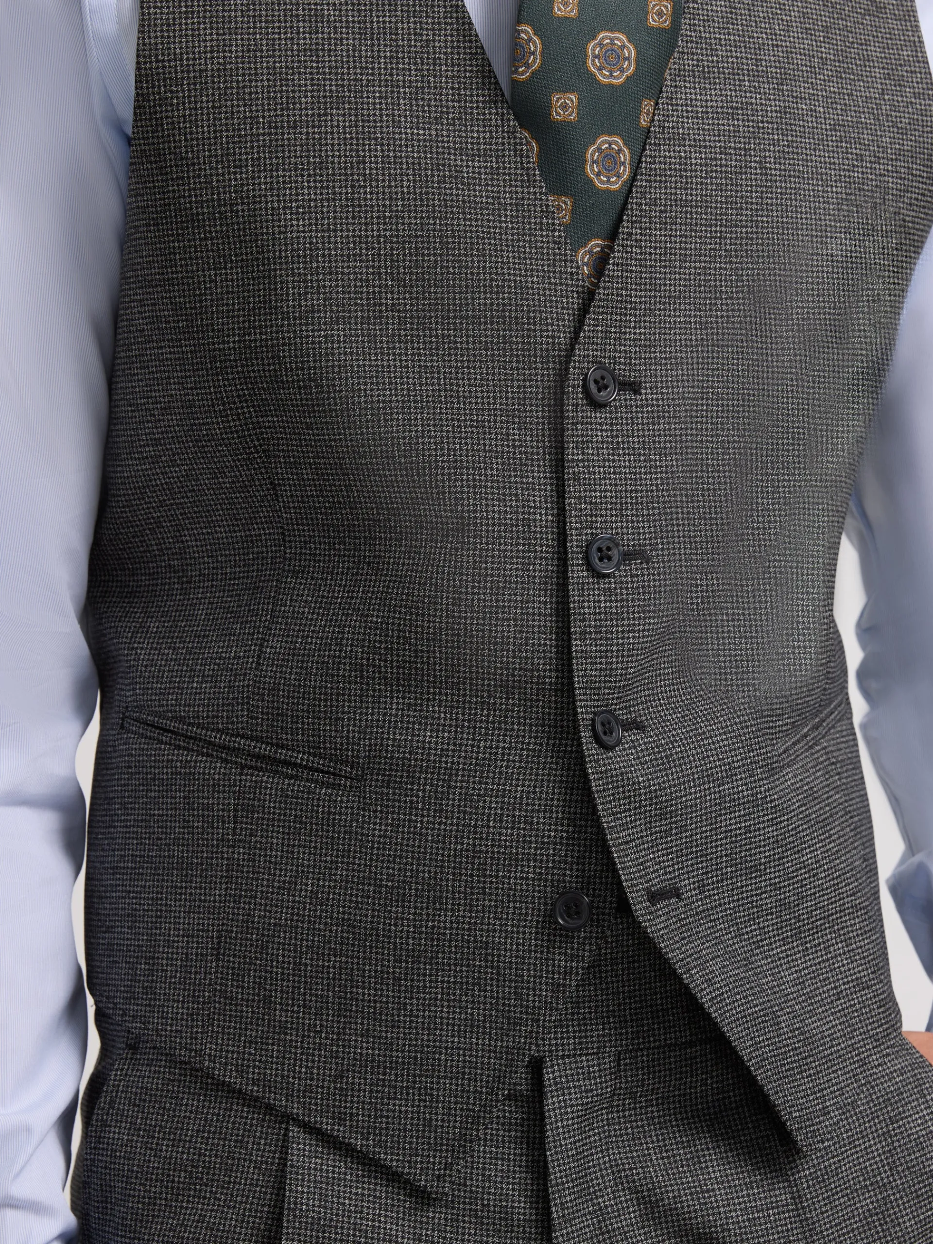 Chaleco de traje de pata de gallo confeccionado en 100% lana de corte Slim fit. Presenta cierre clásico recto con botones personalizados y bolsillos de vivo. Cuenta con forro personalizado al tono con ajustador trasero. Fabricado en Portugal.