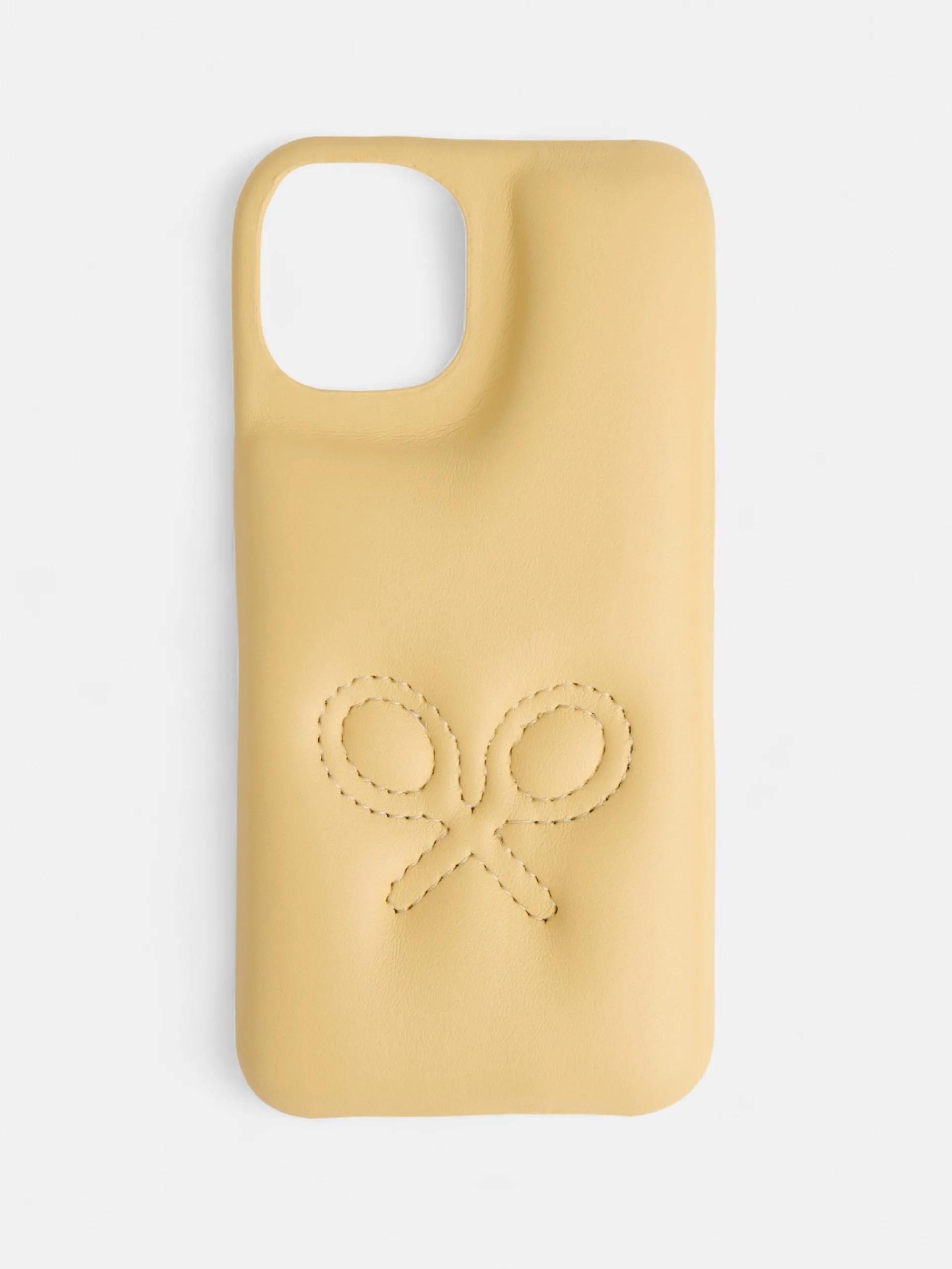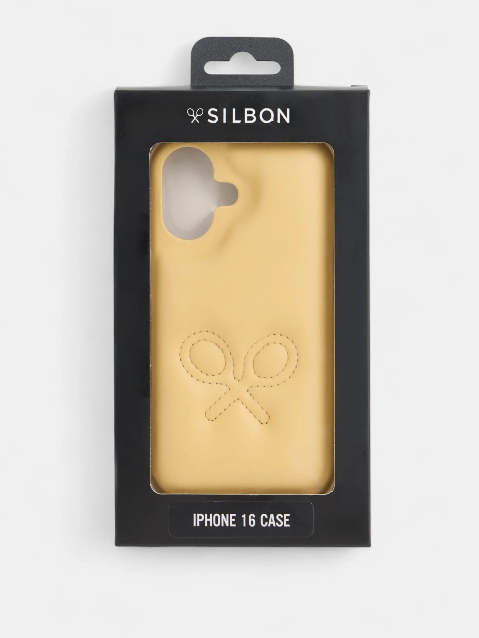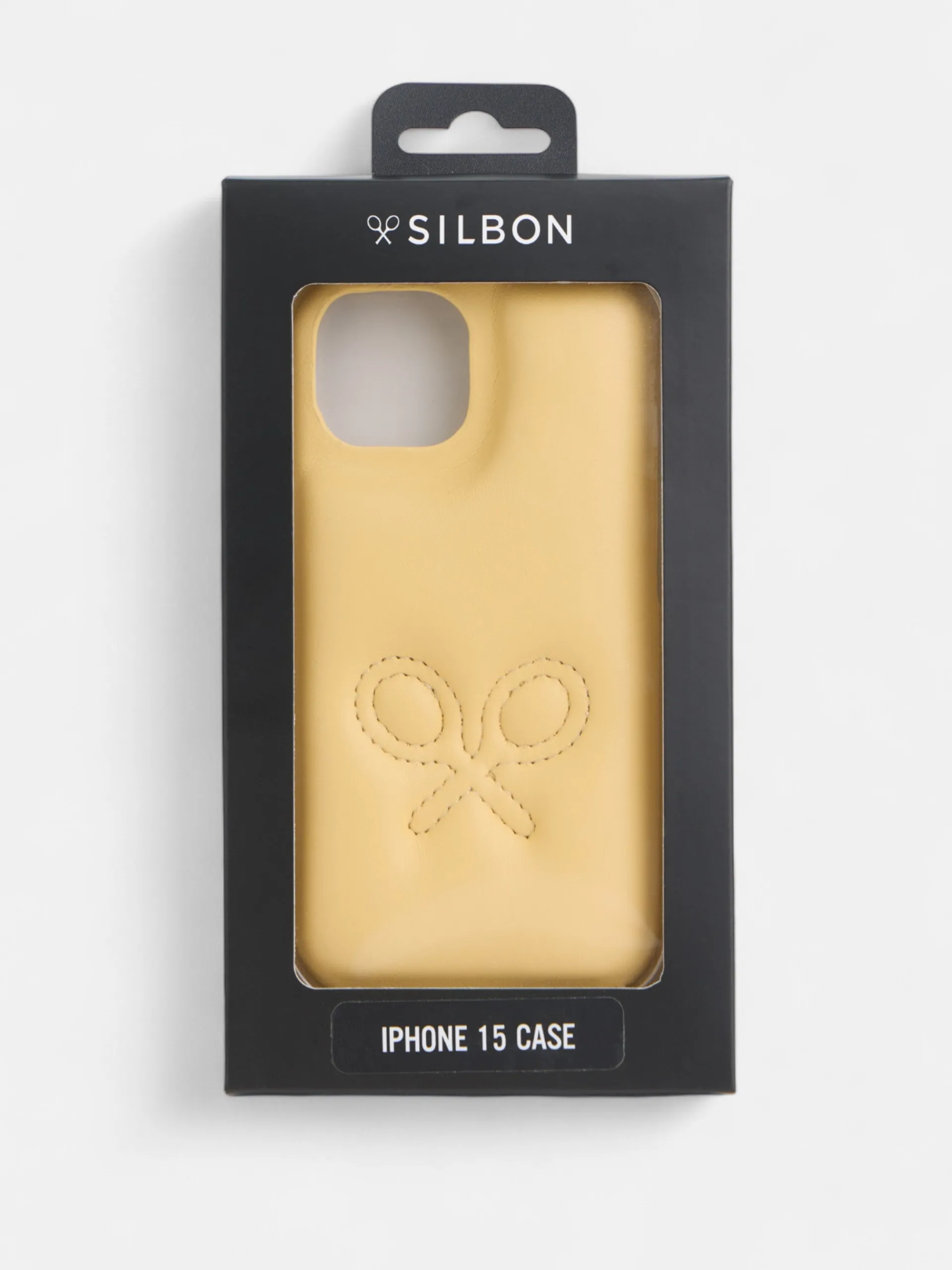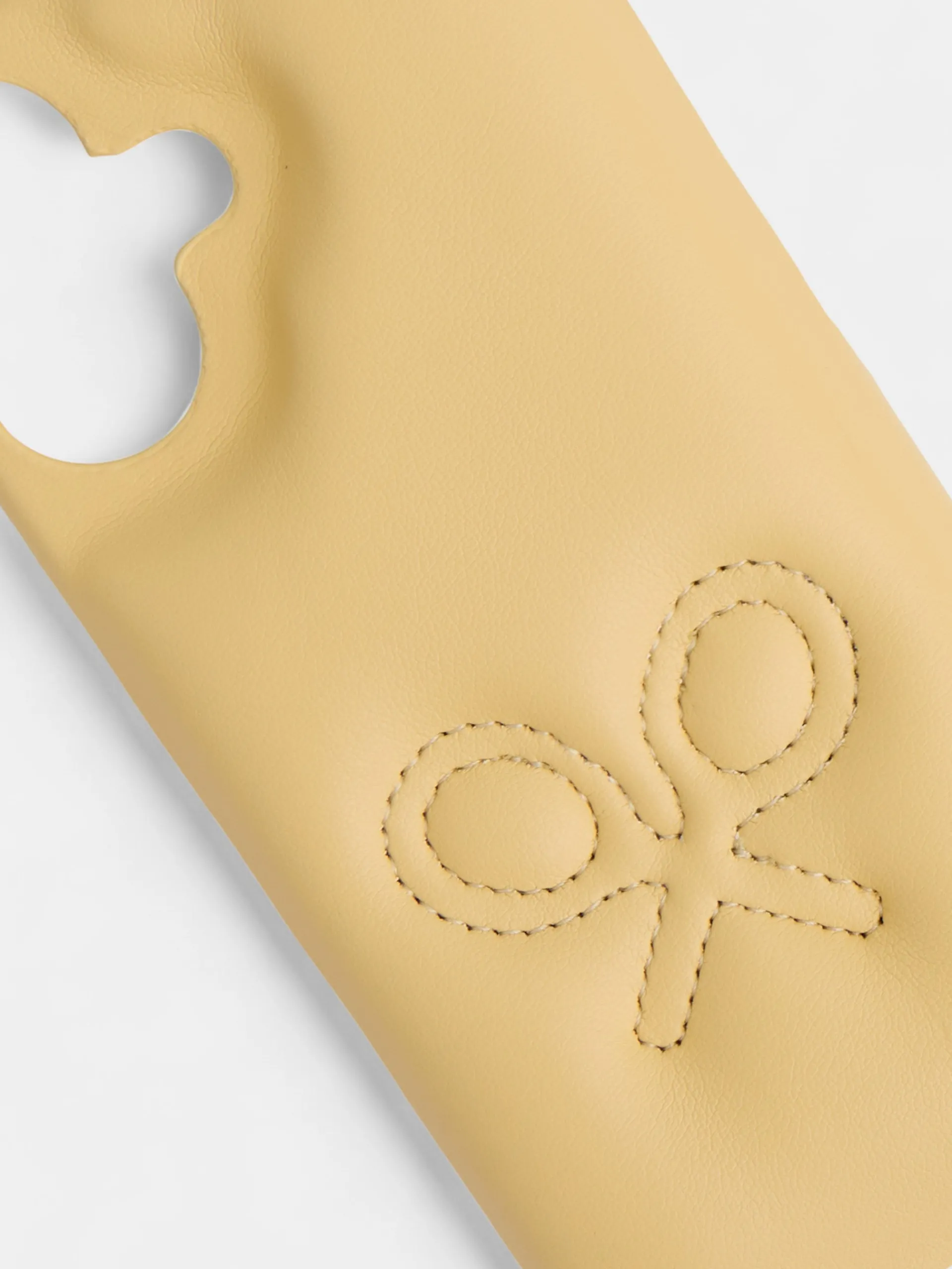 Funda para móvil de piel efecto acolchado en color amarillo con detalle de raqueta pespunteada en la parte trasera. Disponible para modelos Iphone 15 y Iphone 16.