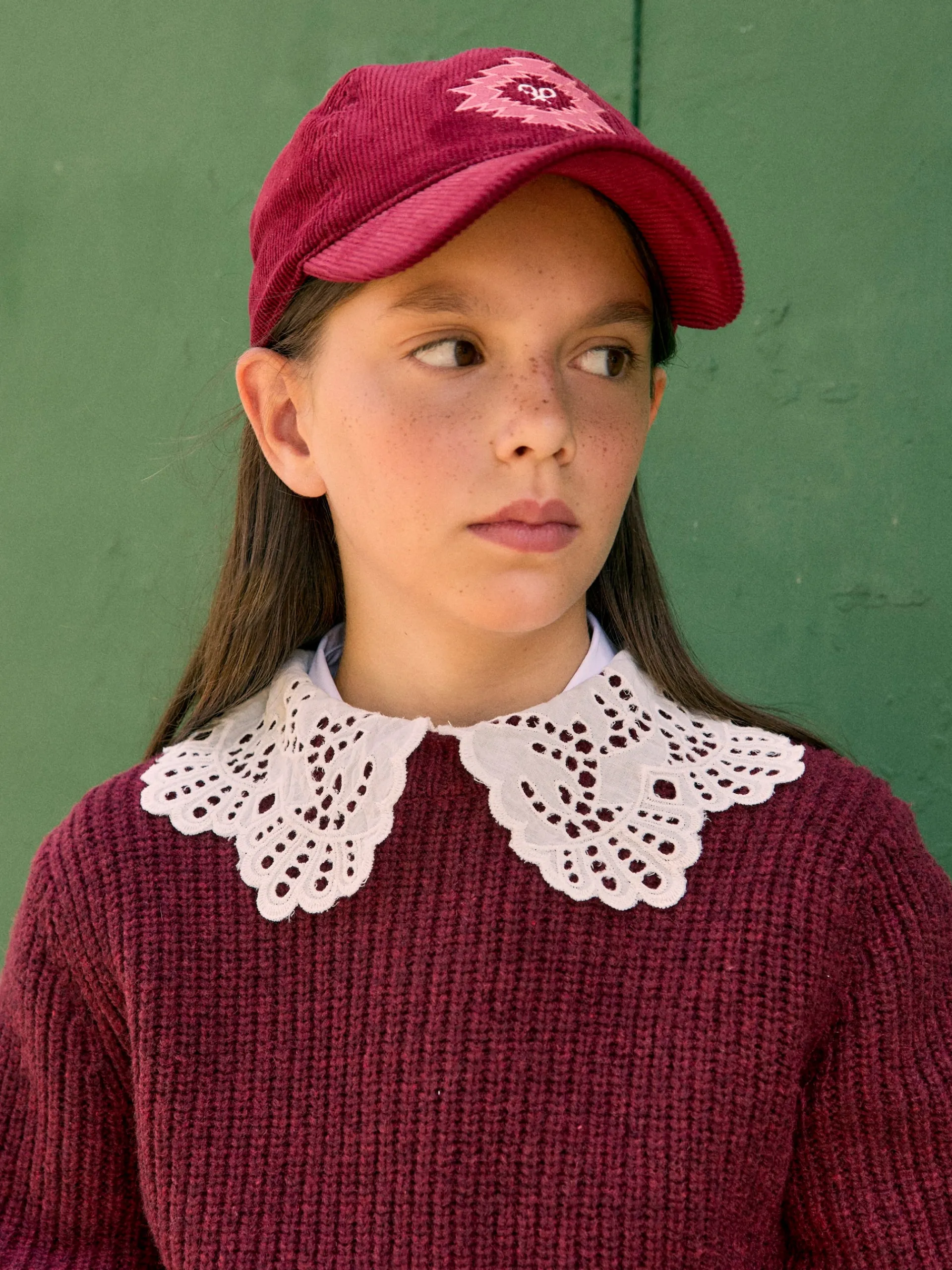 Gorra girl de pana color burdeos confeccionada en 100% algodón. Cuenta con bordado frontal de motivo étnico en color rosa.