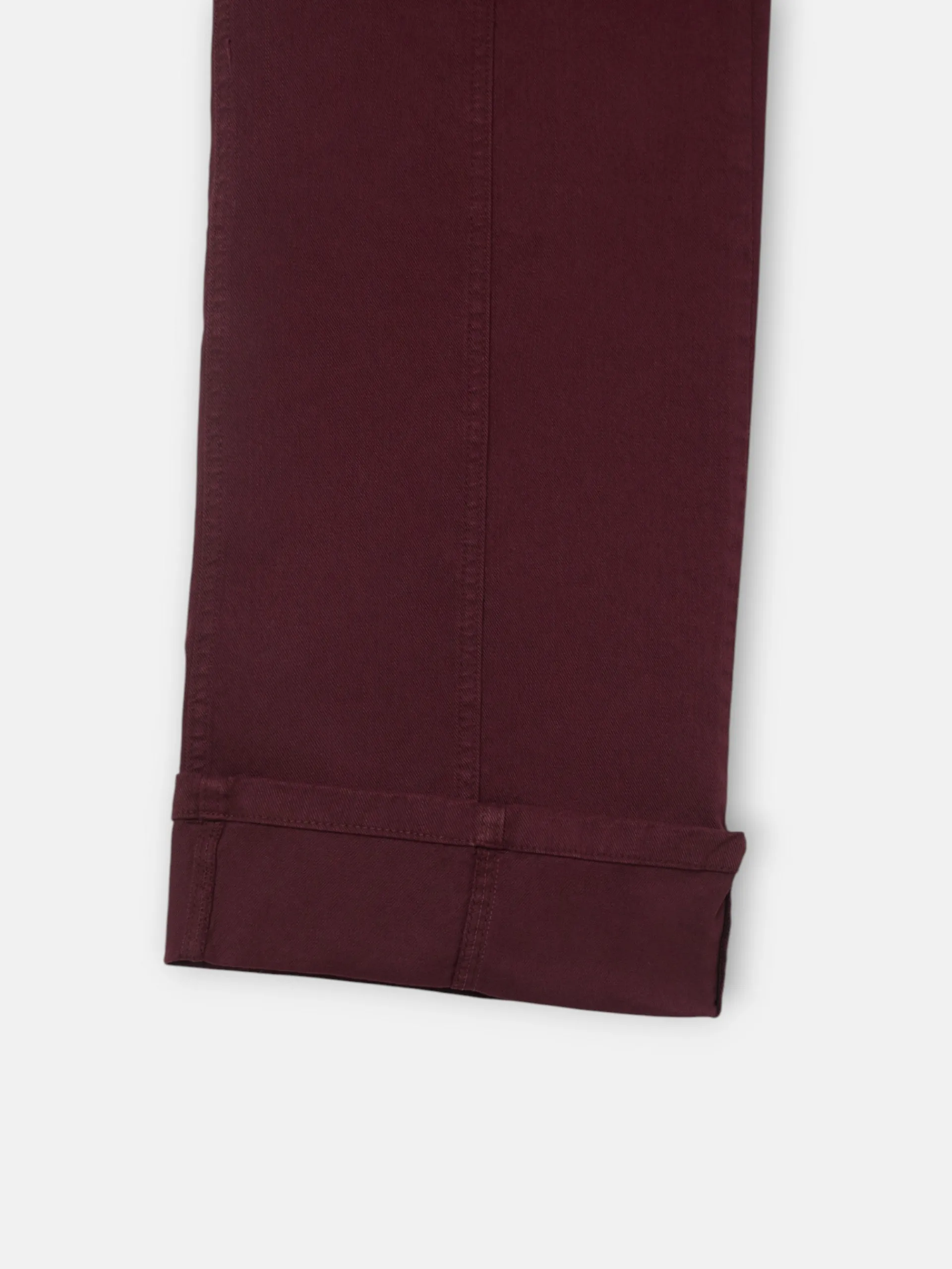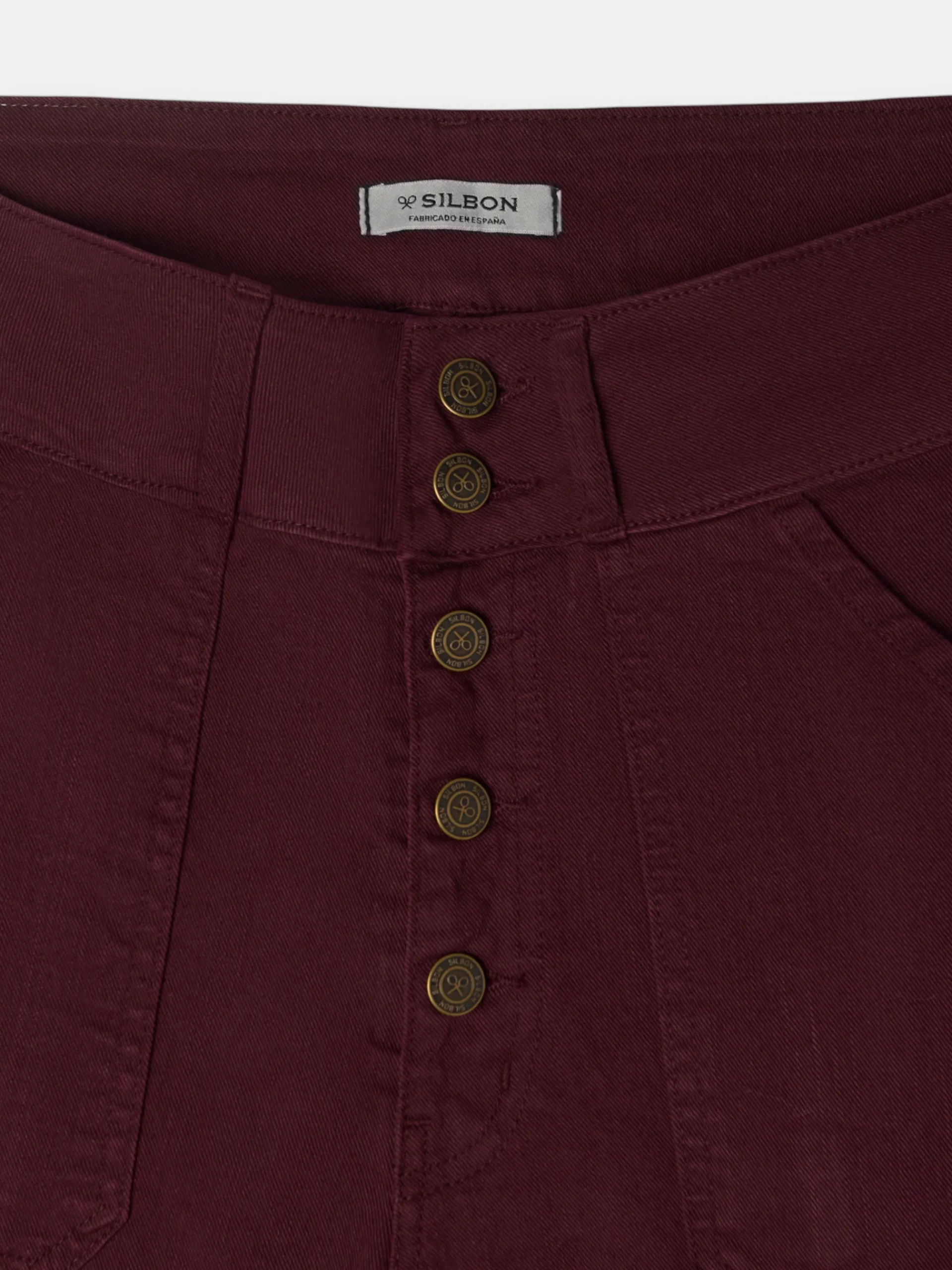 Pantalón denim burdeos confeccionado en mezcla de algodón. Cuenta con cierre de botones tejaneros vistos y bolsillos laterales estilo carpintero. Presenta detalle de costura en linea de planchado y bajo con dobladillo. Fabricado en España.