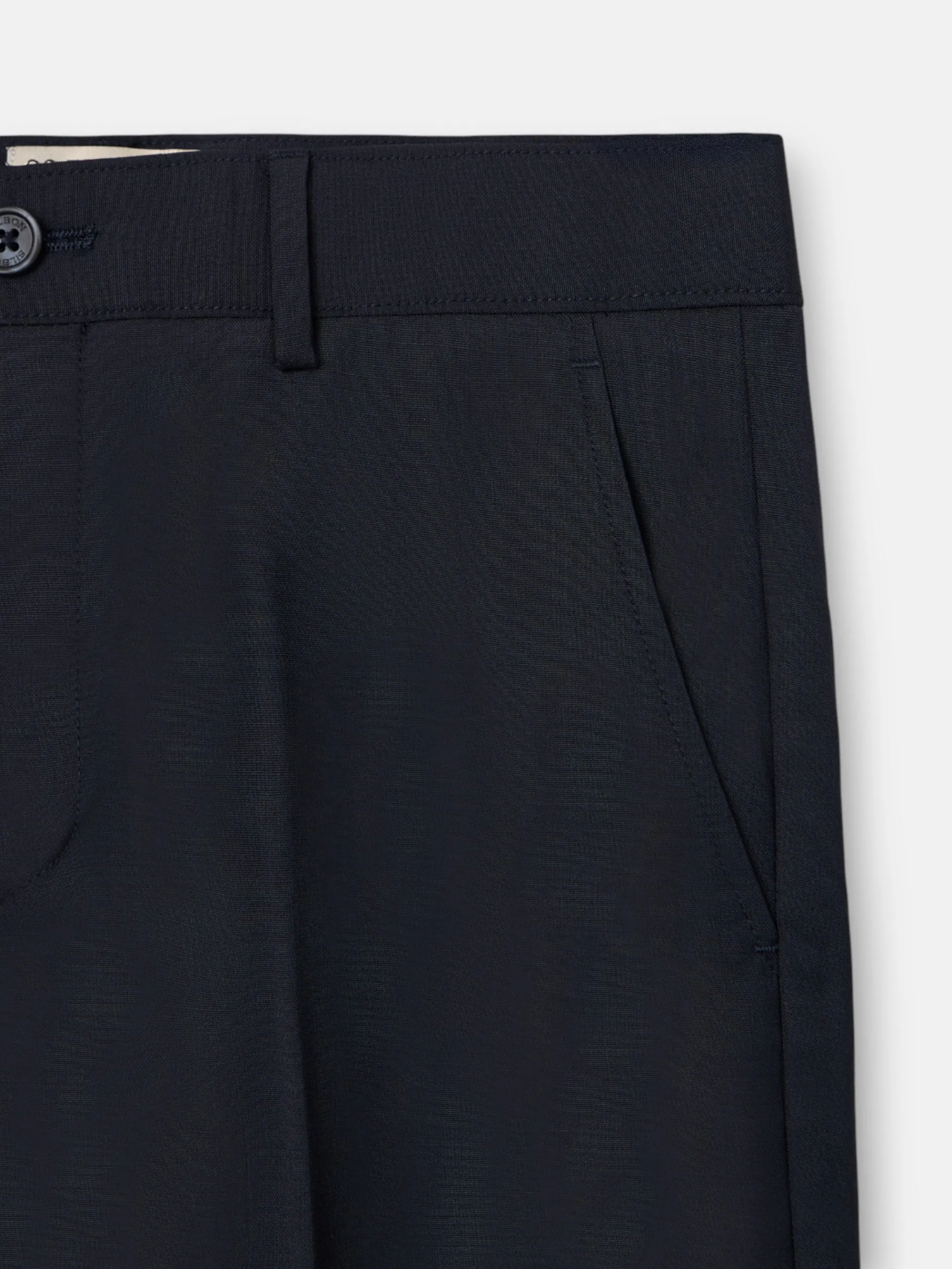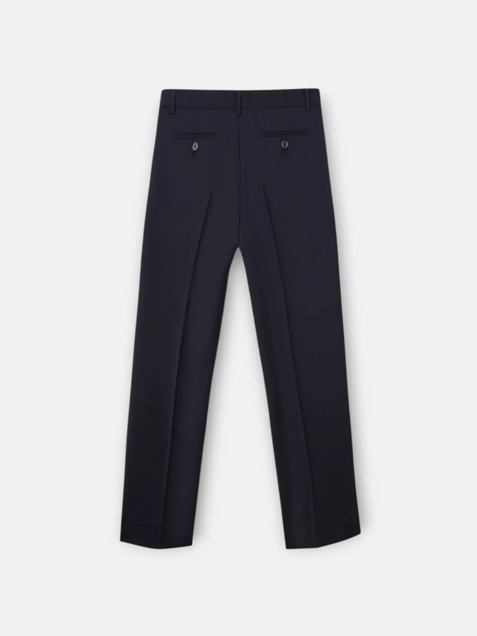 Pantalón de traje de kids en color azul marino confeccionado en mezcla de lana con elastano para aportar libertad de movimiento. Cuenta con cierre de botón y cremallera. Presenta detalle de de logo de raquetas bordadas al tono al tono en la parte trasera.