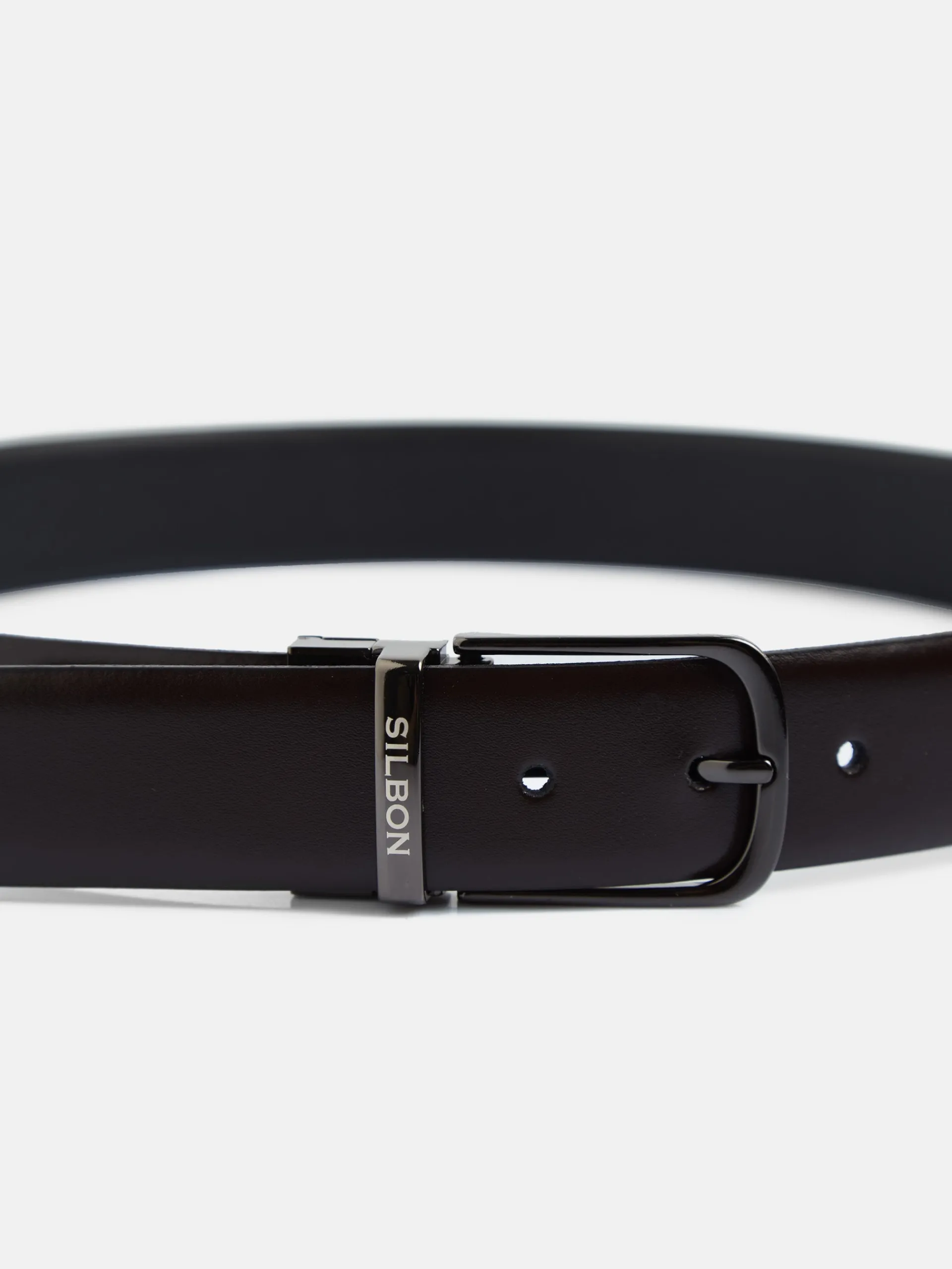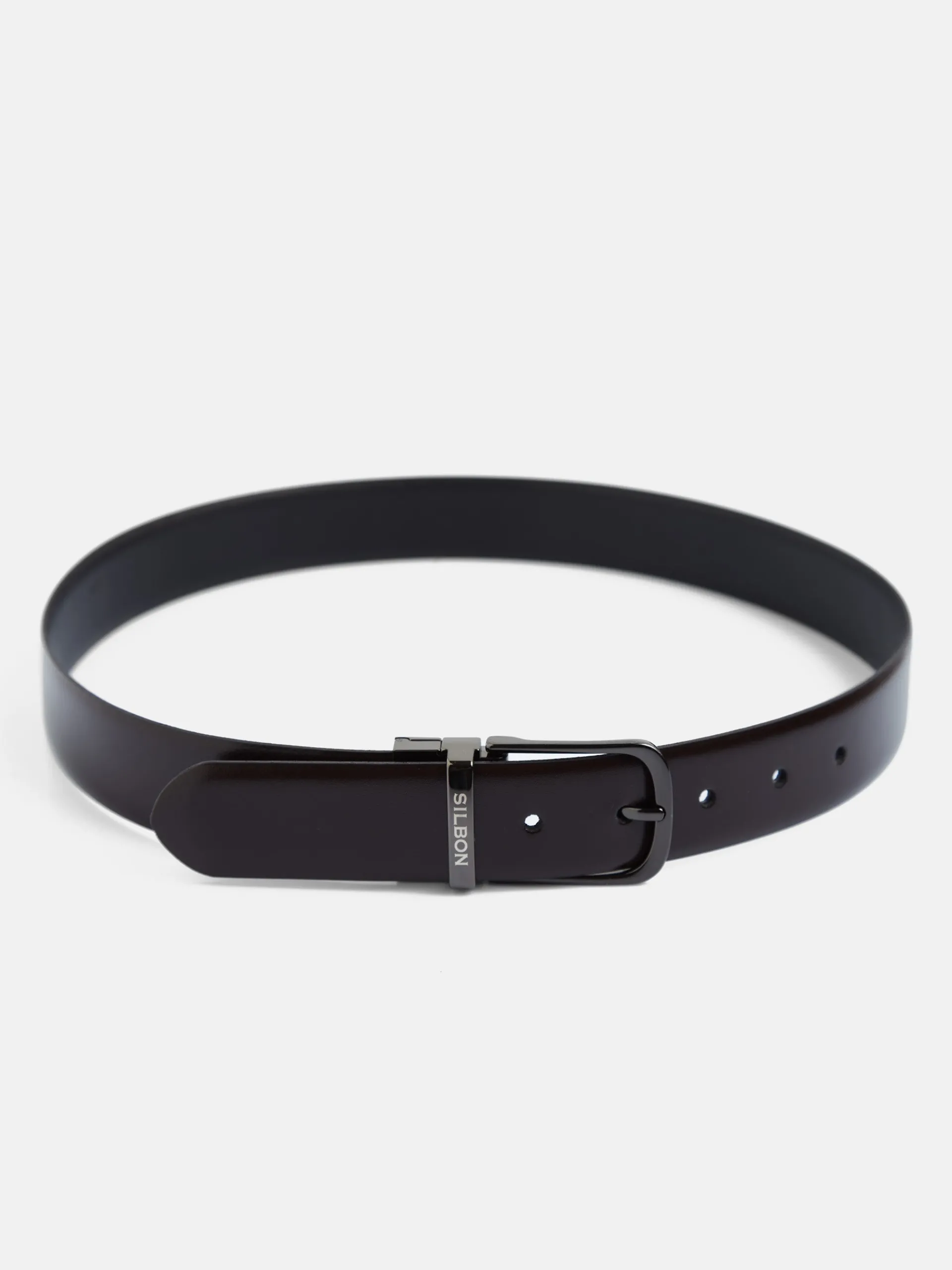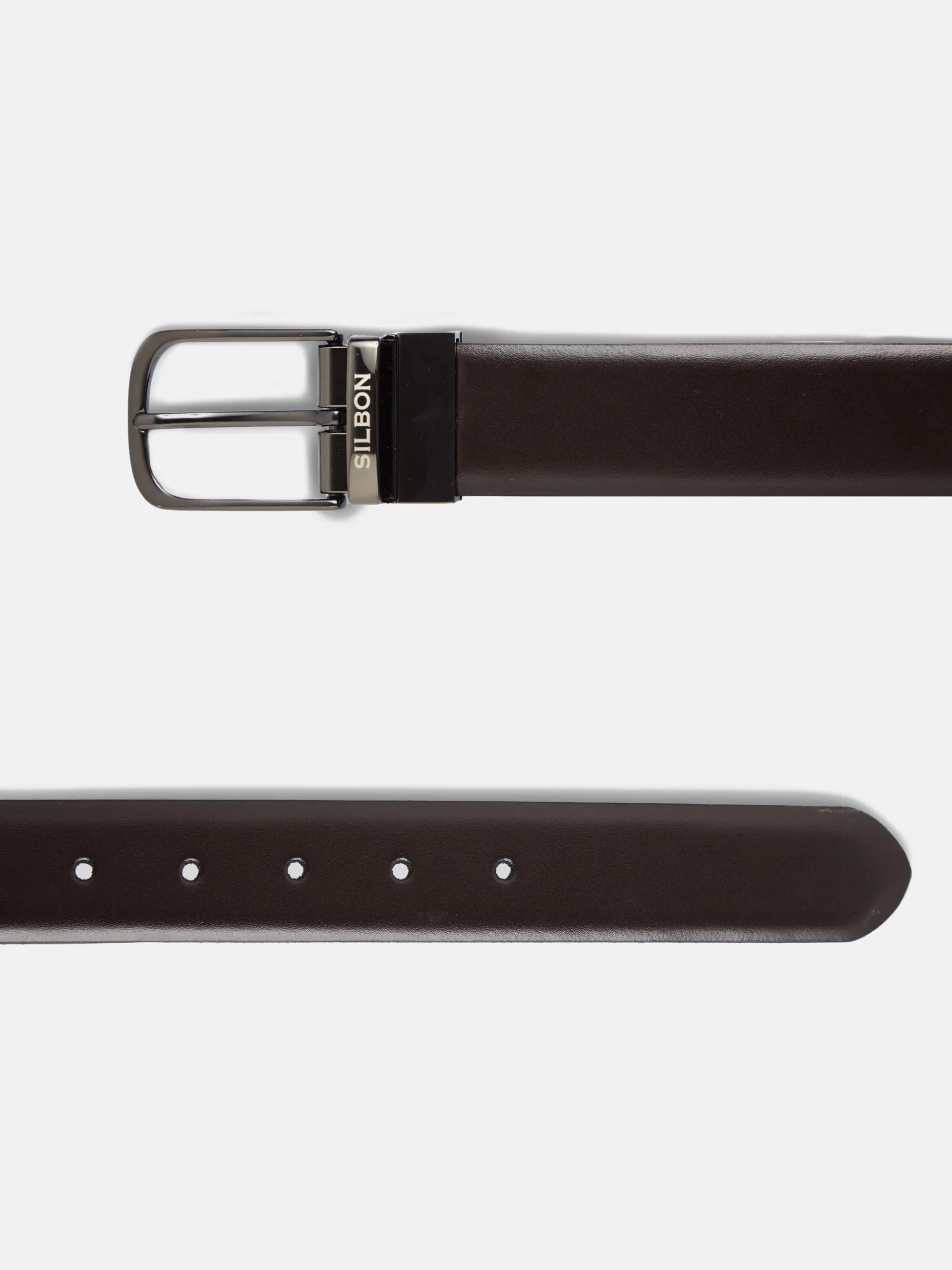 Cinturón de piel vacuno reversible, por un lado marrón con acabado suave y por el otro negro con textura rayada. Presenta cierre giratorio metálico plateado con grabado Silbon en el pasador. Fabricado en España.