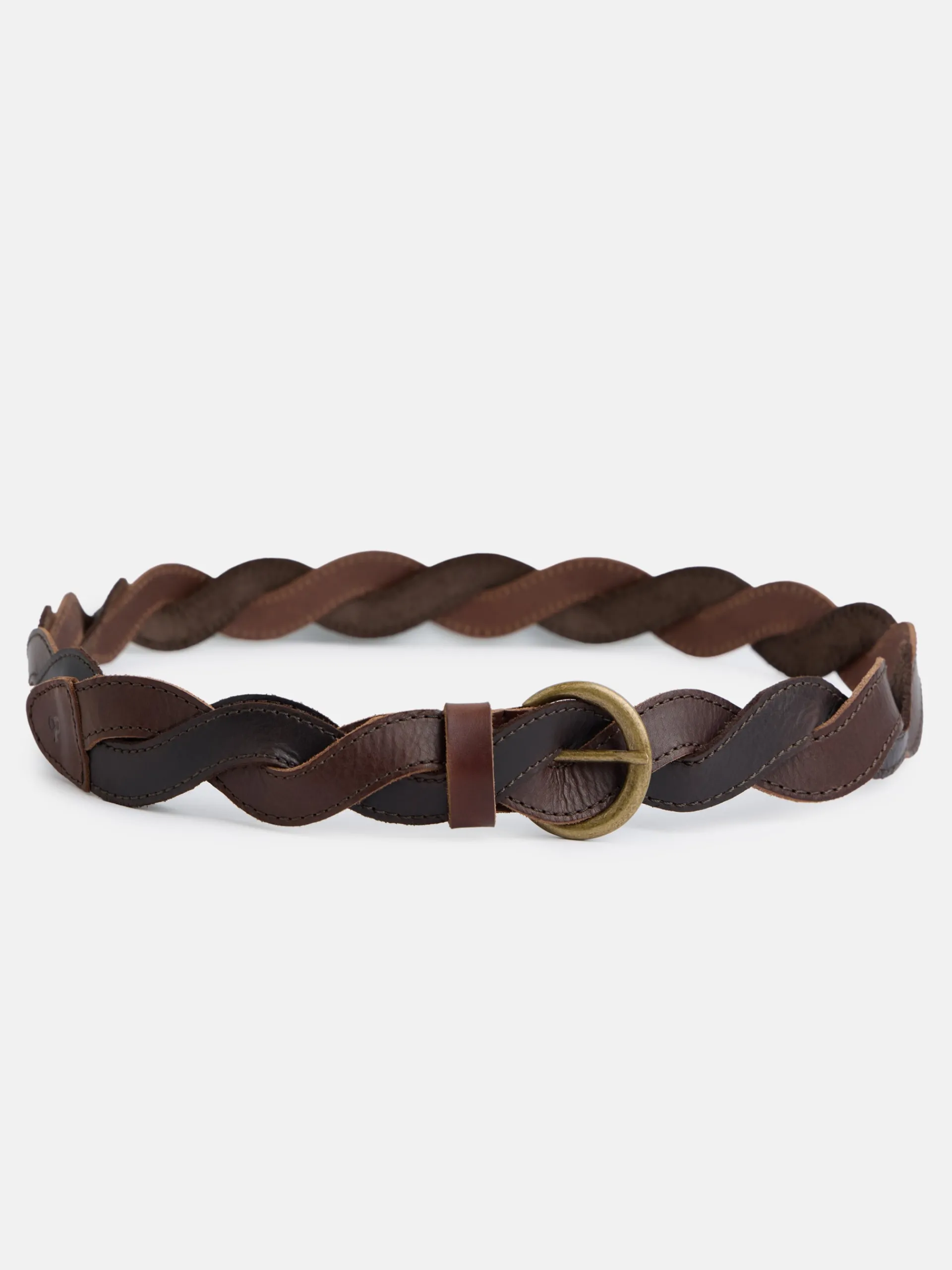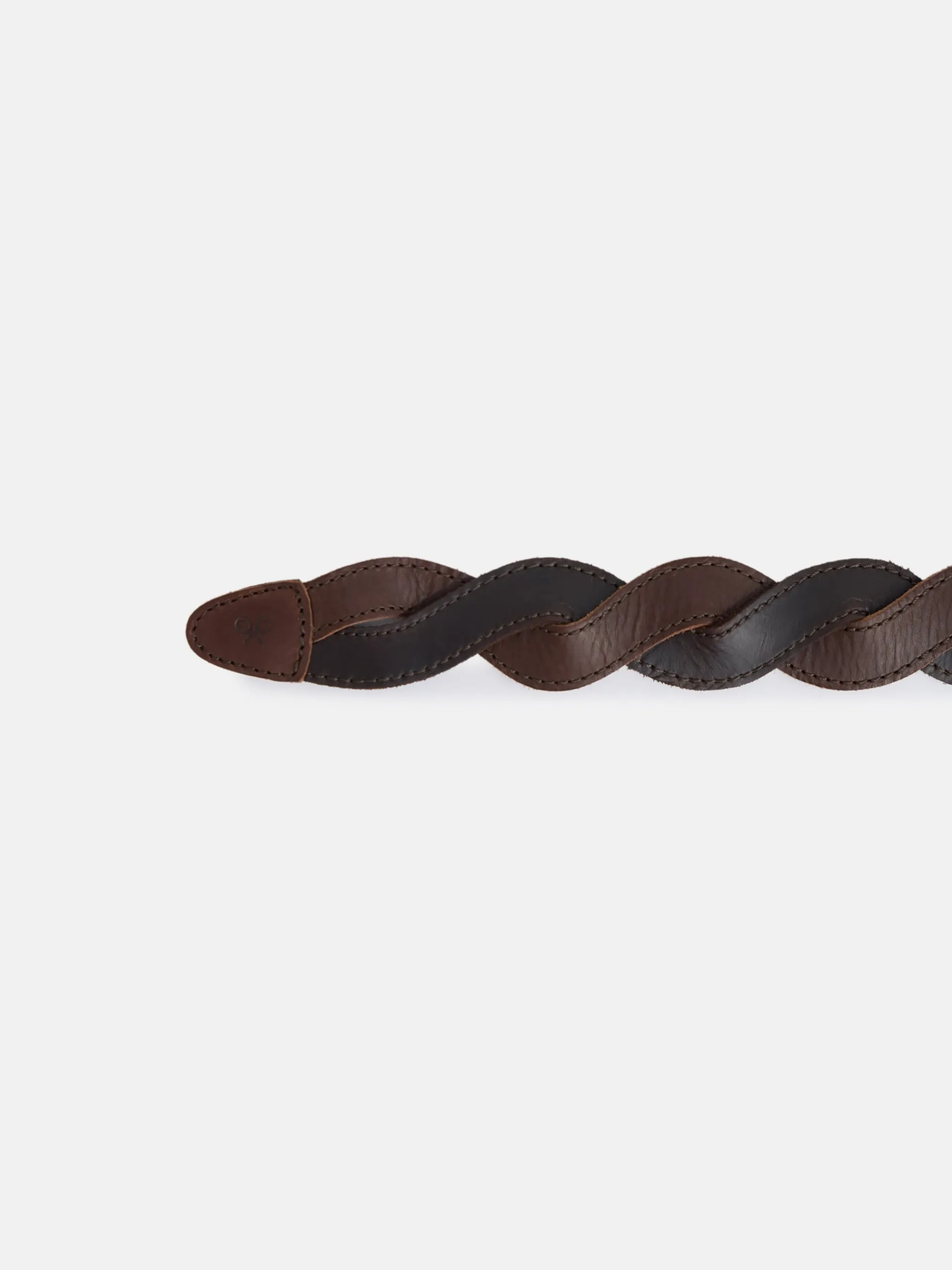 Cinturón trenzado bicolor marrón confeccionado en 100% piel. Presenta cierre con hebilla metálica. Cuenta con detalle de raquetas grabadas en el extremo.