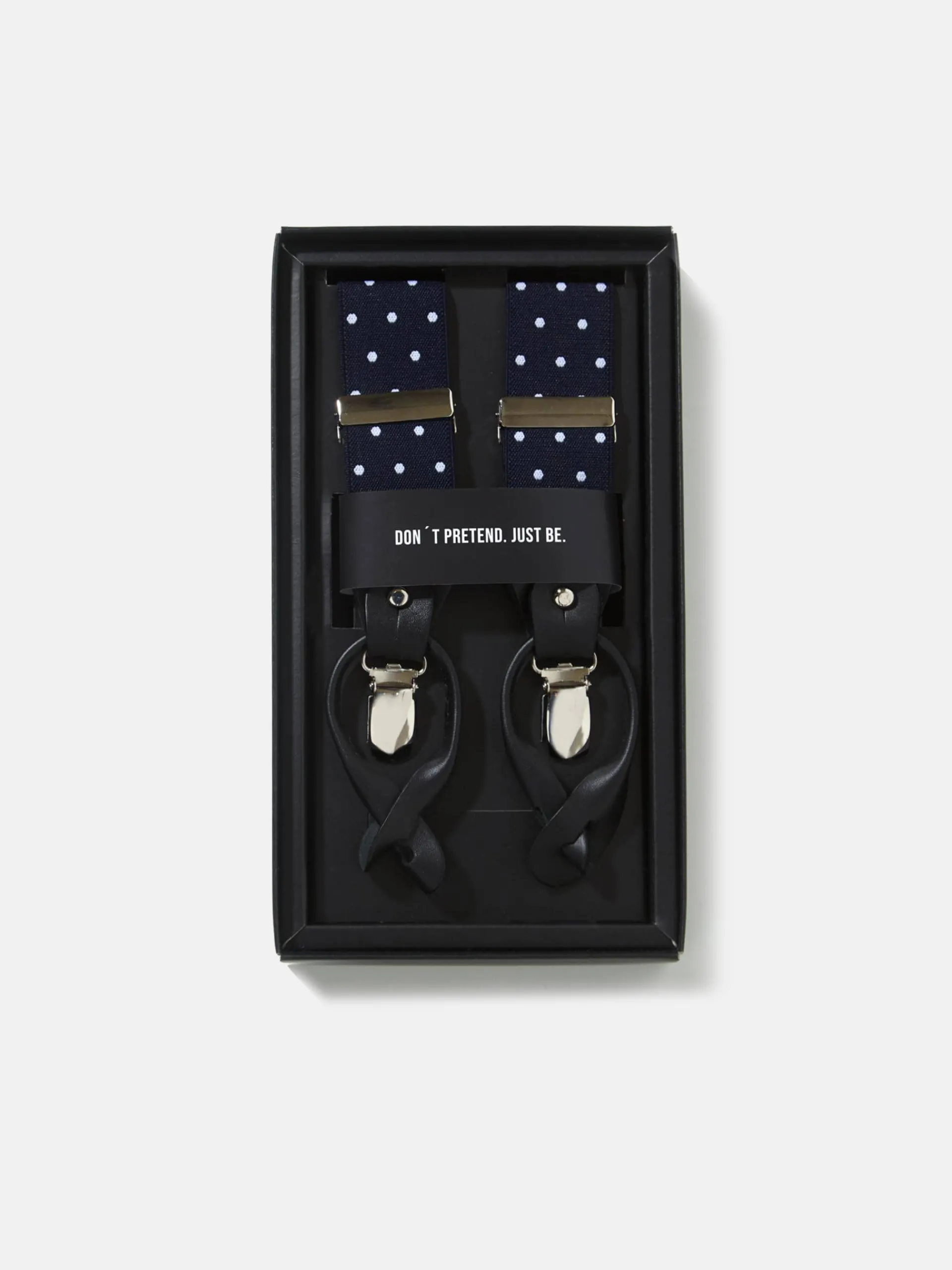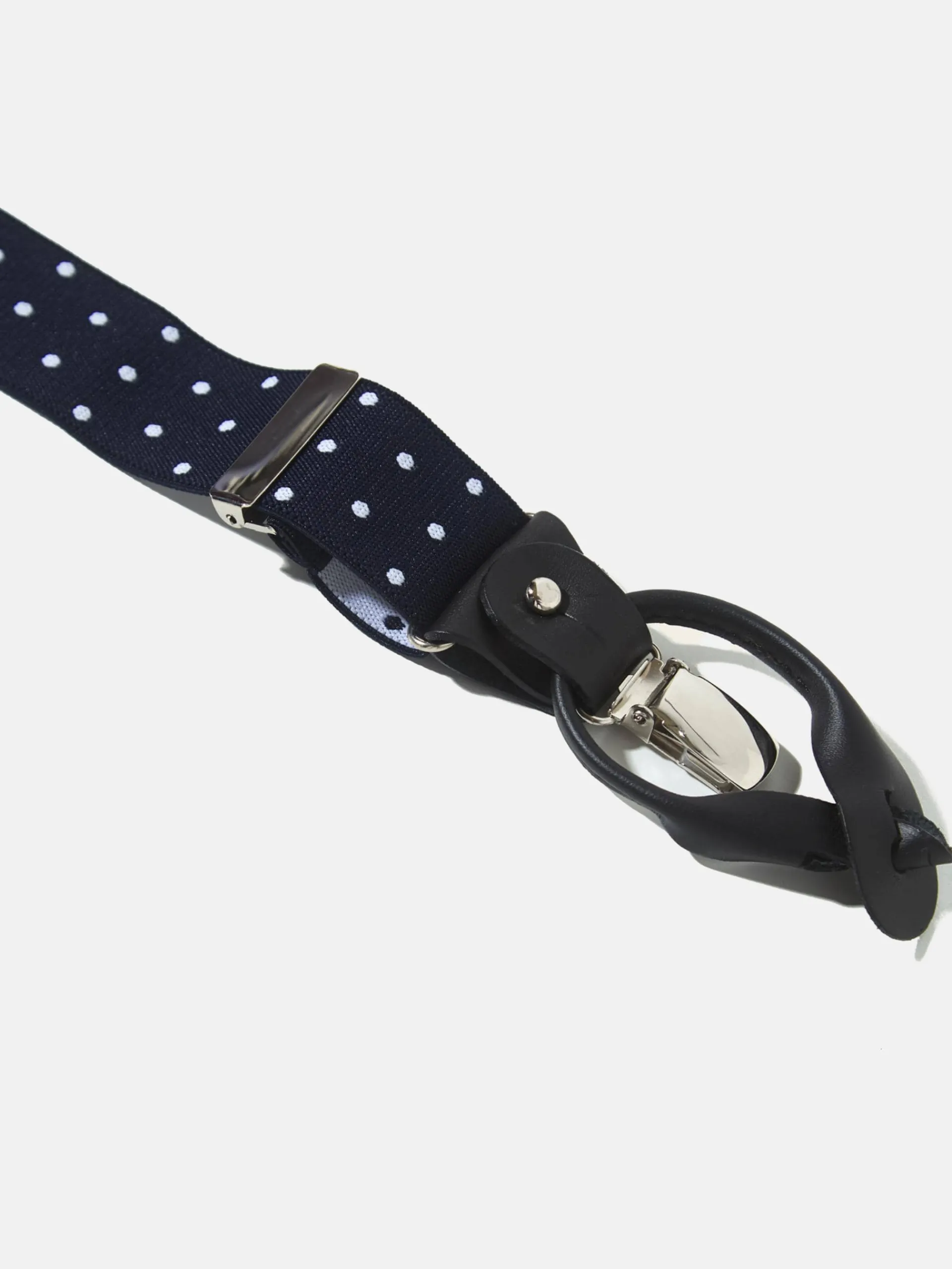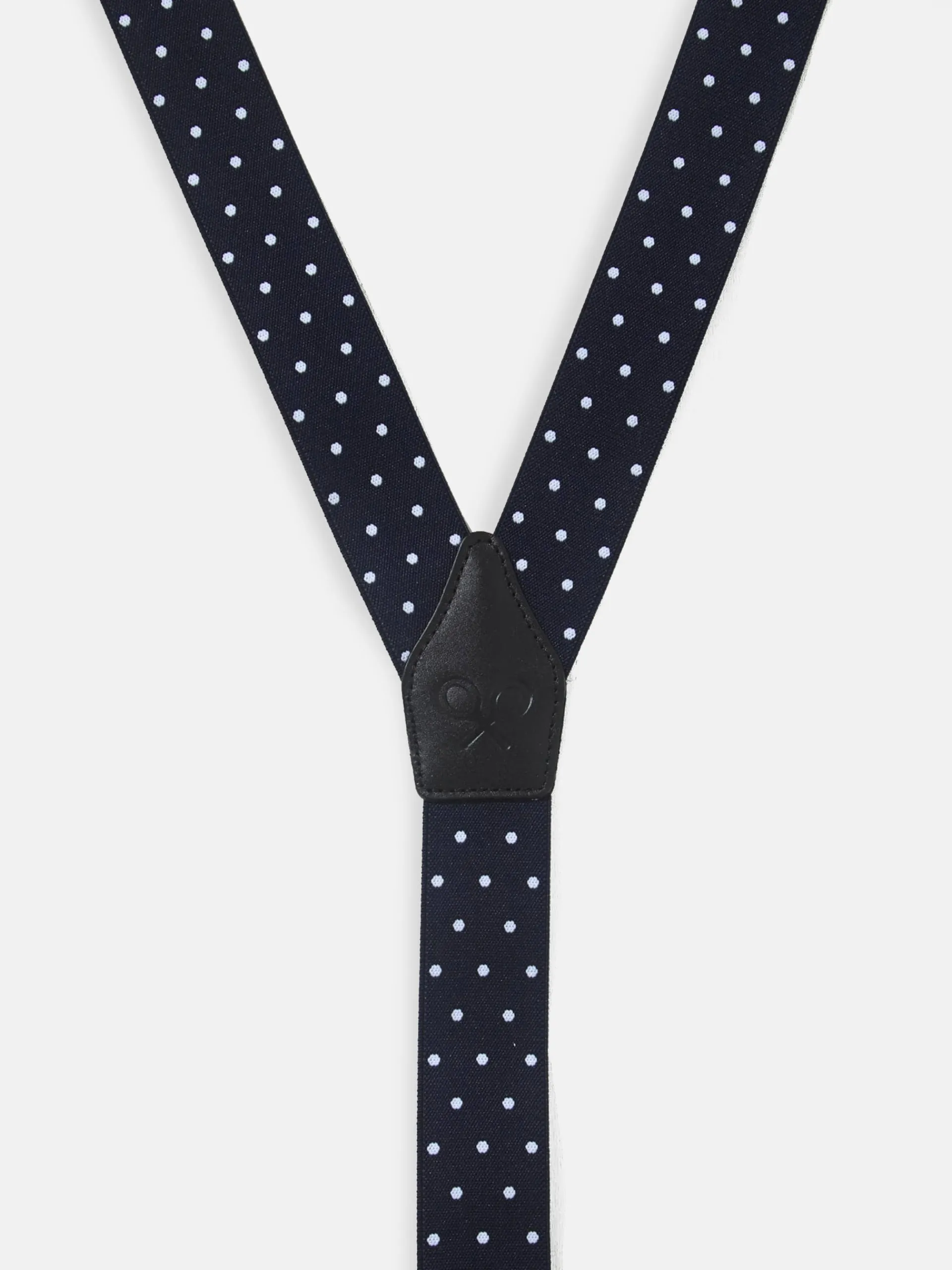 Tirantes elásticos y ajustables azul marino con estampado de lunares blancos. Este tirante cuenta con detalles en piel vacuno azul marino con logo grabado a fuego. Incluye doble sujeción latiguillo y pinzas metálicas. Fabricado en España.