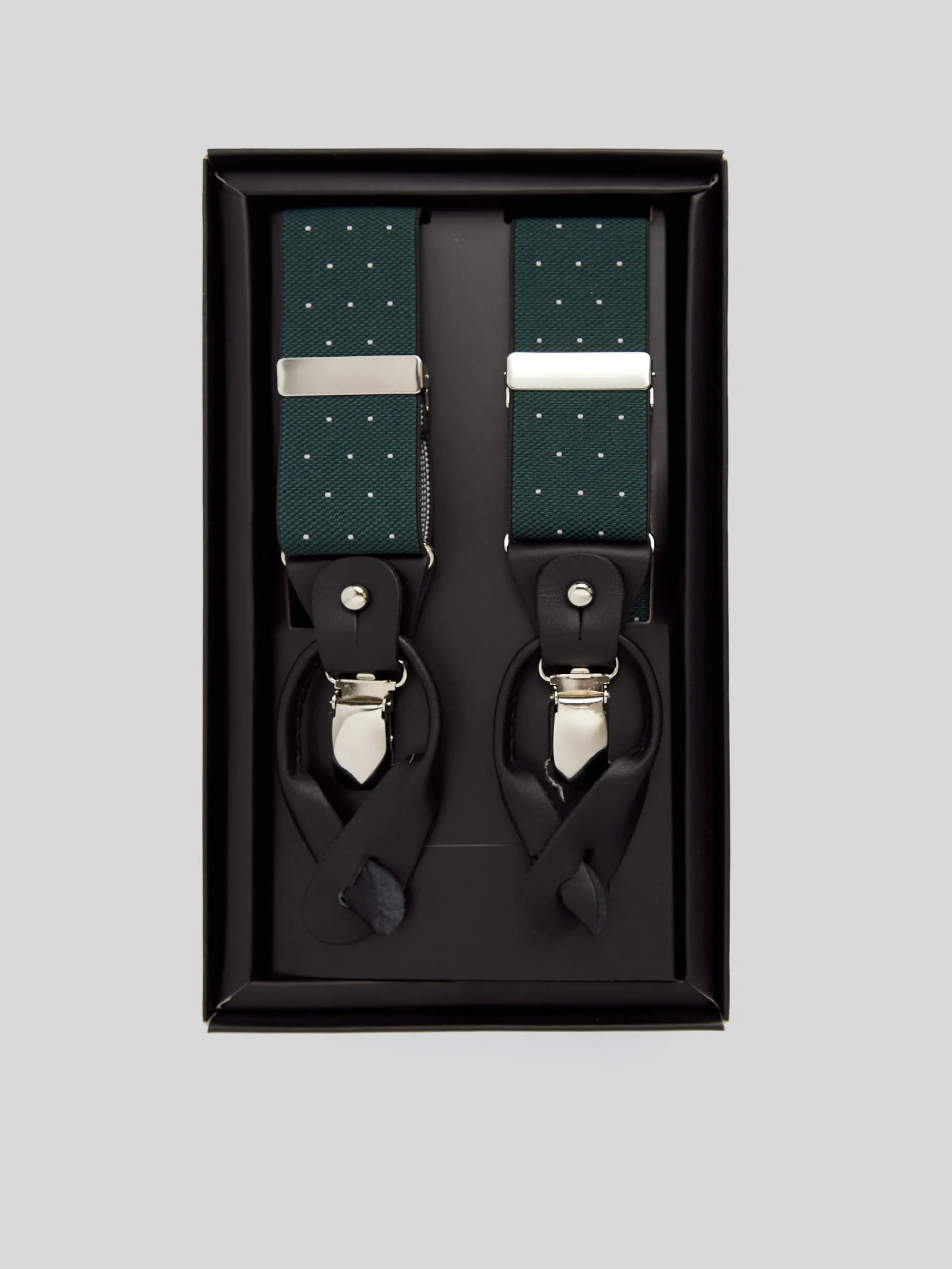 Tirantes elásticos y ajustables en color burdeos con puntos. Este tirante cuenta con detalles en piel vacuno de color negro con logo grabado a fuego. Incluye doble sujeción latiguillo y pinzas metálicas. Fabricado en España.