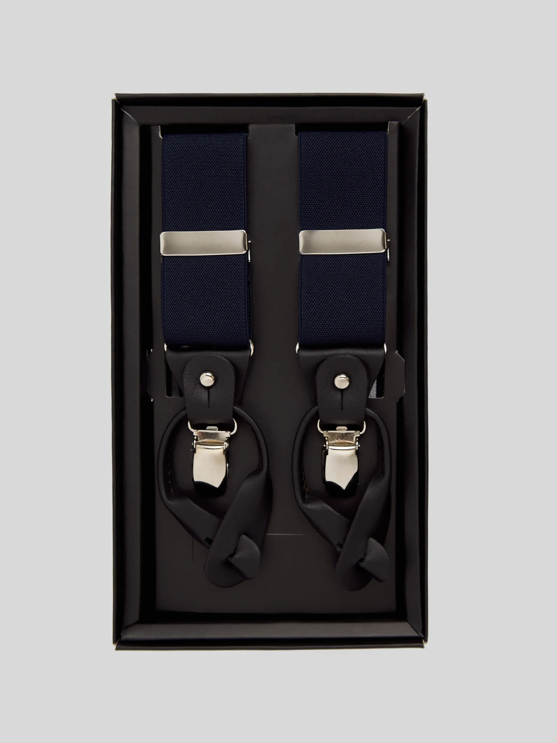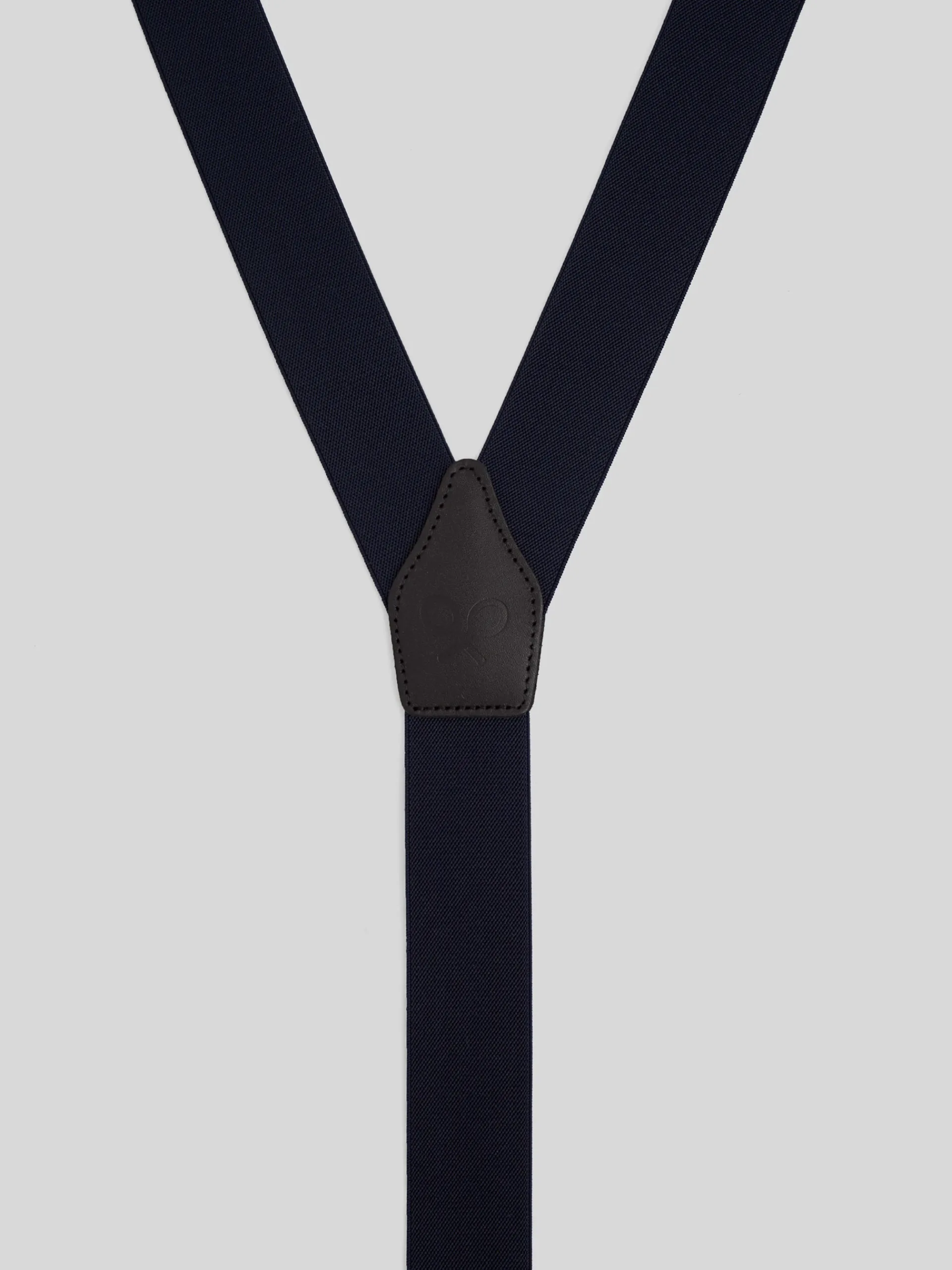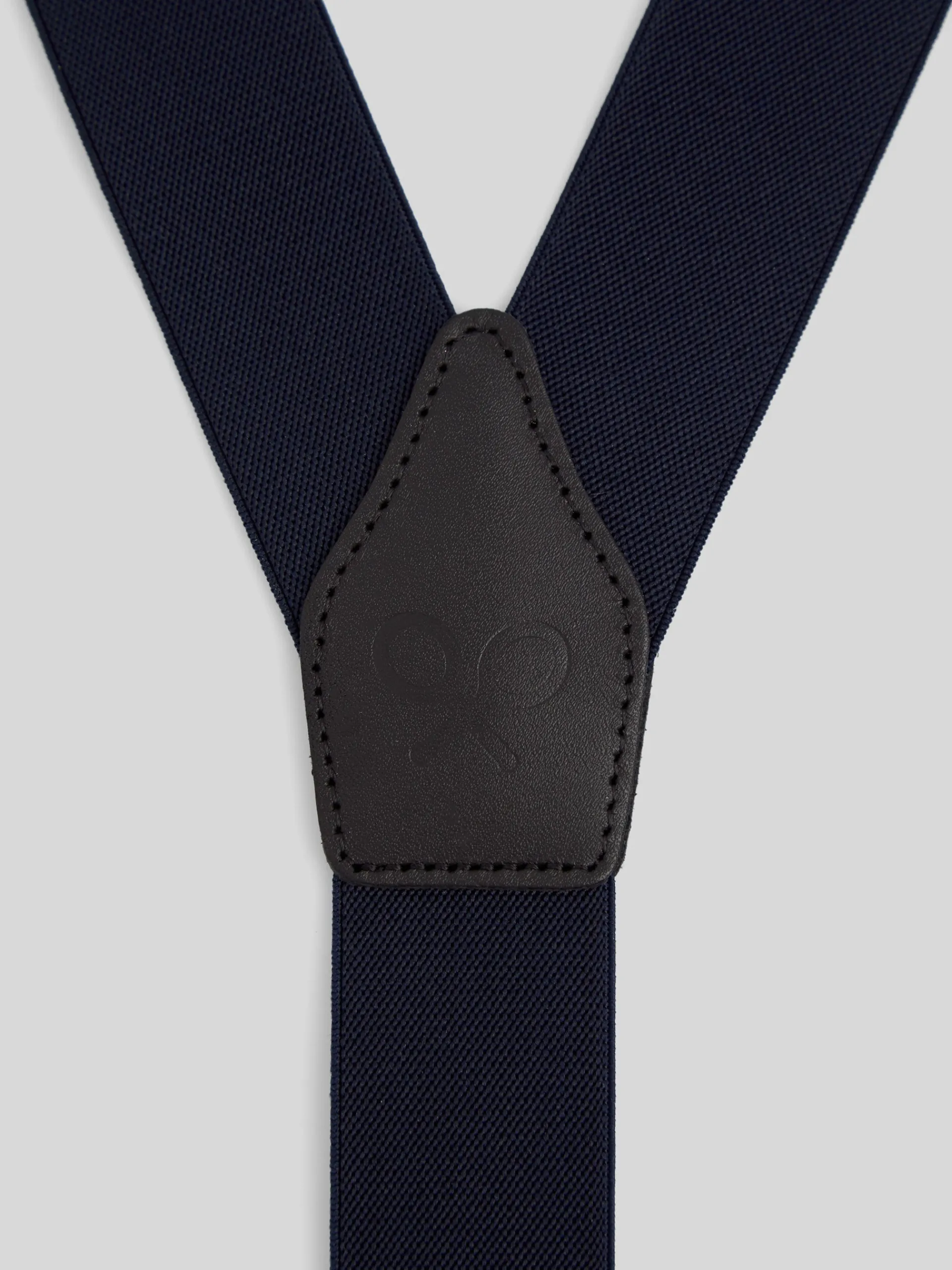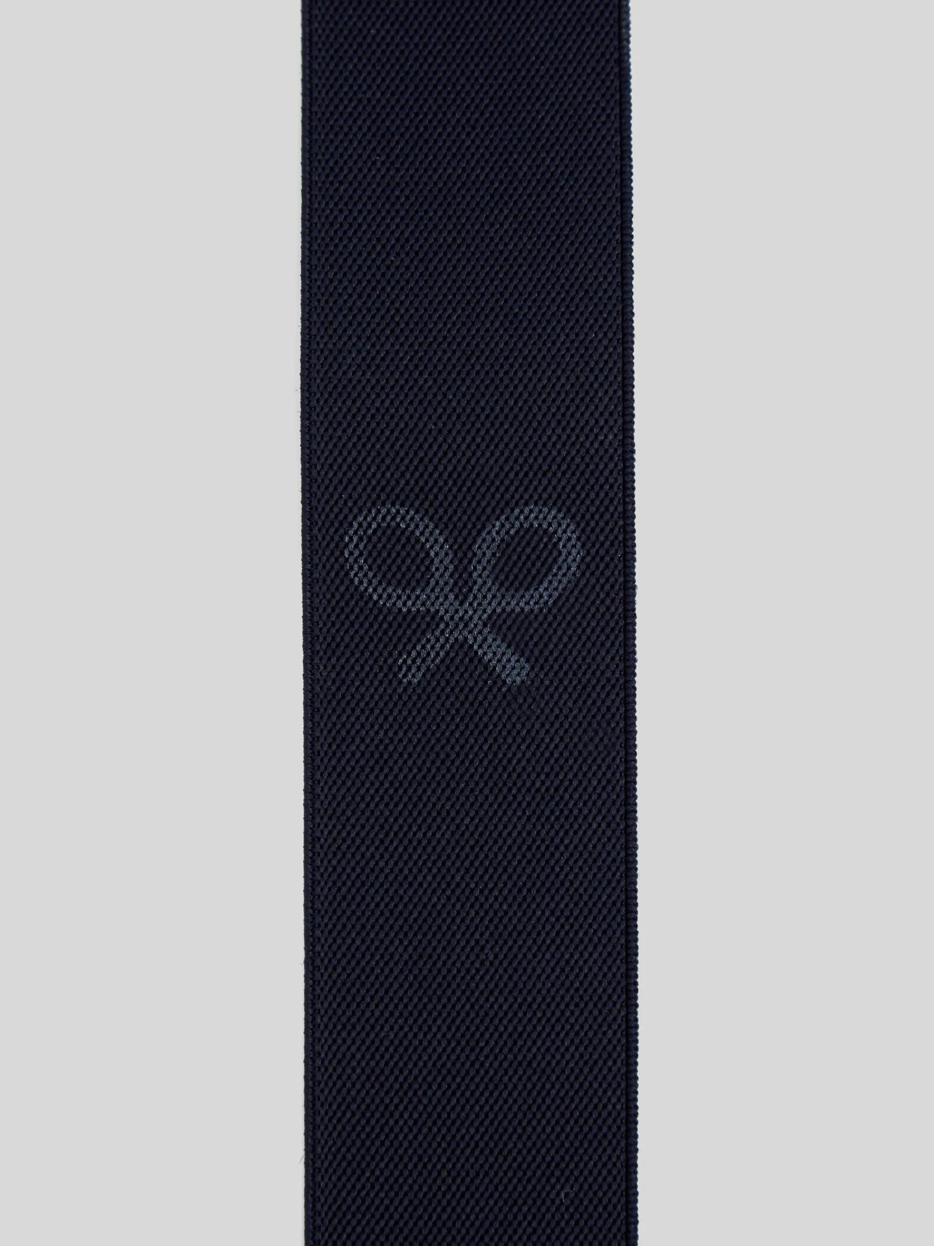 Tirantes elásticos y ajustables en color azul marino. Este tirante cuenta con detalles en piel vacuno de color negro con logo grabado a fuego. Cuenta con detalle de print de raquetas a contraste. Incluye doble sujeción latiguillo y pinzas metálicas. Fabricado en España.
