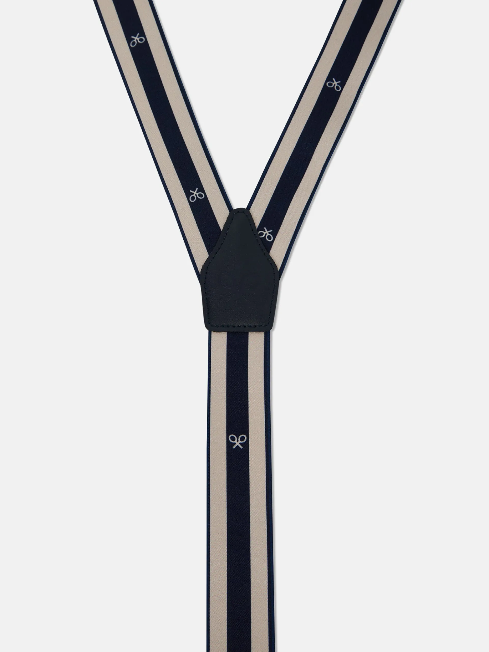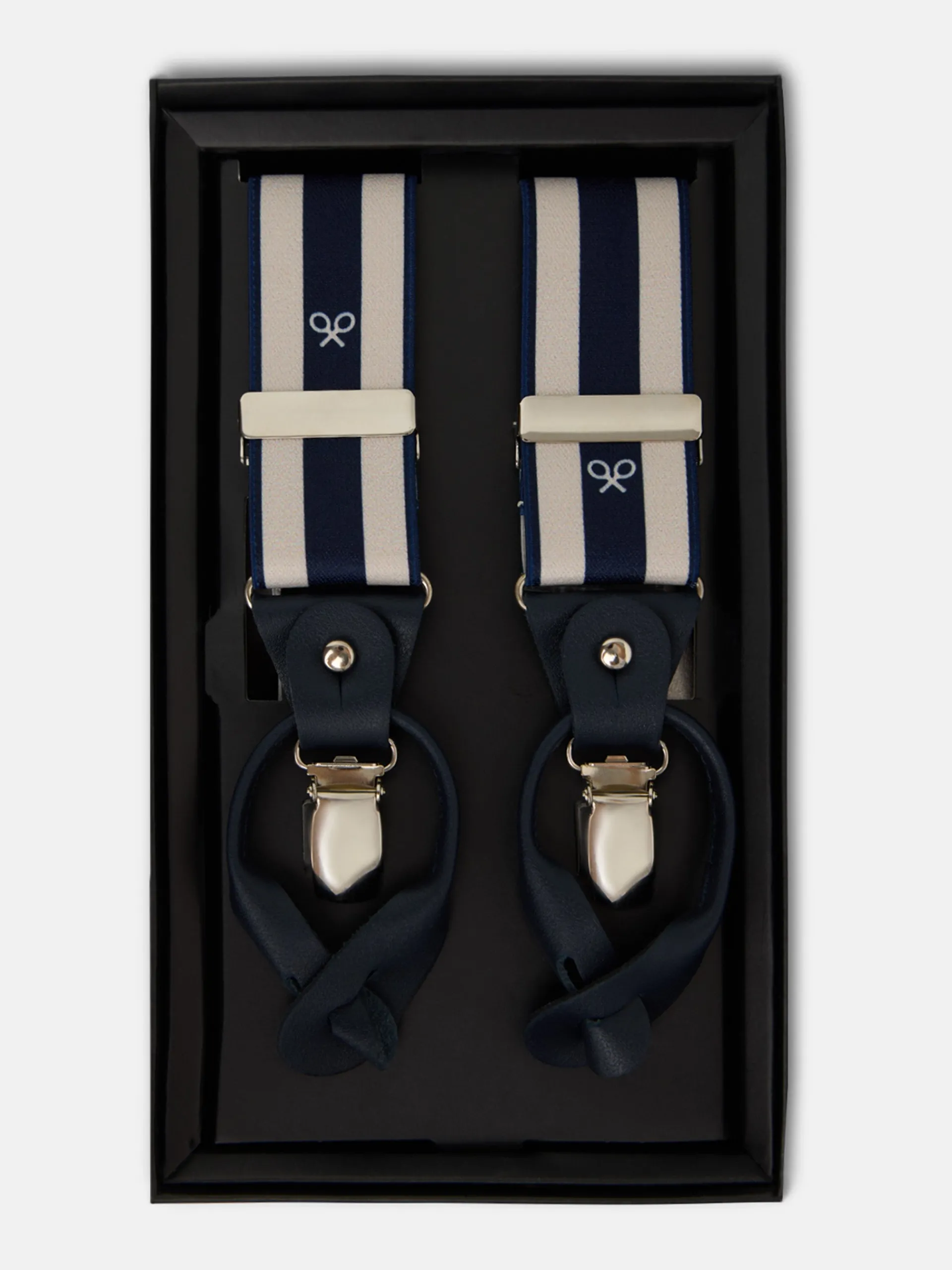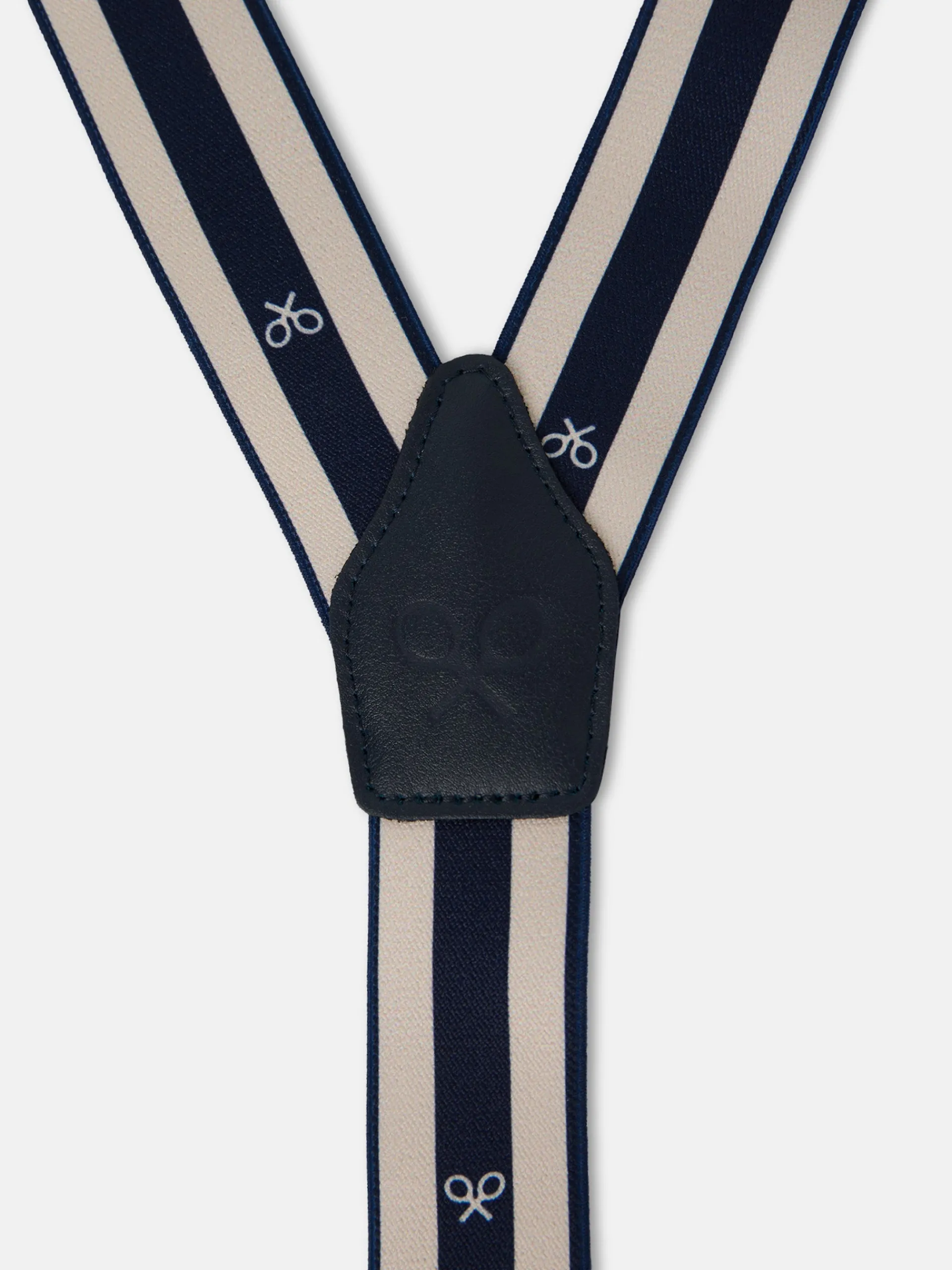 Tirante regimental elástico y ajustable con raquetas de color blanco. Este tirante cuenta con detalles en piel vacuno de color azul marino con logo grabado a fuego. Incluye doble sujeción latiguillo y pinzas metálicas. Interior al tono. Fabricado en España.