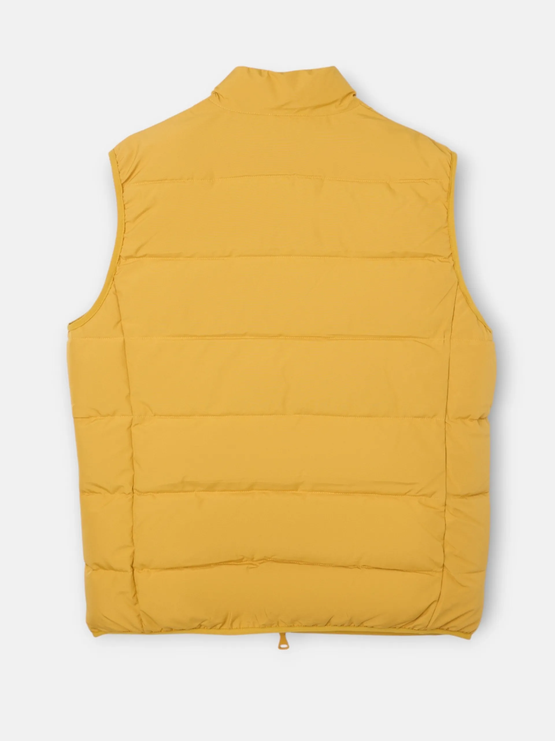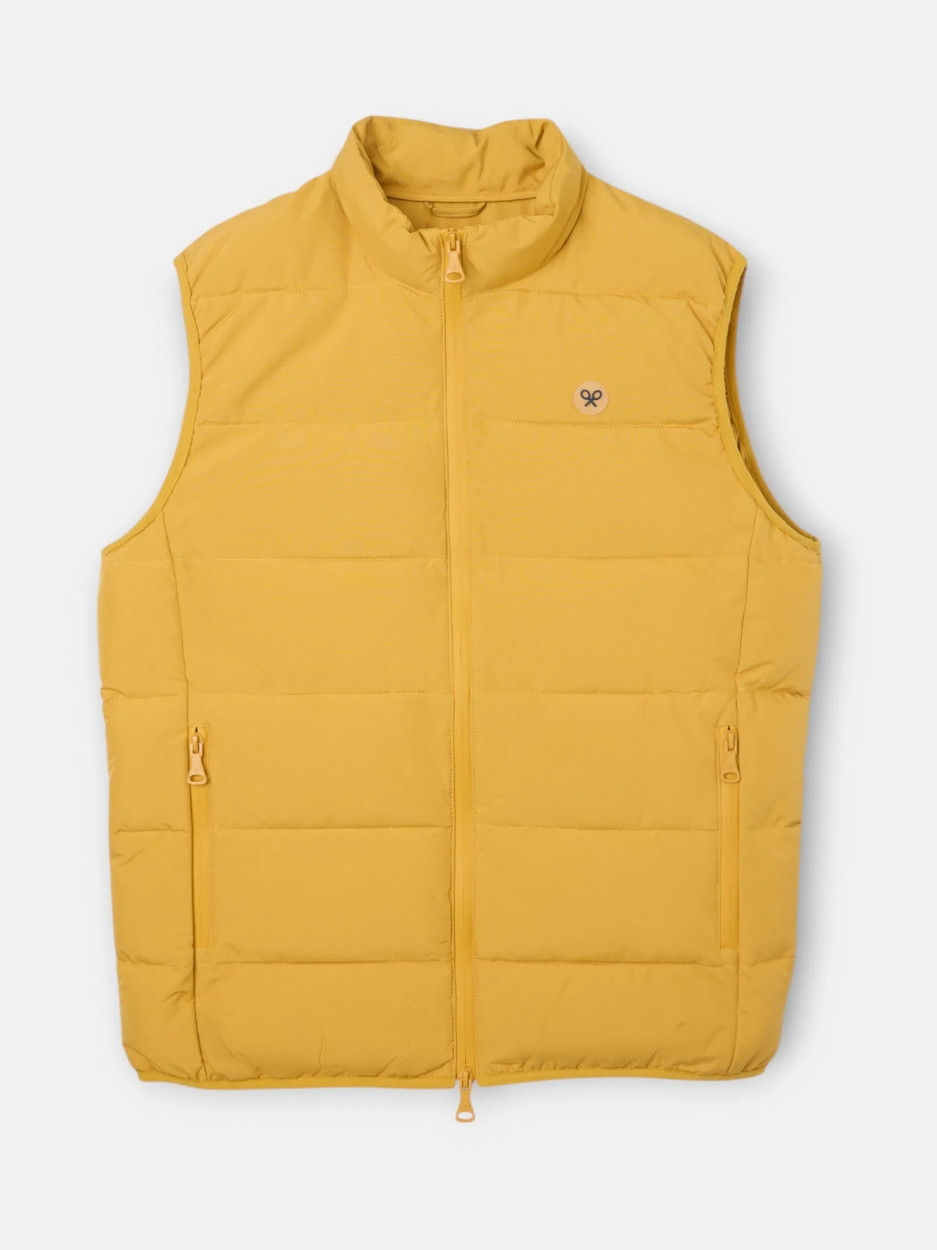 Chaleco clásico técnico color mostaza de corte Regular fit. Presenta cierre frontal y bolsillos con cremalleras termoselladas, tiradores personalizados y cuello subido. Cuenta con parche de raquetas microinyectadas en el torso y forro interior. Contiene cremallera de doble sentido.