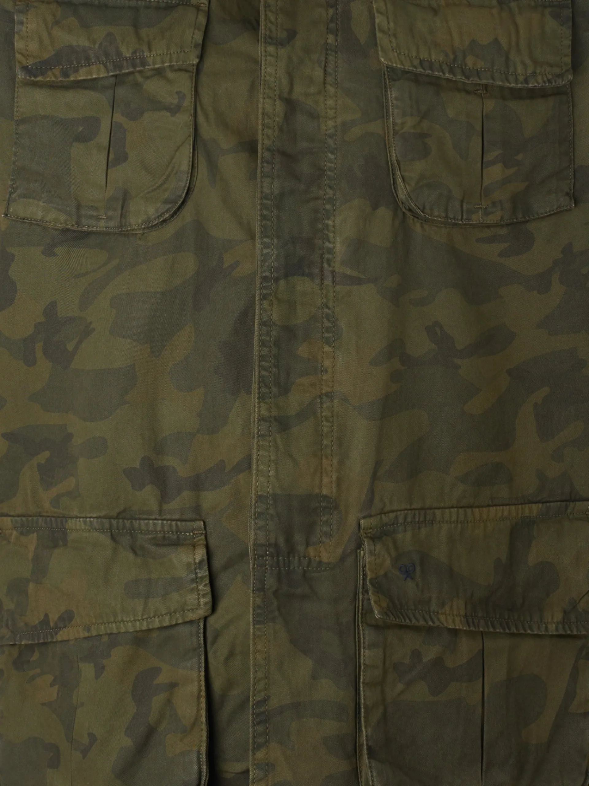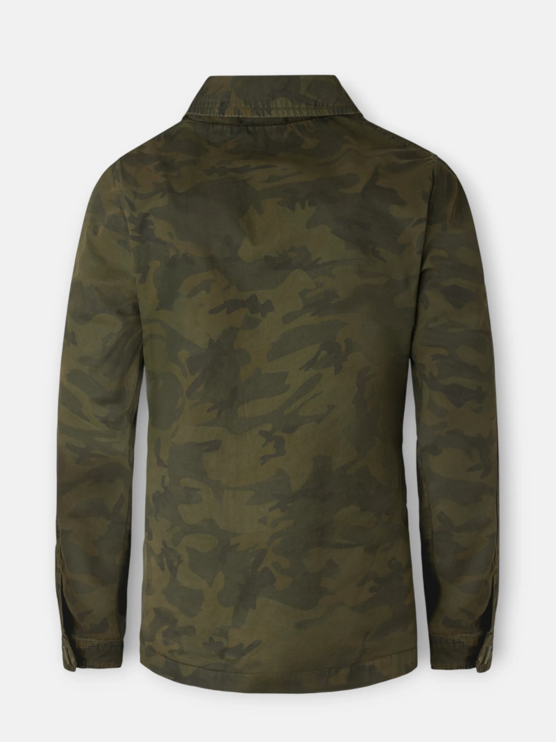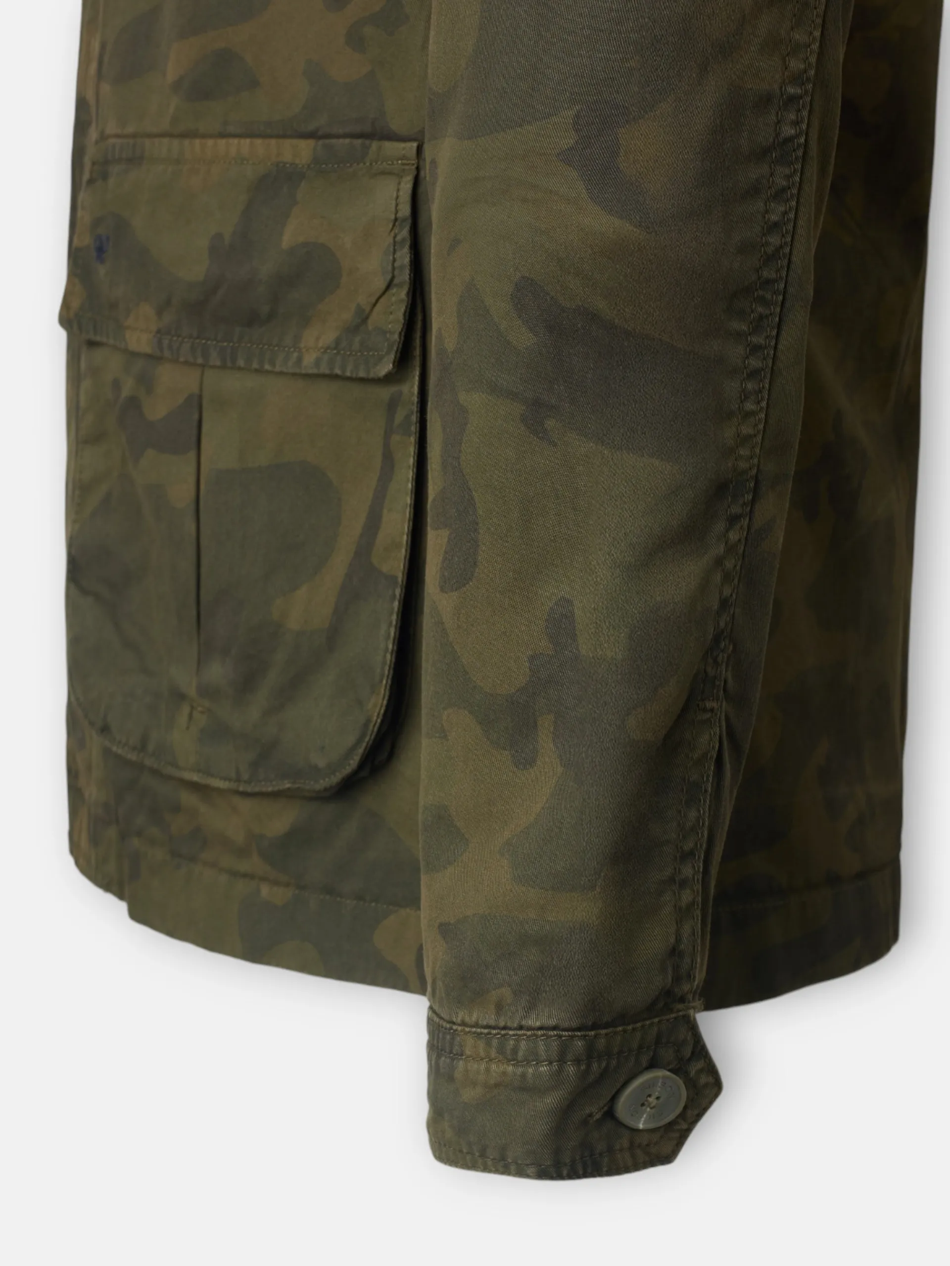 Chaqueta militar camuflaje confeccionada en 100% algodón de corte Regular fit. Presenta bolsillos frontales tipo parche, cierre frontal con botones y cremallera y cuello subido. Cuenta con manga larga de cierre con botón.