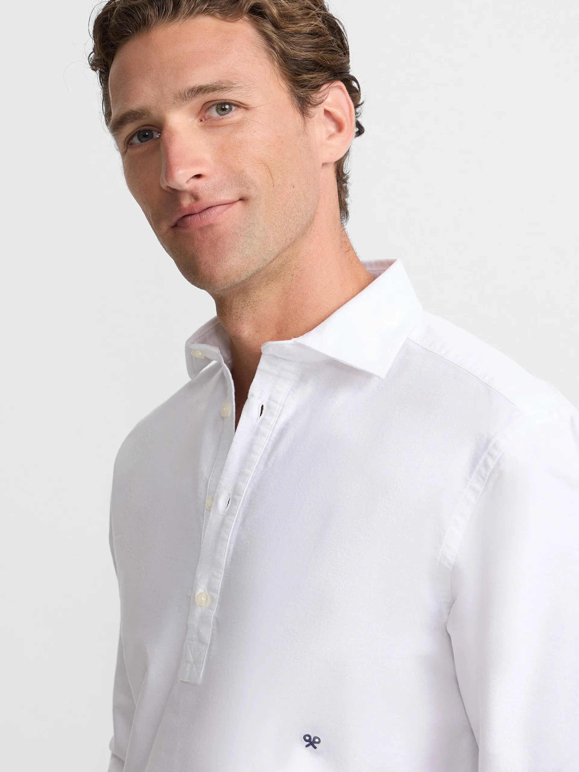 Polera oxford confeccionada en 100% algodón de corte Regular fit. Presenta cuello clásico, cierre con botones personalizados y manga larga de puño con botones. Cuenta con raquetas bordadas en el torso.