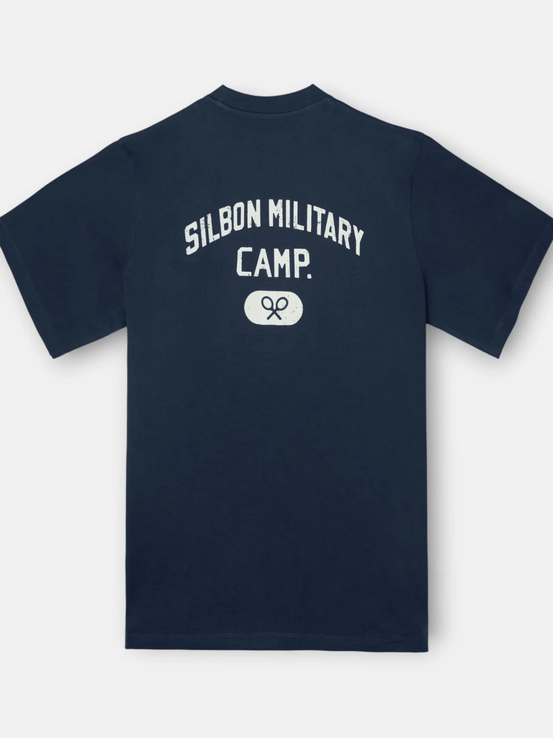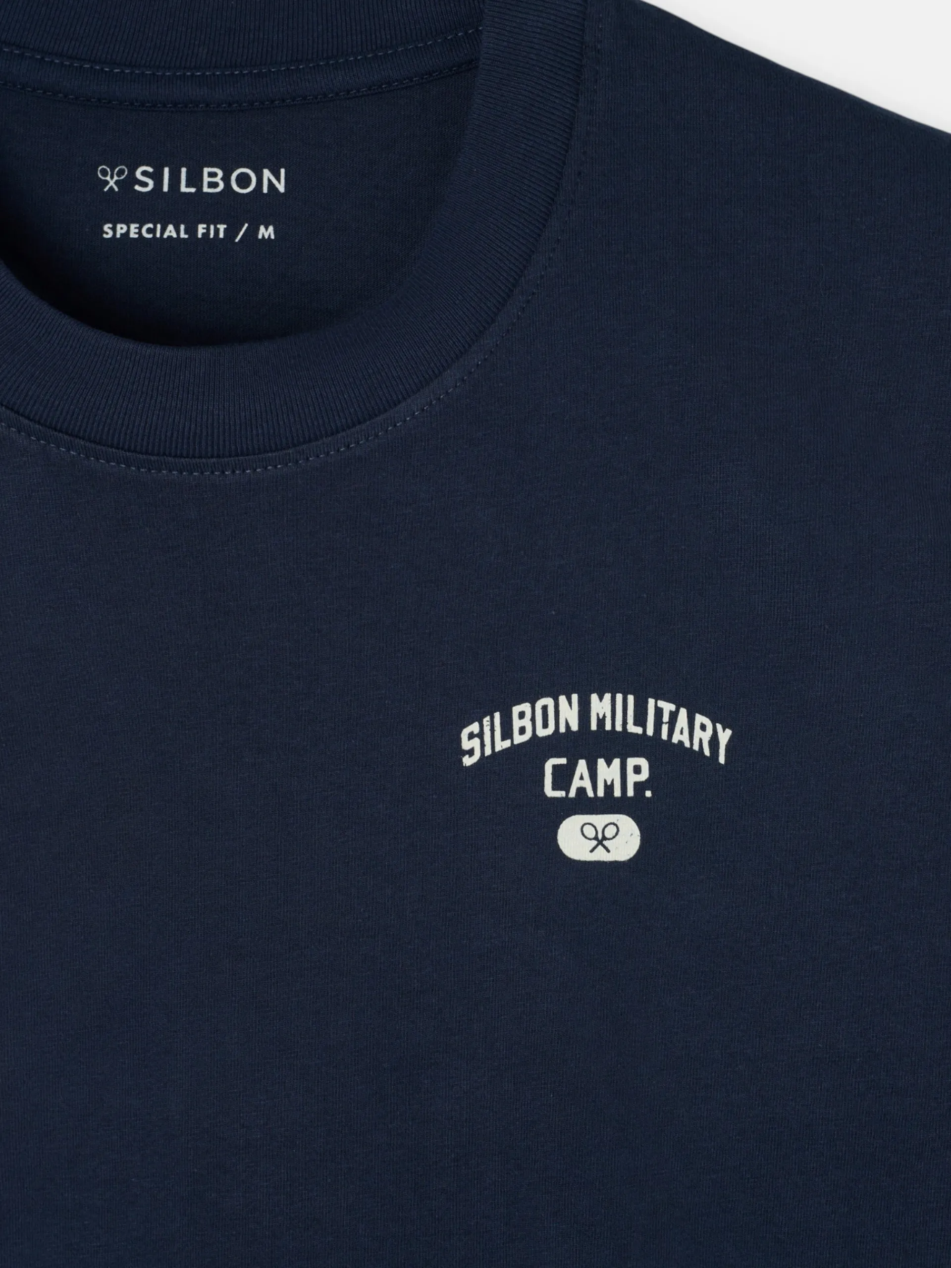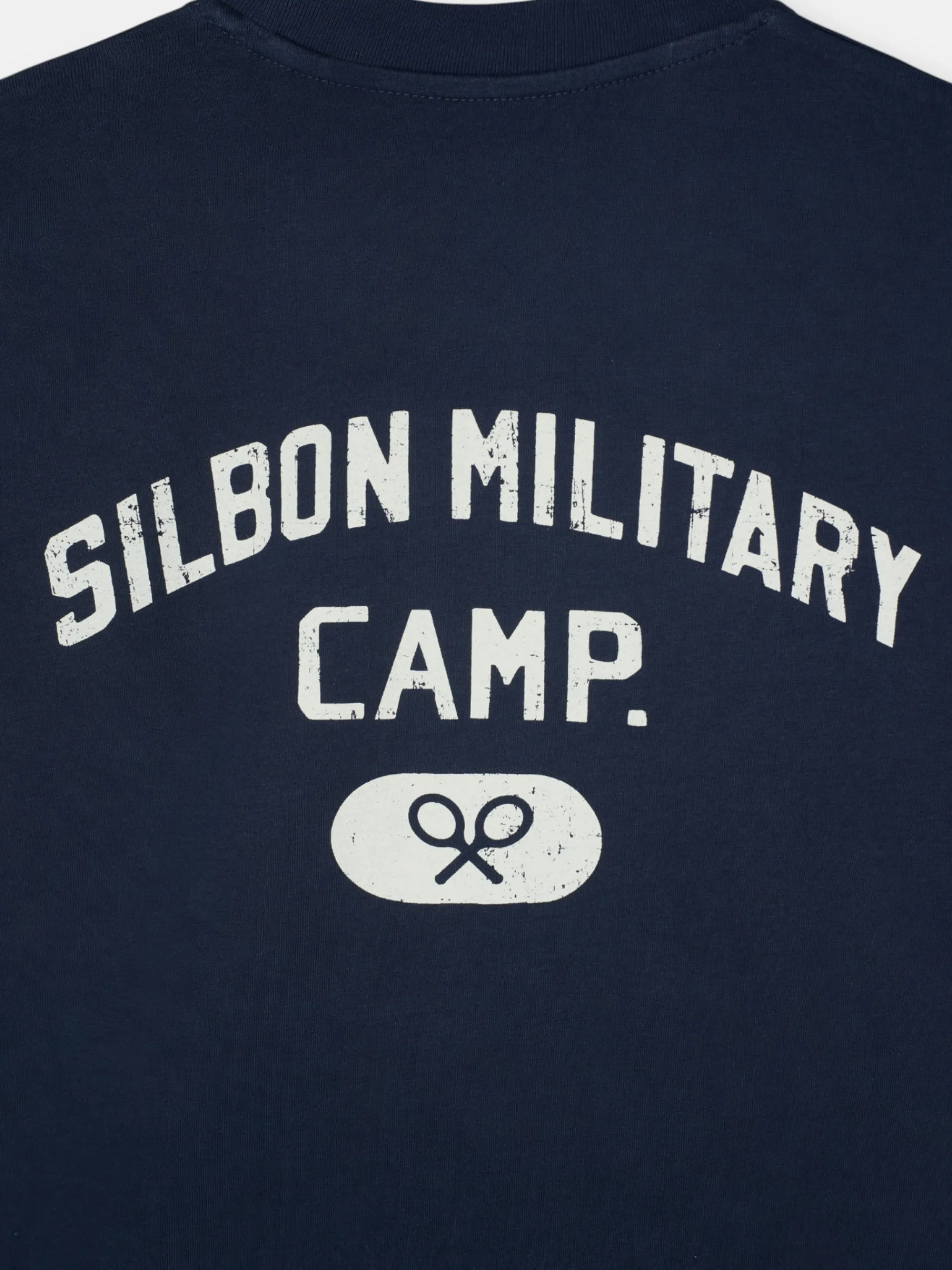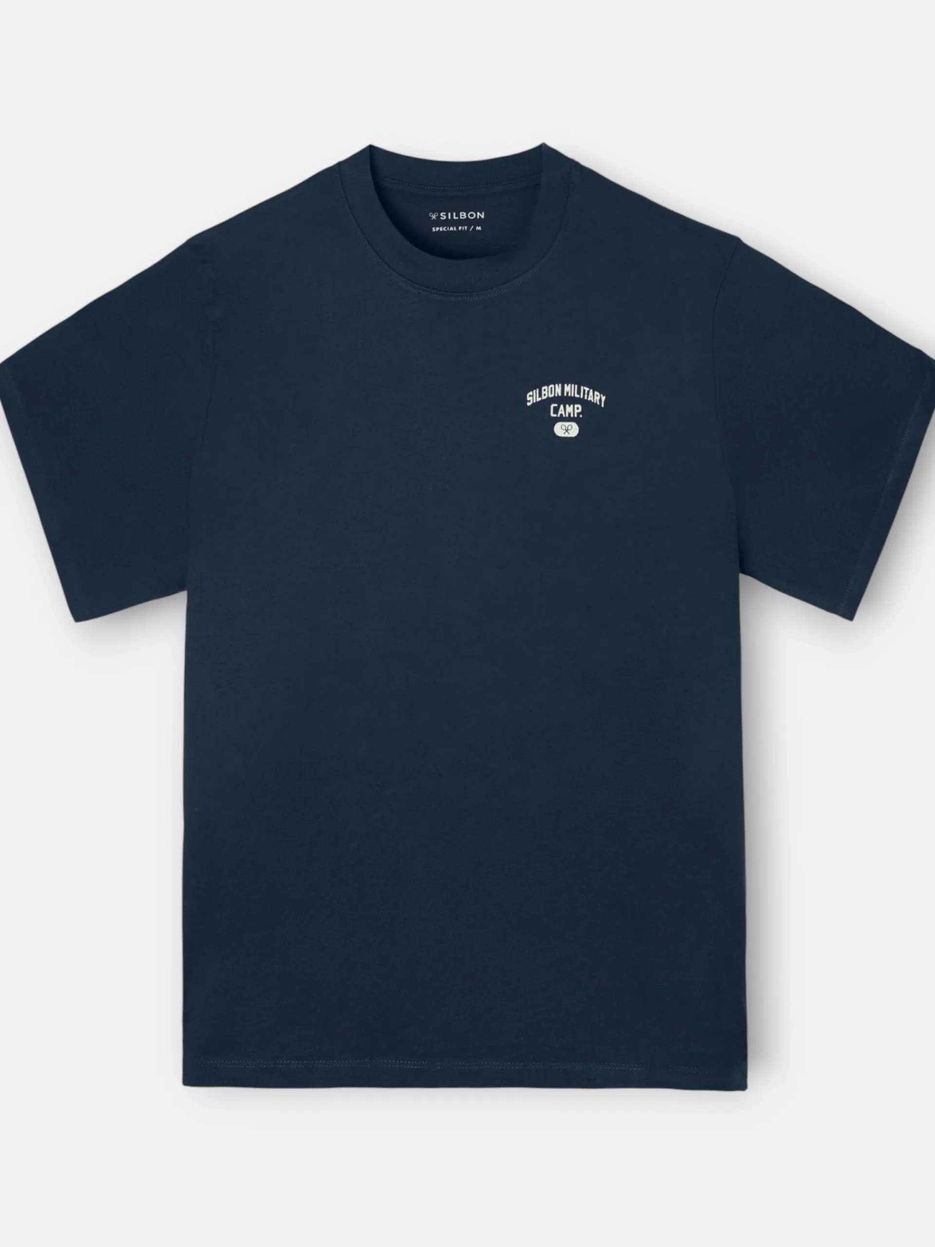 Camiseta azul marino de manga corta confeccionada en 100% algodón, con patrón Oversize. Presenta detalle print de «Silbon Military Camp» a contraste en color blanco en la espalda. Cuenta con cuello redondo y pequeño print personalizado en el torso.