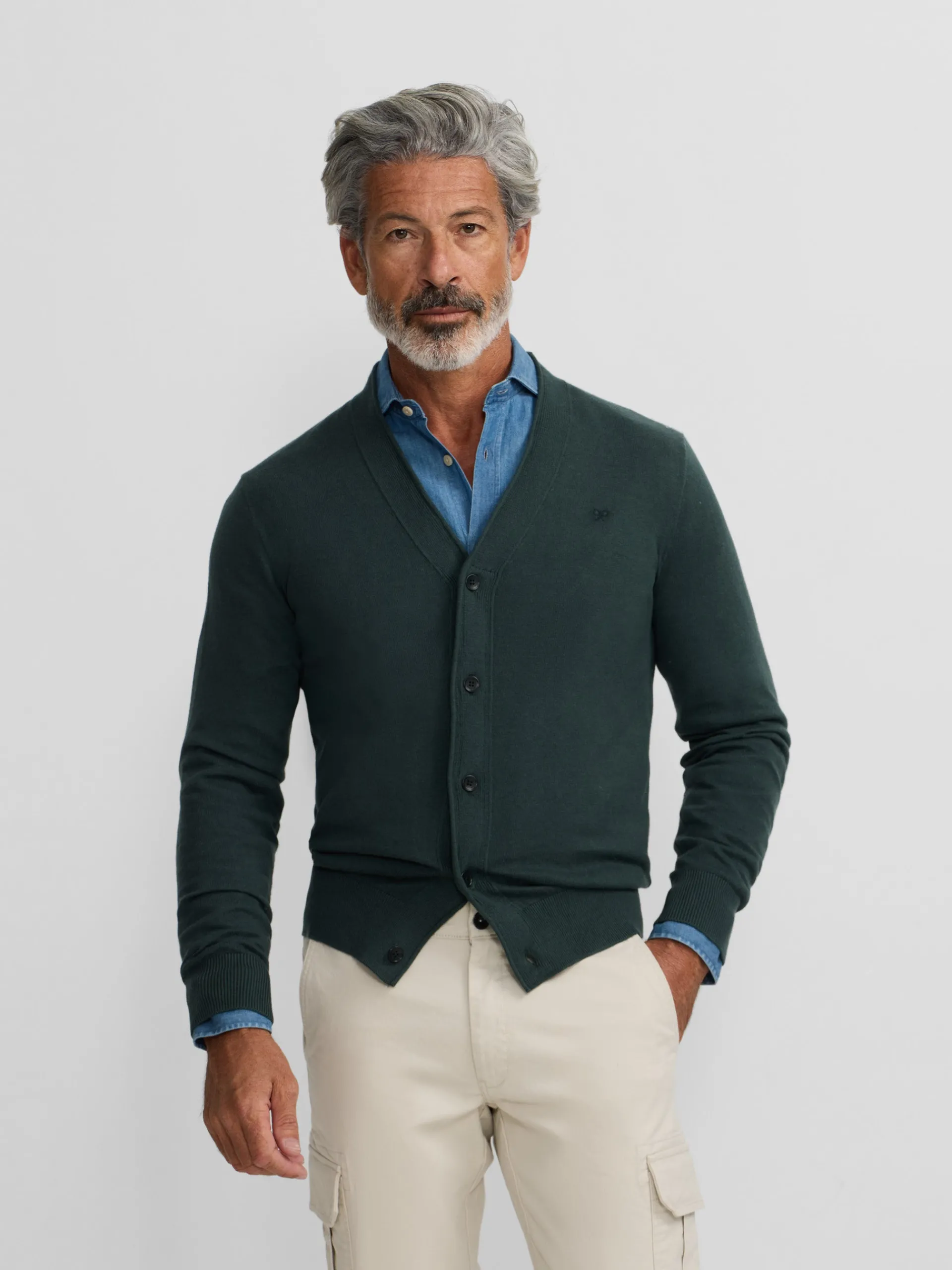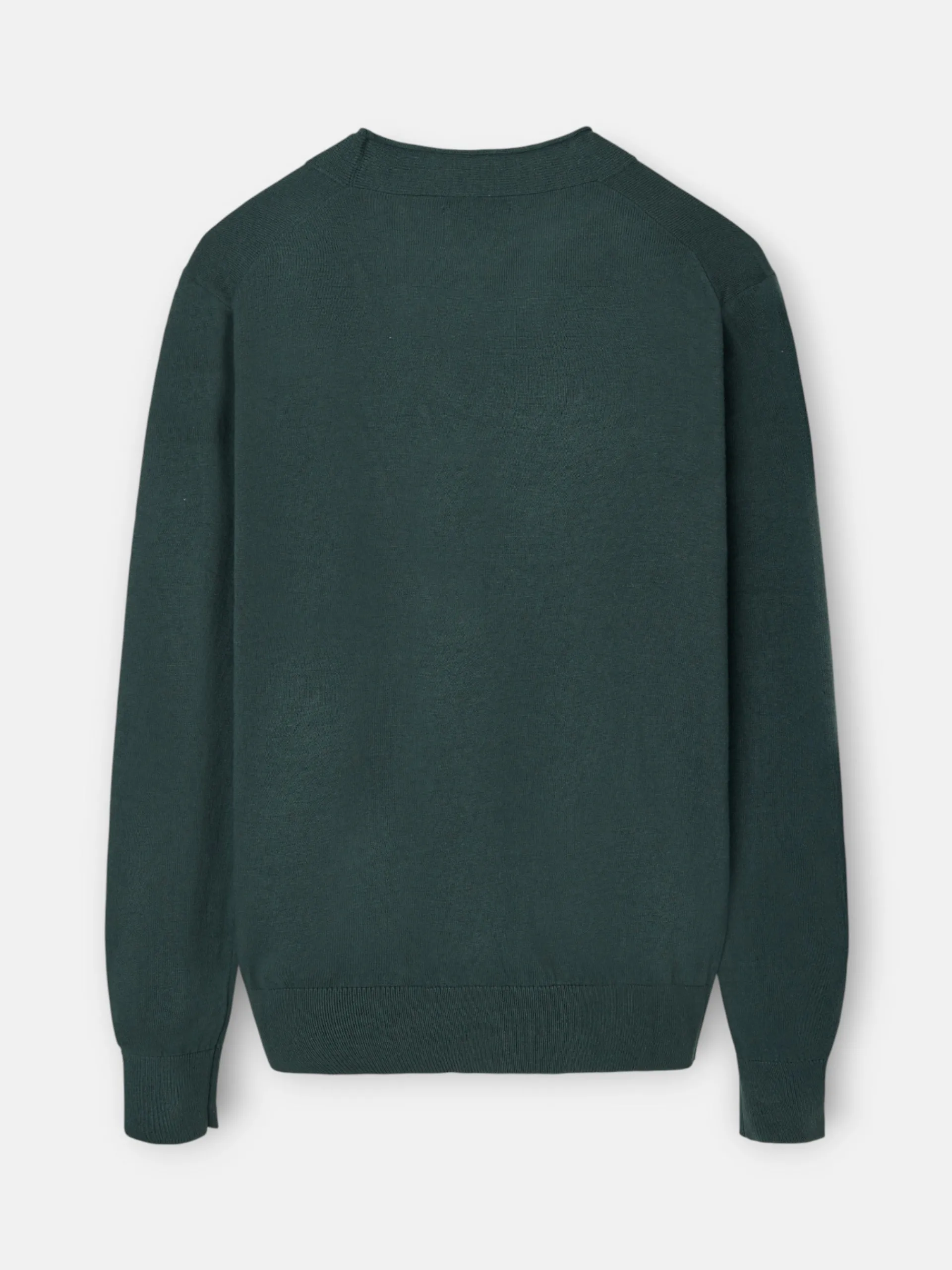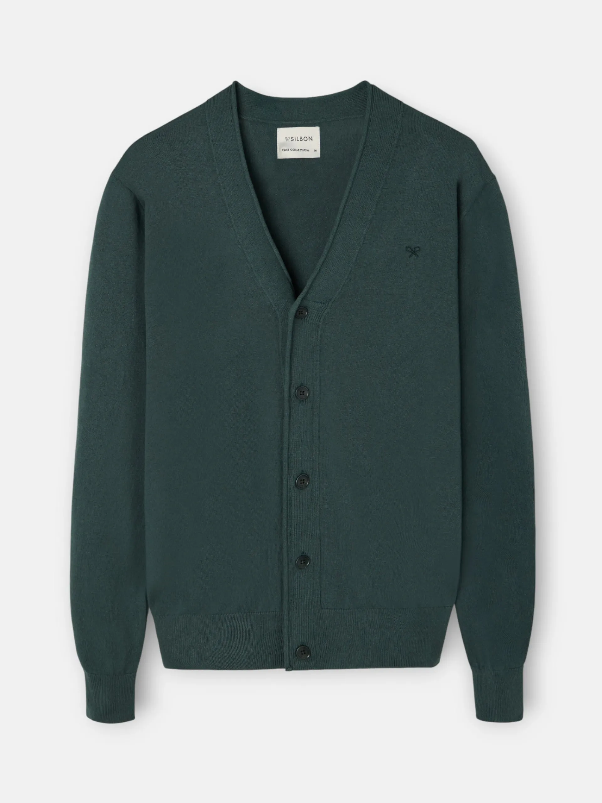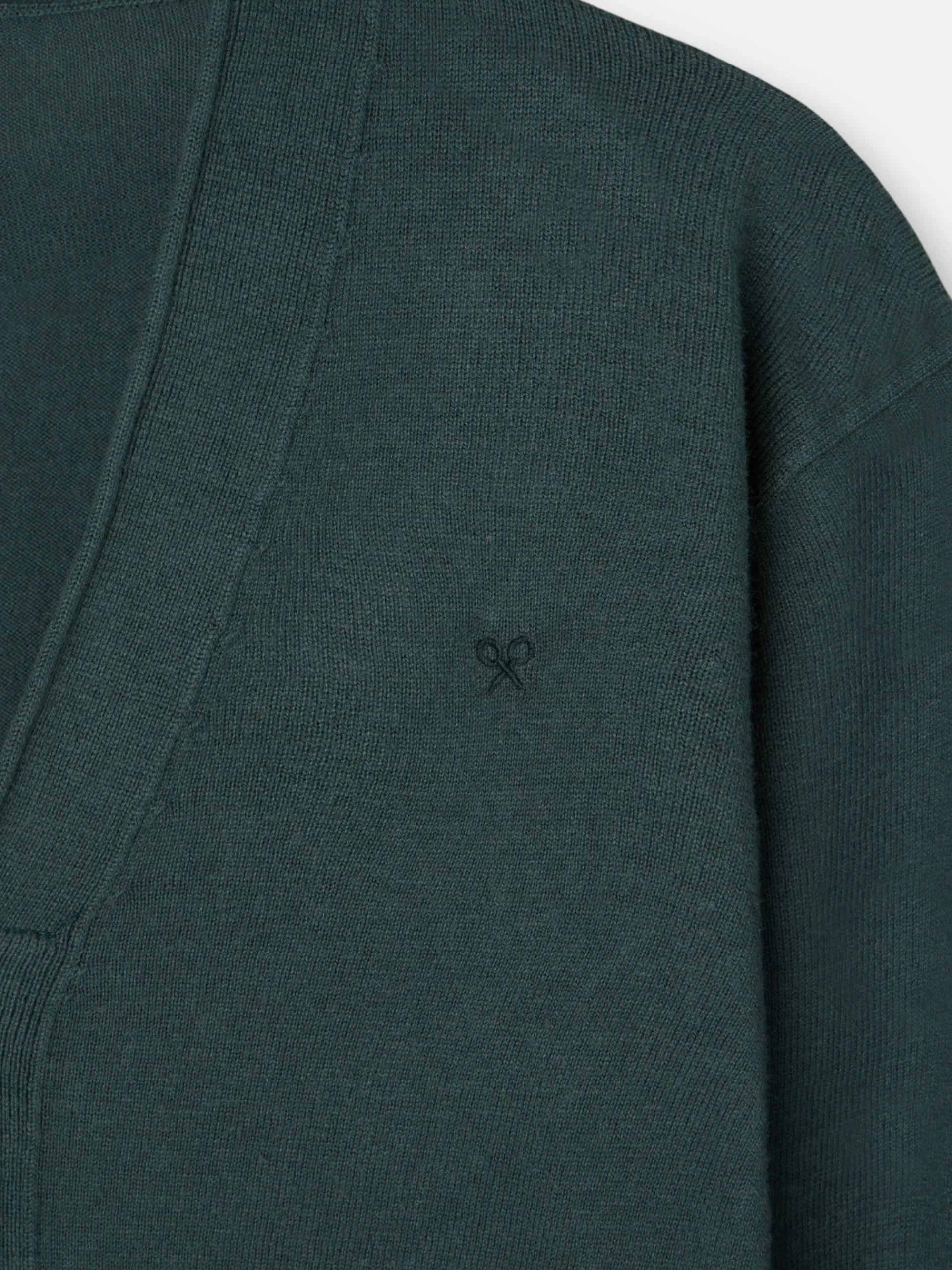 Cárdigan classic color verde oscuro confeccionado en mezcla de algodón BCI y cashmere con corte Regular fit. Presenta cuello pico, cierre con botones personalizados al tono y manga larga. Cuenta con bordado de raquetas en azul marino en el torso.