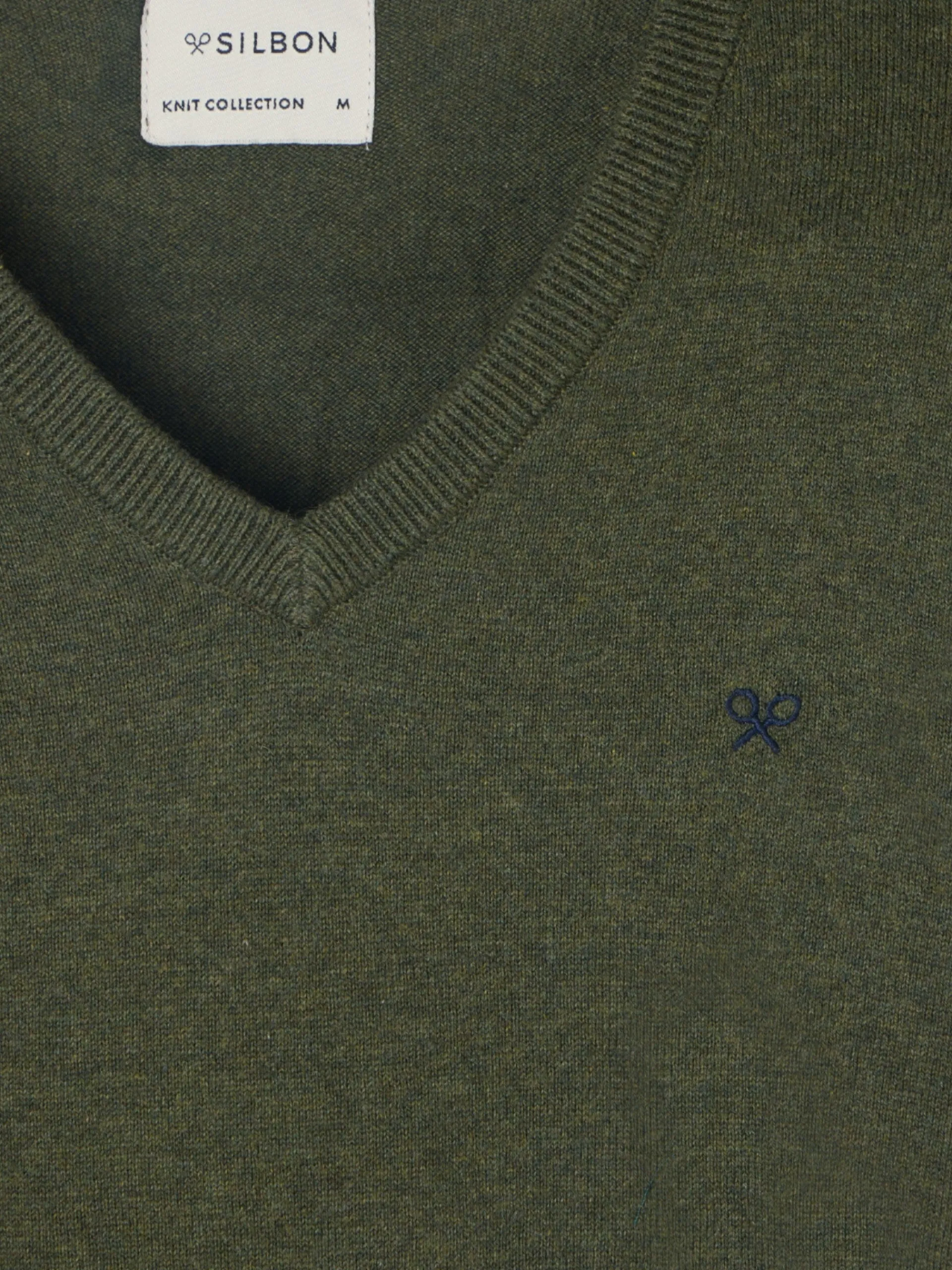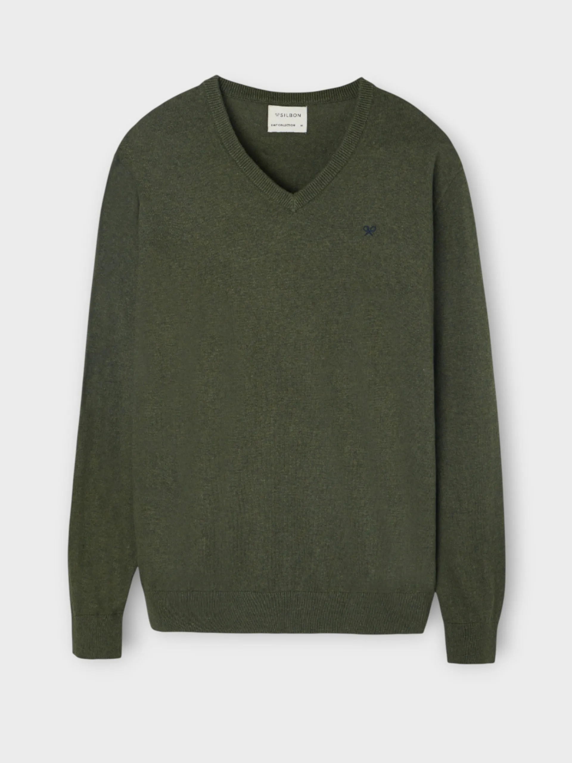 Jersey classic color verde confeccionado en mezcla de algodón y cashmere. Presenta cuello pico y manga larga. Cuenta con bordado de raquetas en el torso a contraste en color azul marino.