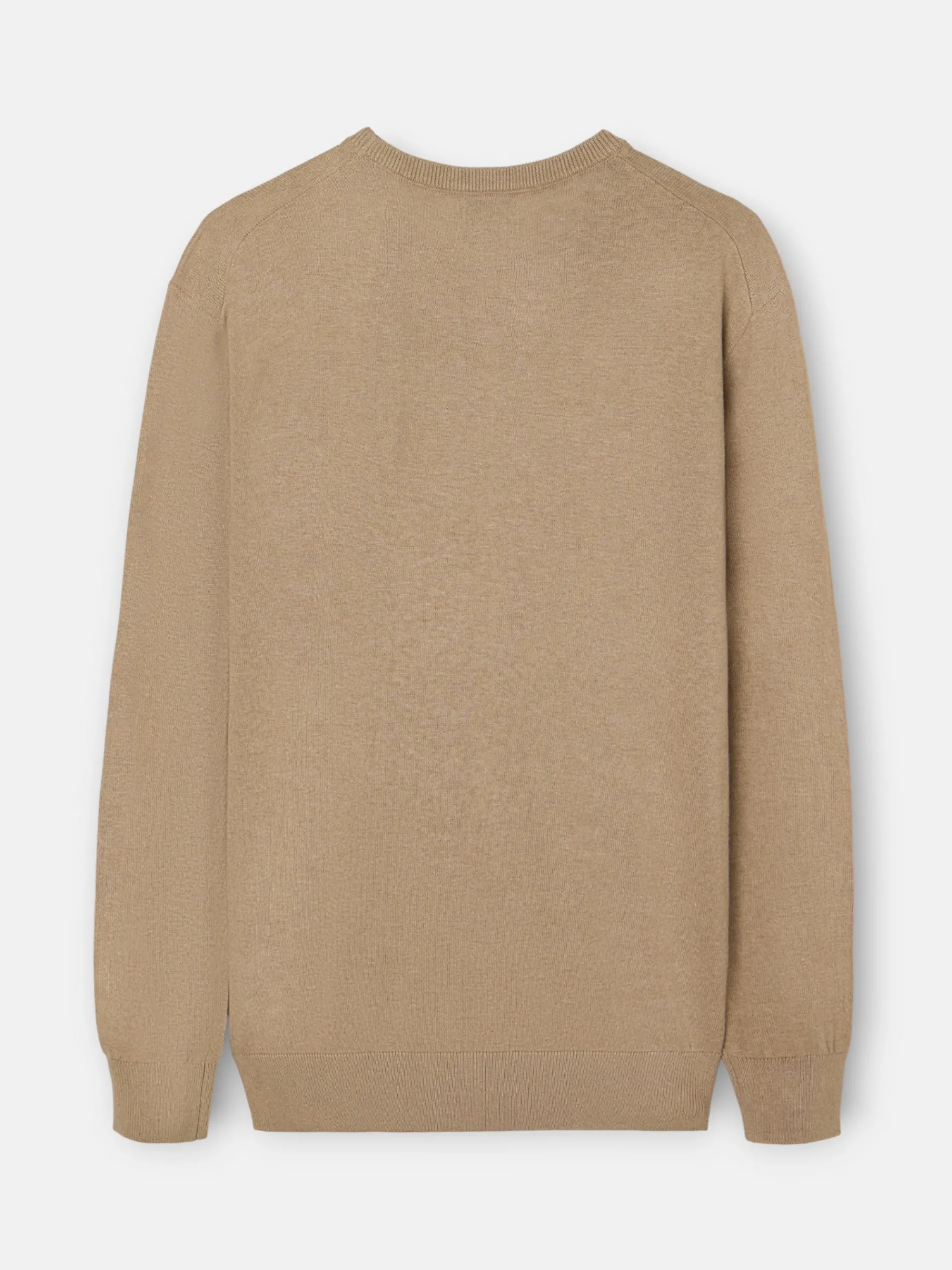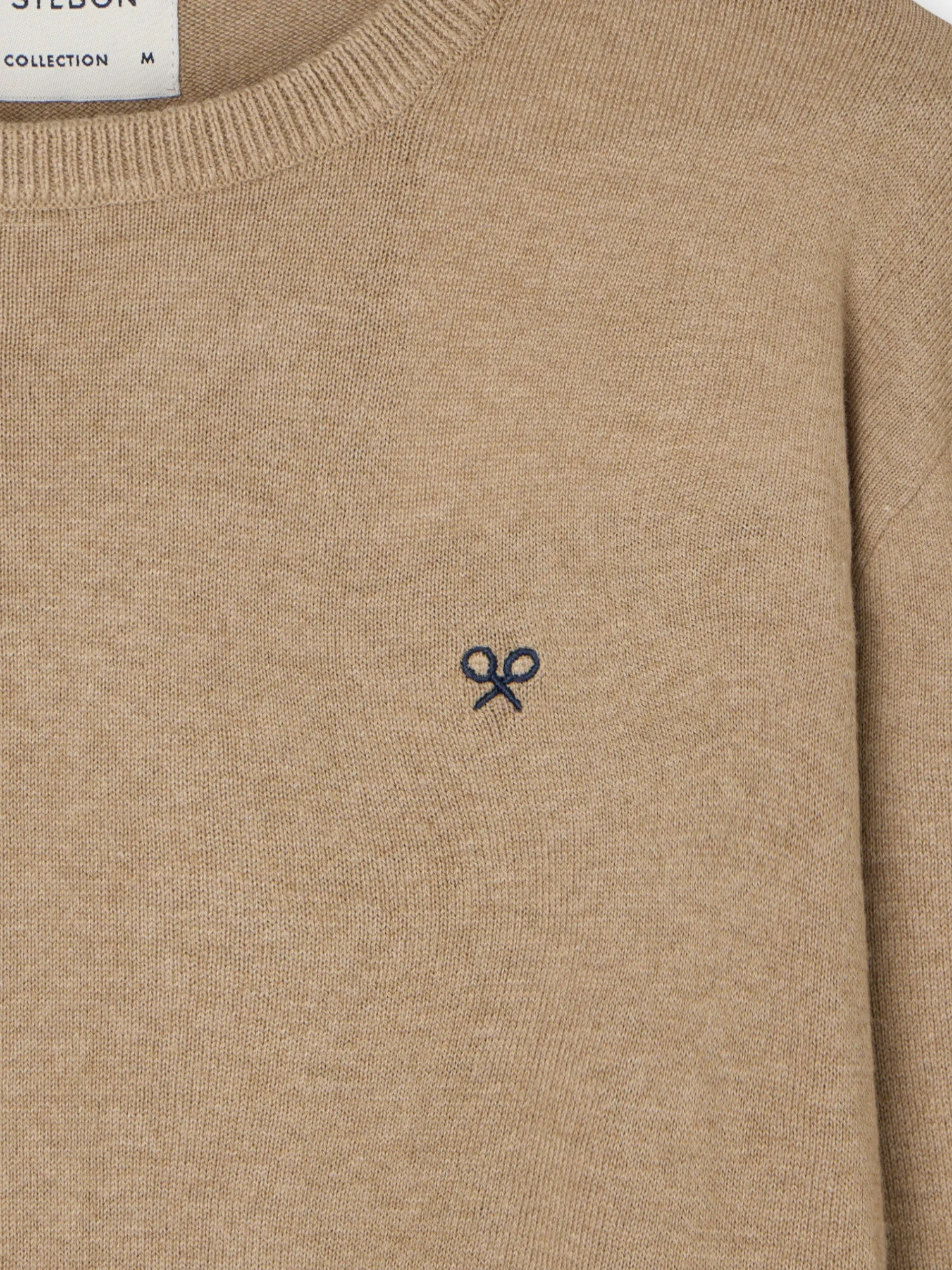 Jersey classic beige oscuro confeccionado en mezcla de algodón y cashmere. Presenta cuello redondo y manga larga. Cuenta con bordado de raquetas en el torso a contraste en color azul marino.