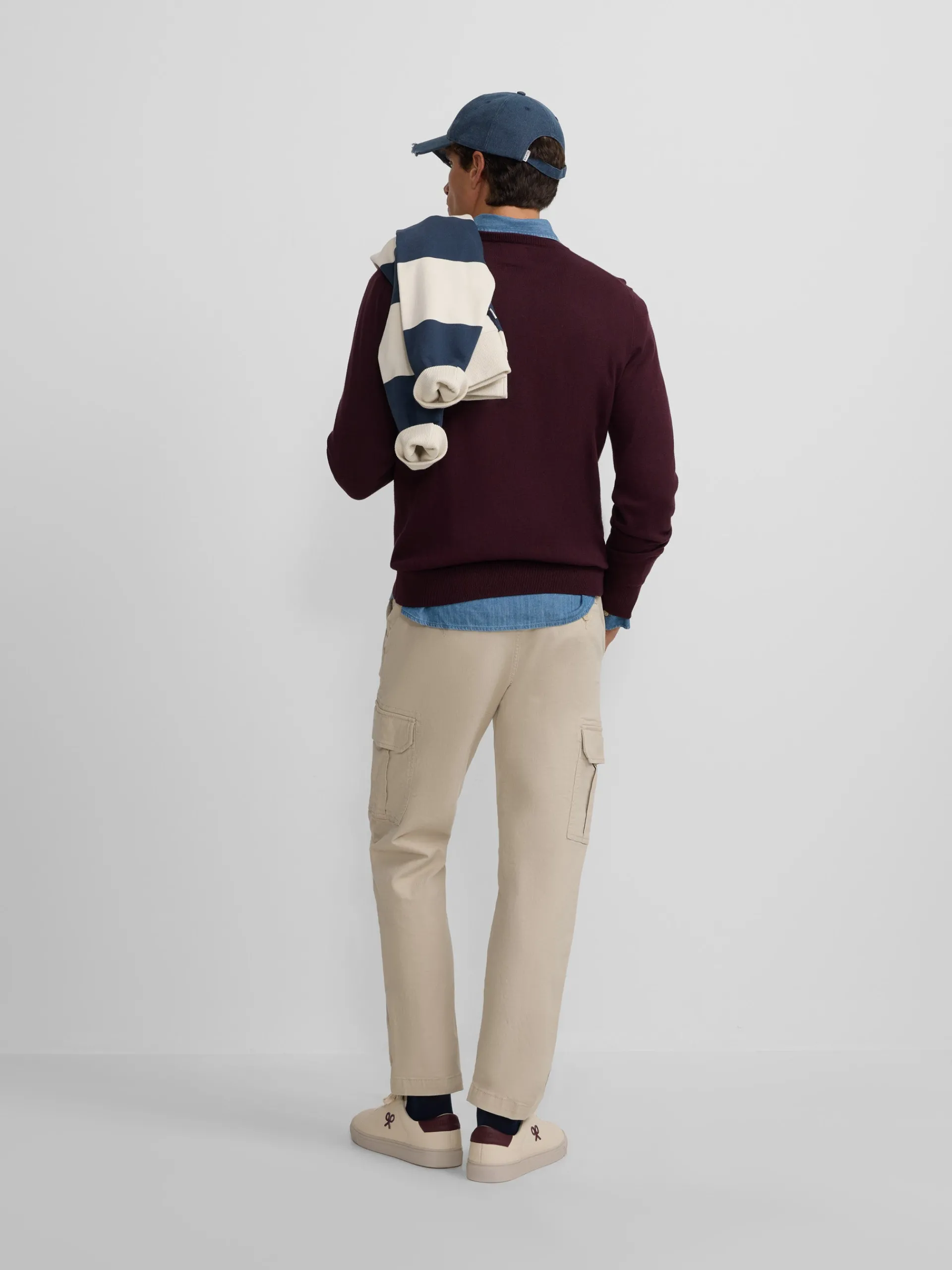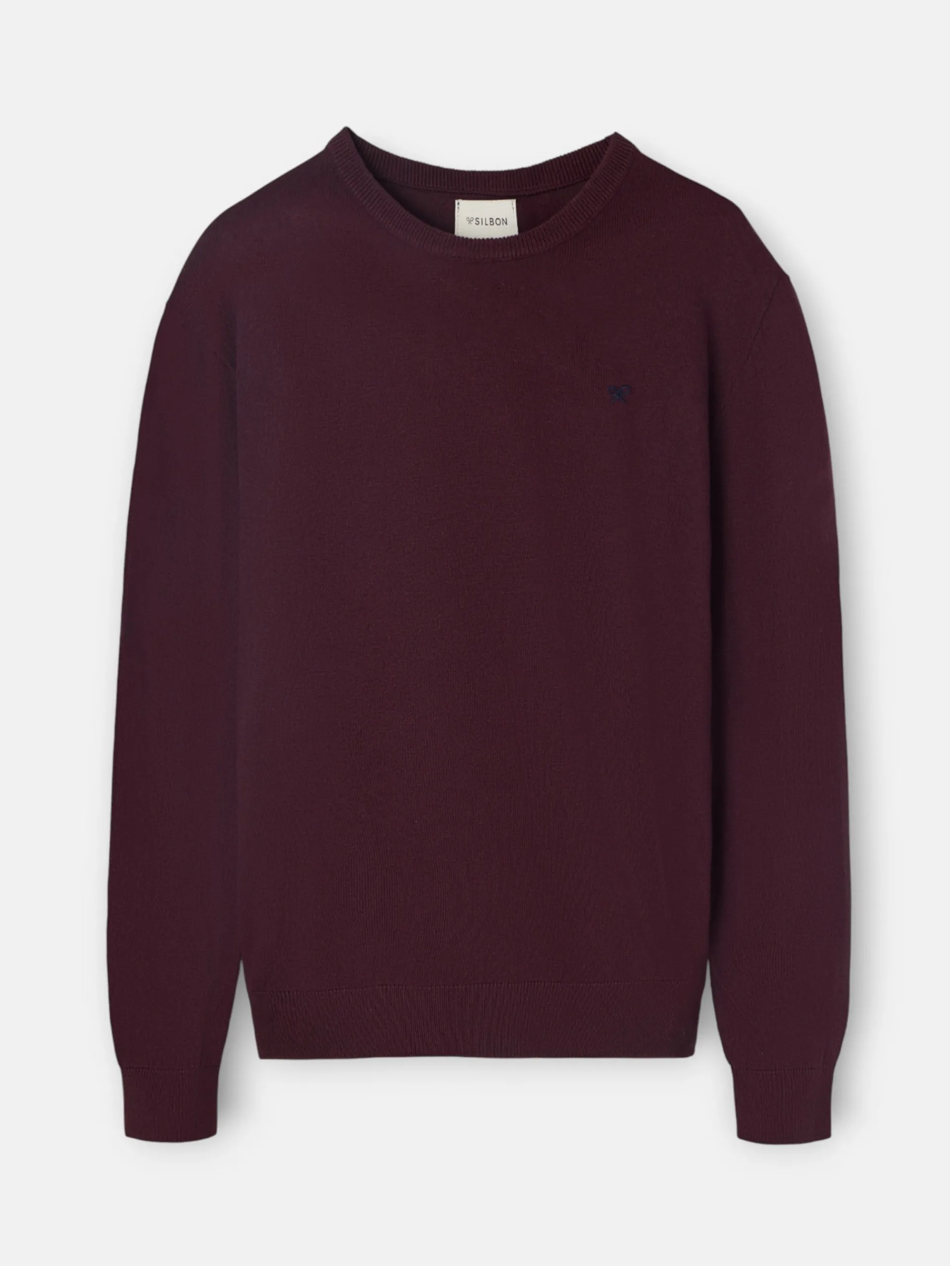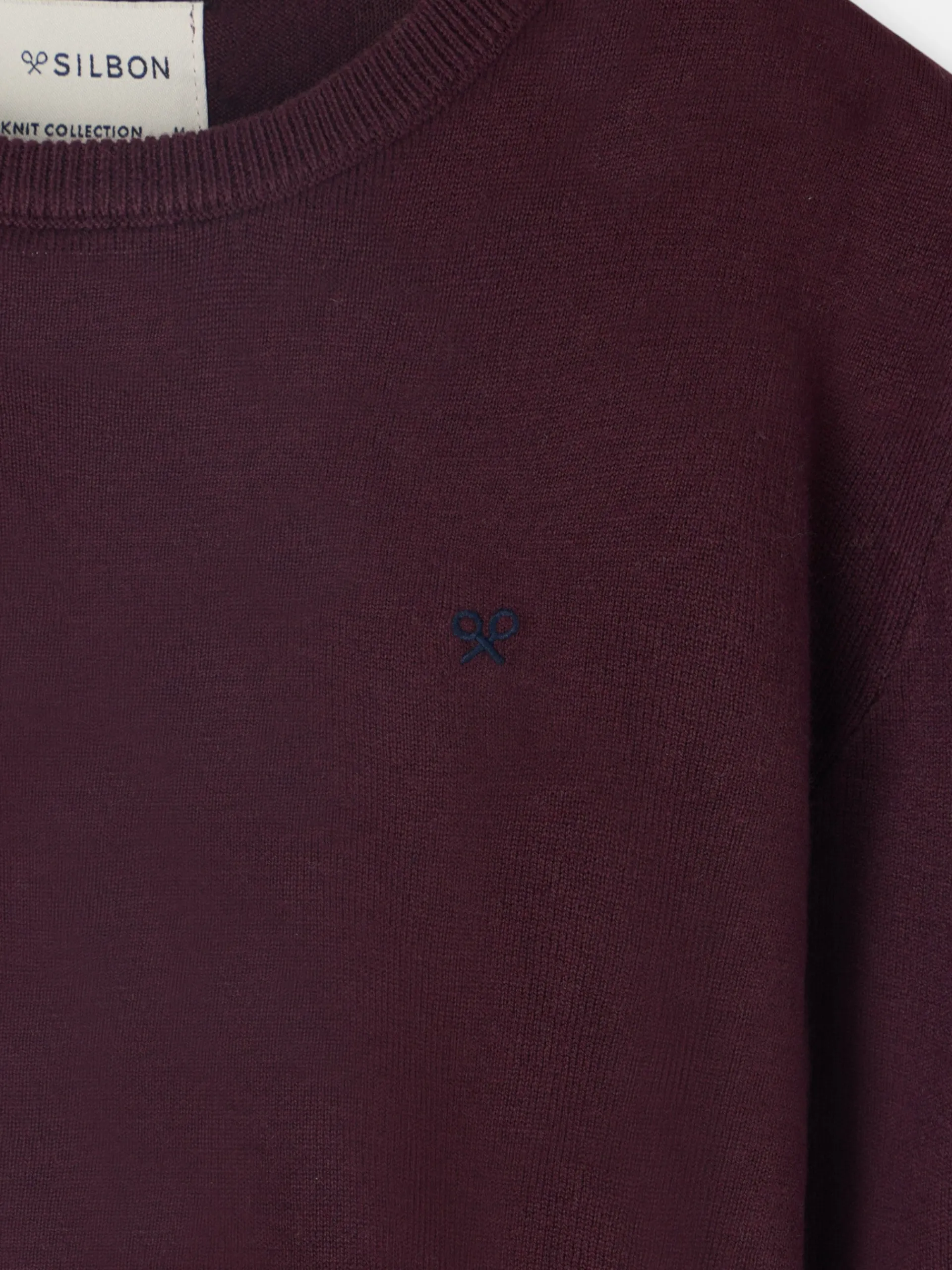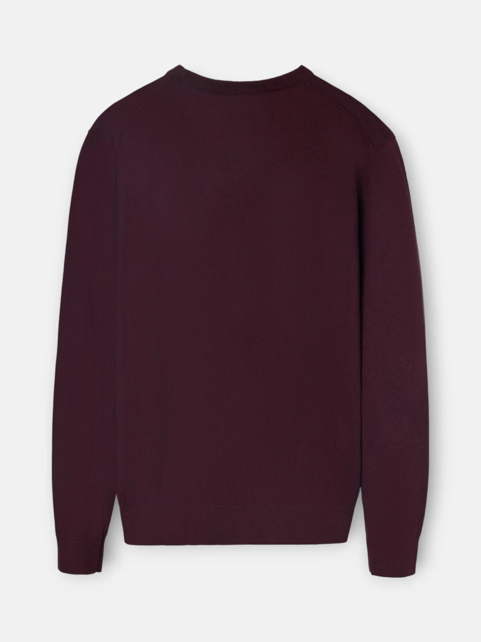 Jersey classic burdeos oscuro confeccionado en mezcla de algodón y cashmere. Presenta cuello redondo y manga larga. Cuenta con bordado de raquetas en el torso a contraste en color azul marino.