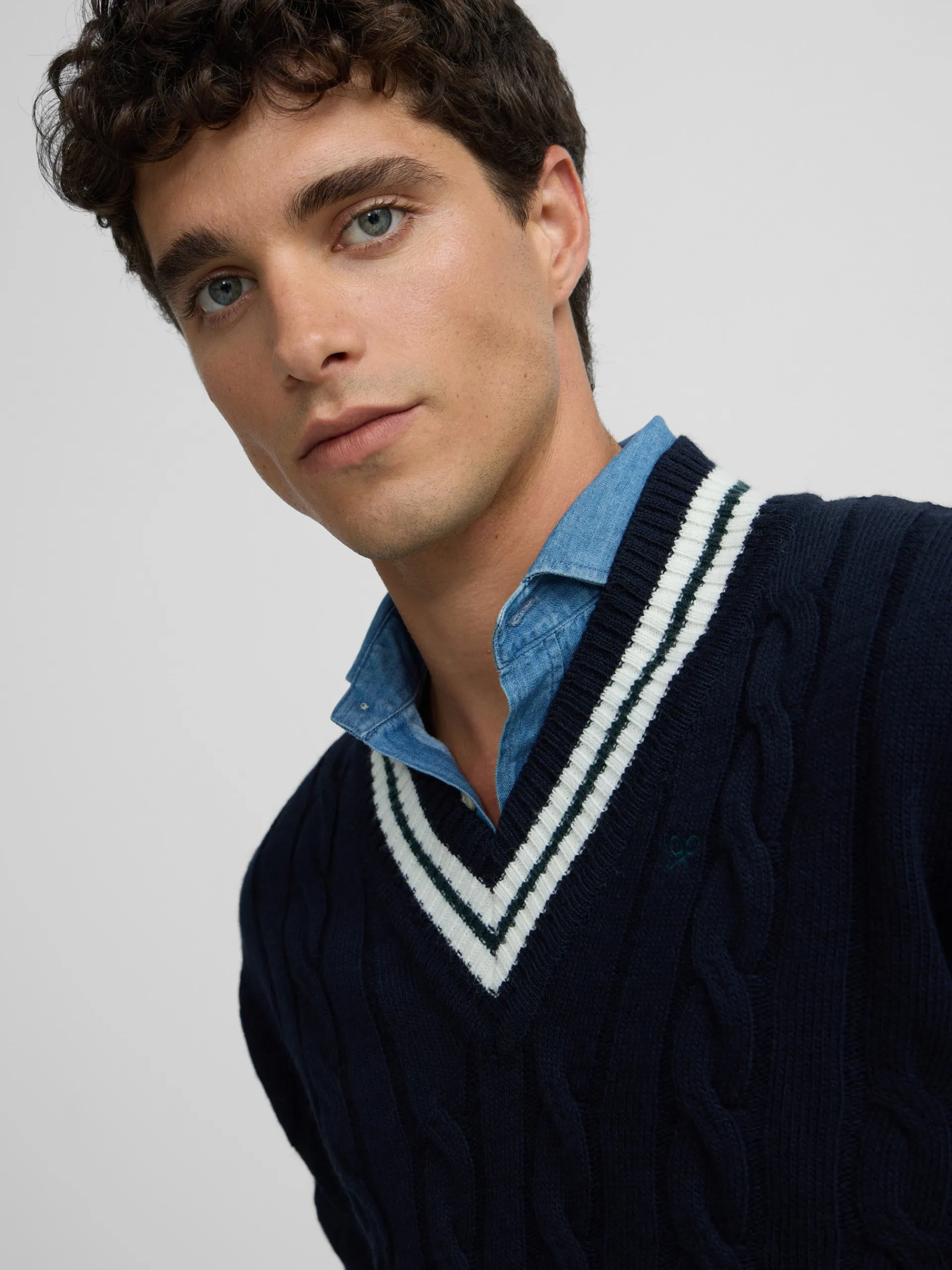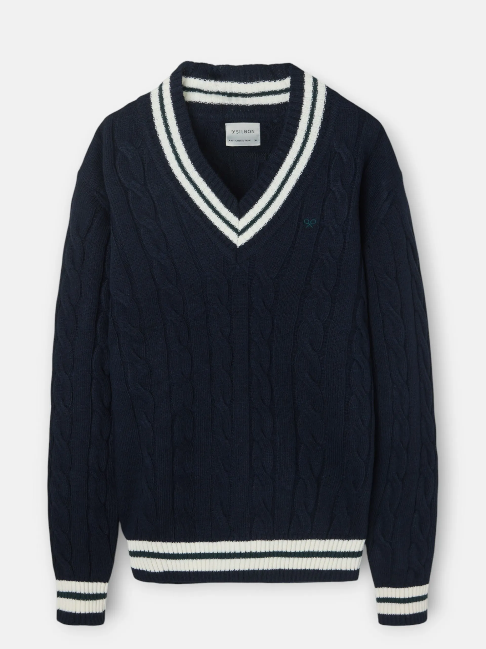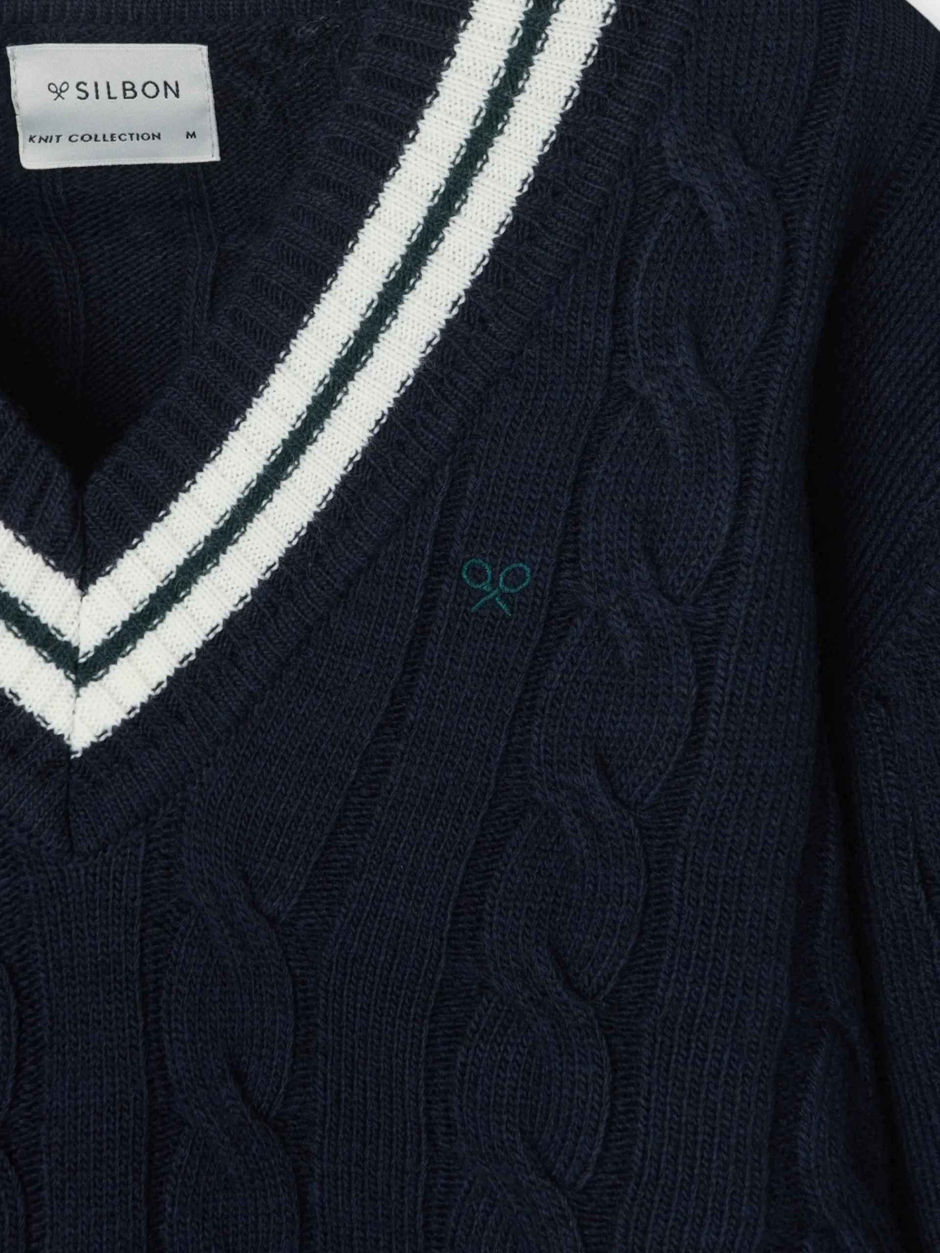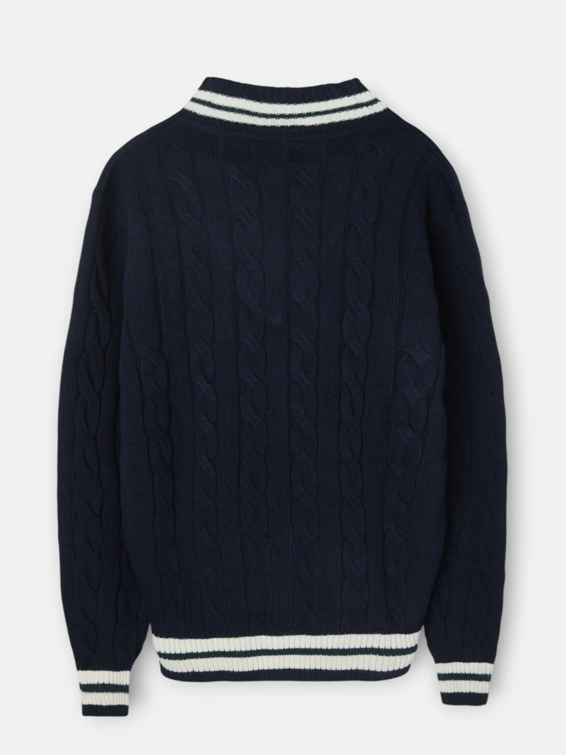 Jersey College de color azul marino confeccionado en mezcla de lana. Cuenta con cuello de pico y manga larga. Presenta detalle de rayas blanca y verde en cuello, bajo y puños. Cuenta con bordado de raquetas a contraste en color verde en el torso. Fabricado en Portugal.