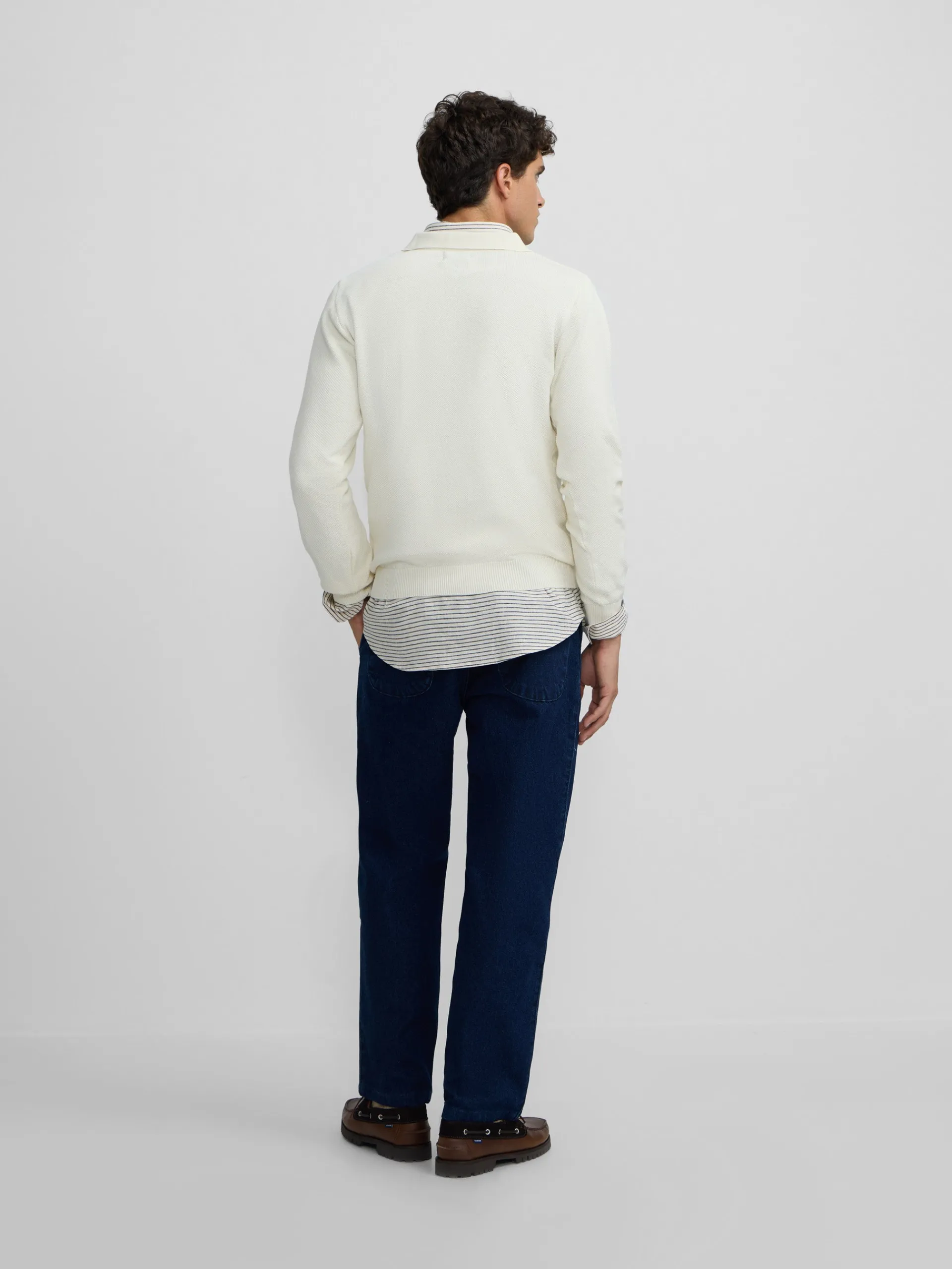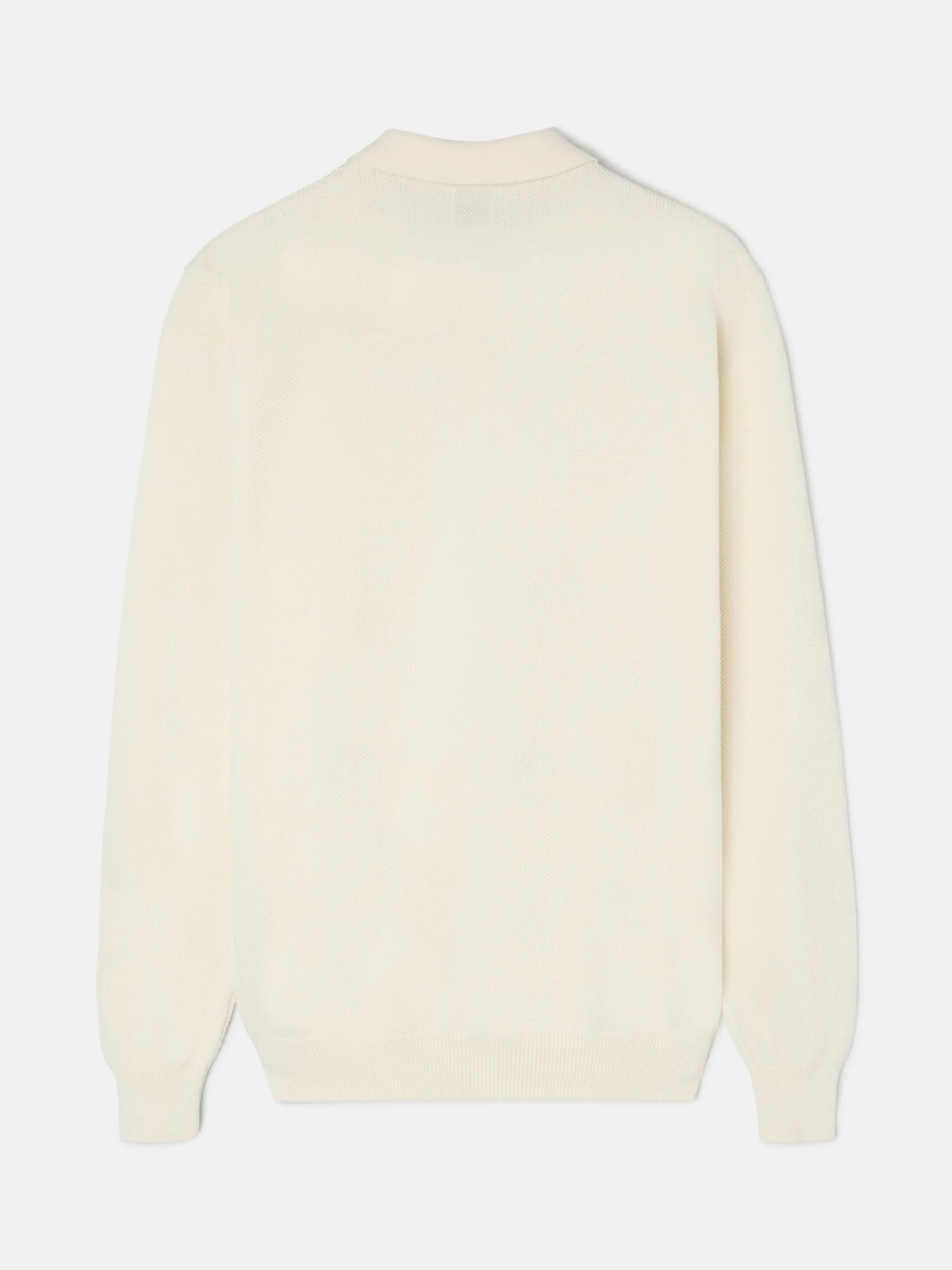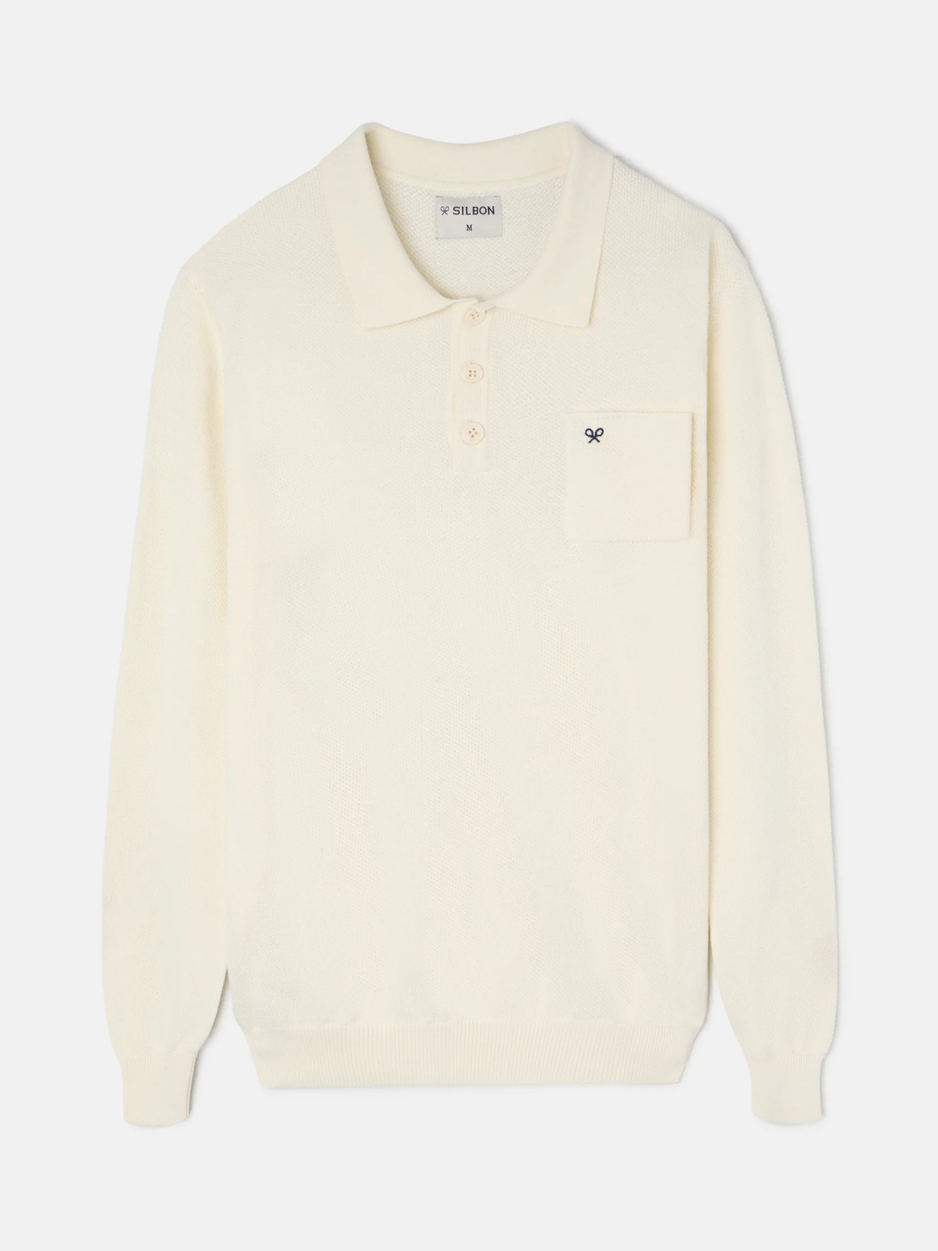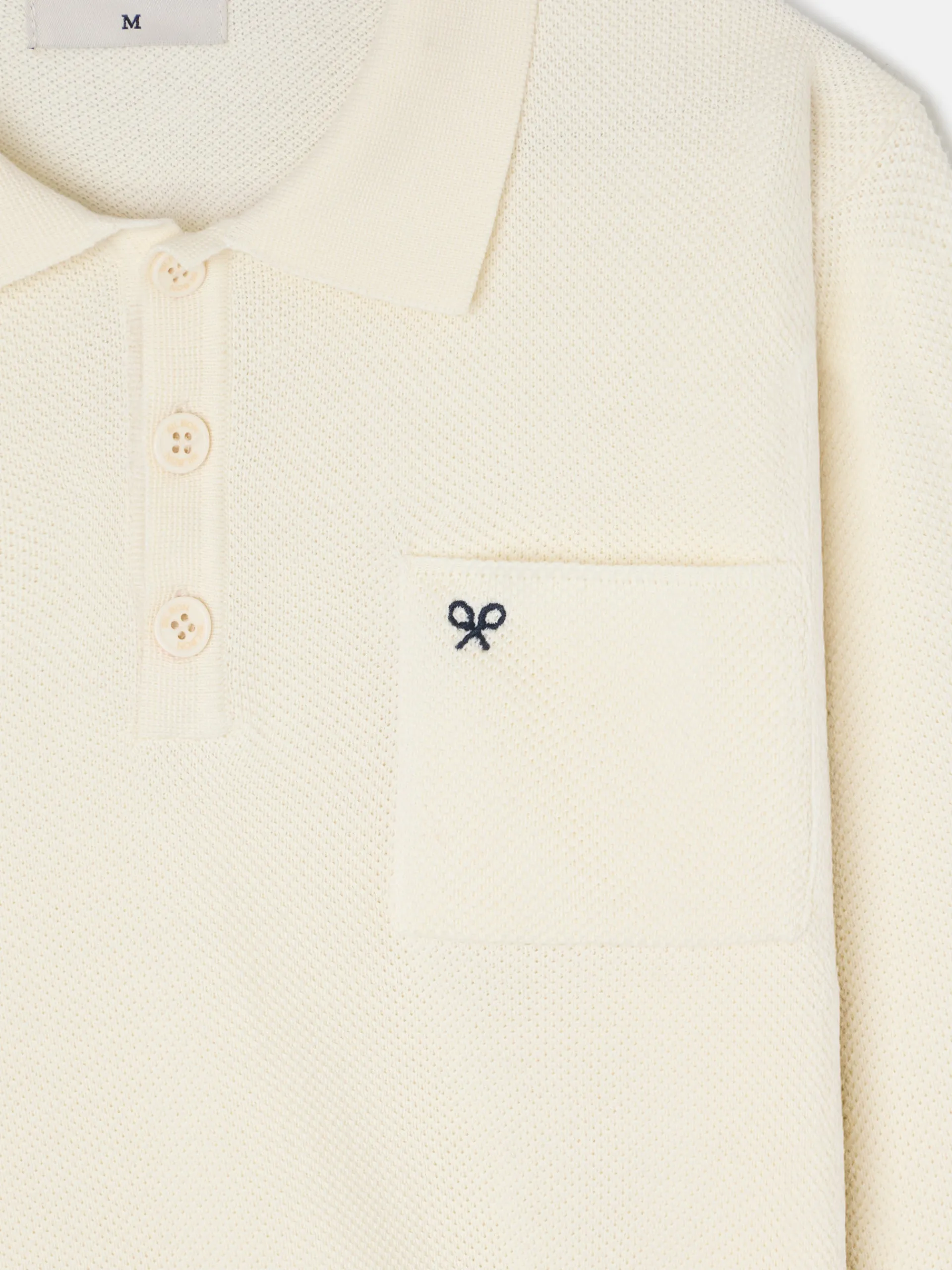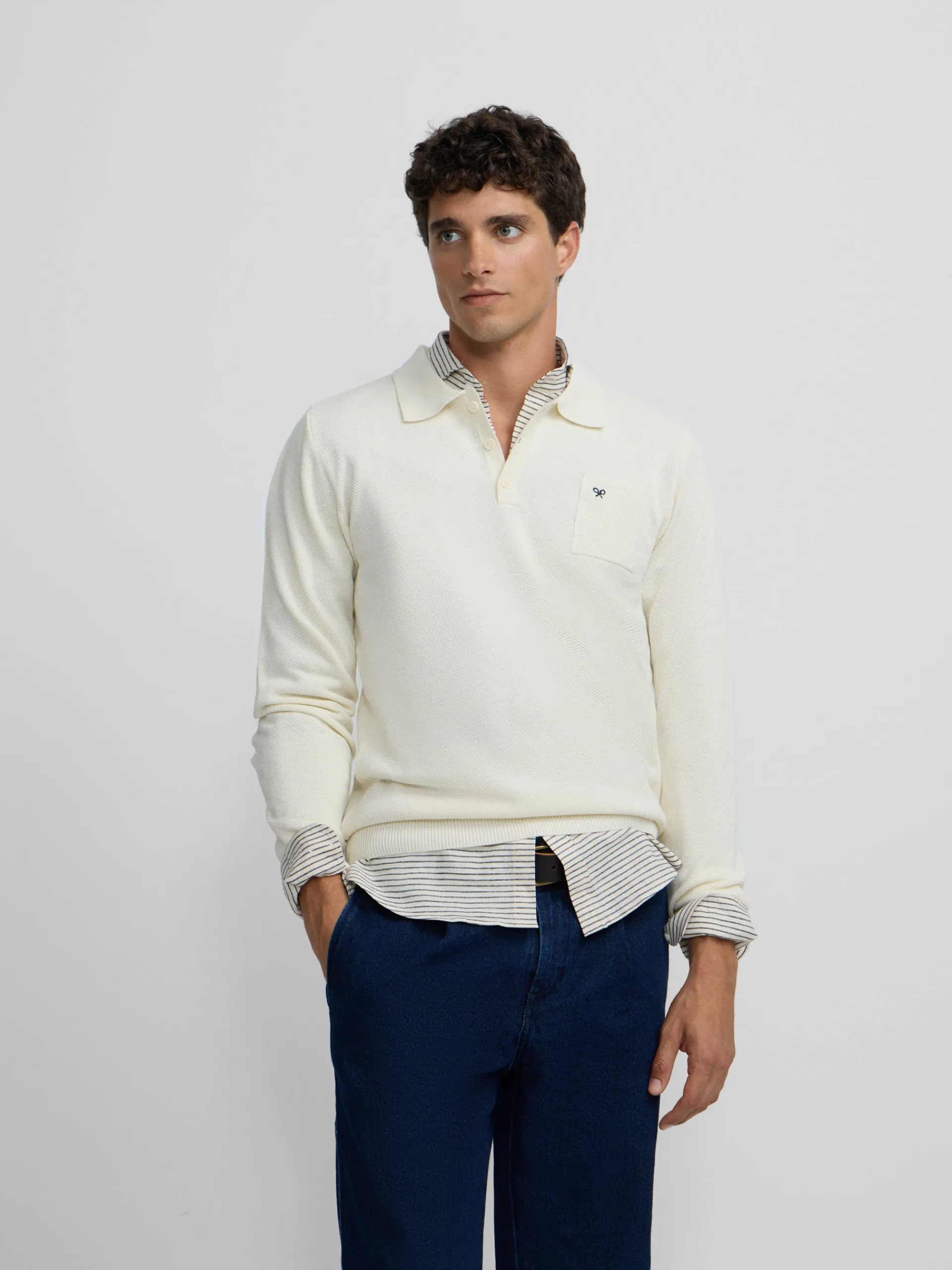 Jersey cuello polo minilogo beige confeccionado en 100% algodón. Presenta cuello clásico con cierre de botones y manga larga con puño elástico. Cuenta con bolsillo en el torso con bordado de raquetas a contraste en azul marino. Fabricado en Portugal.