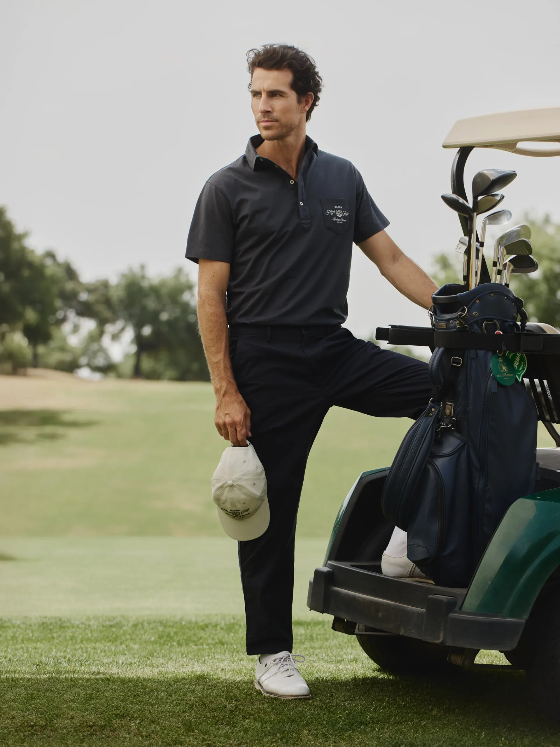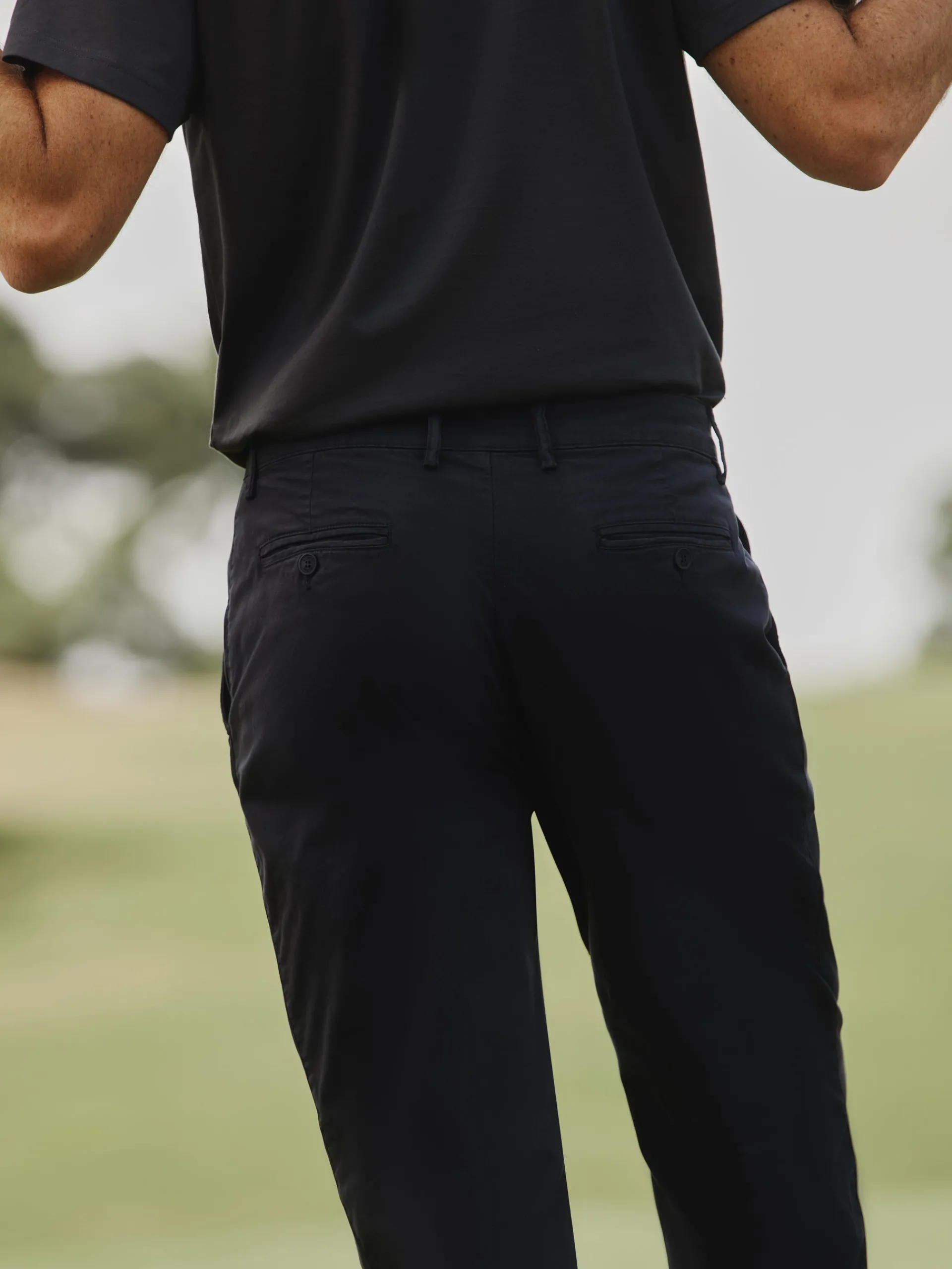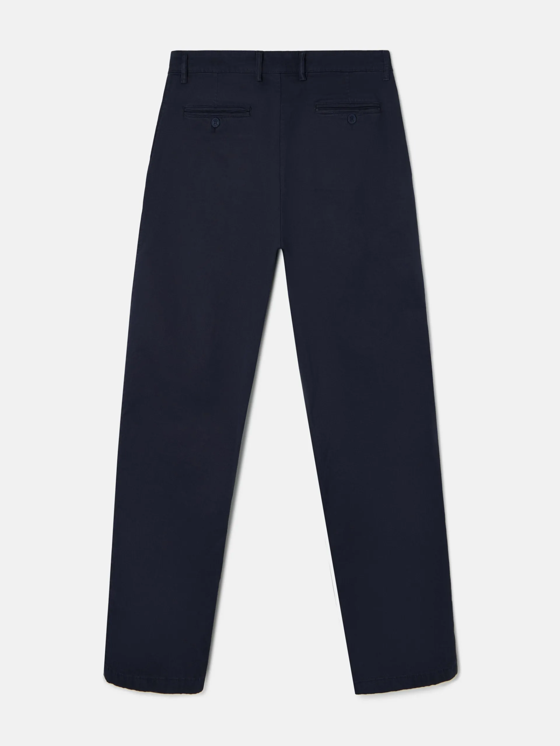 Pantalón Beltrán Lozano azul oscuro confeccionado en mezcla de algodón. Presenta cierre con botón personalizado y cremallera, trabillas en cintura y bolsillos delanteros y traseros. Fabricado en España.