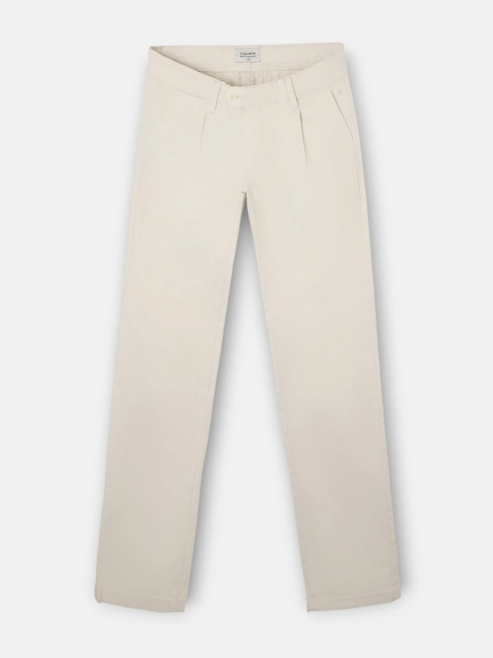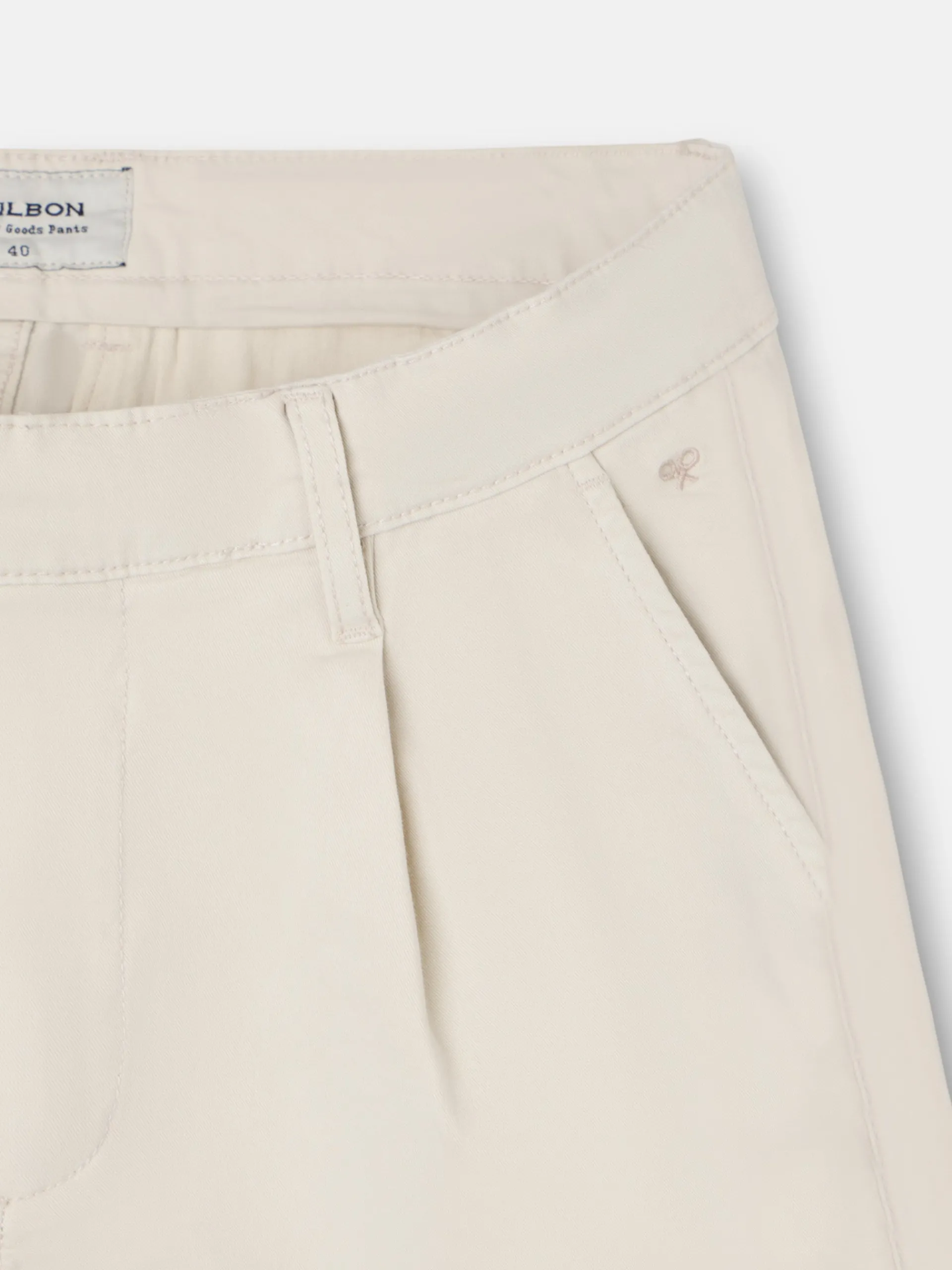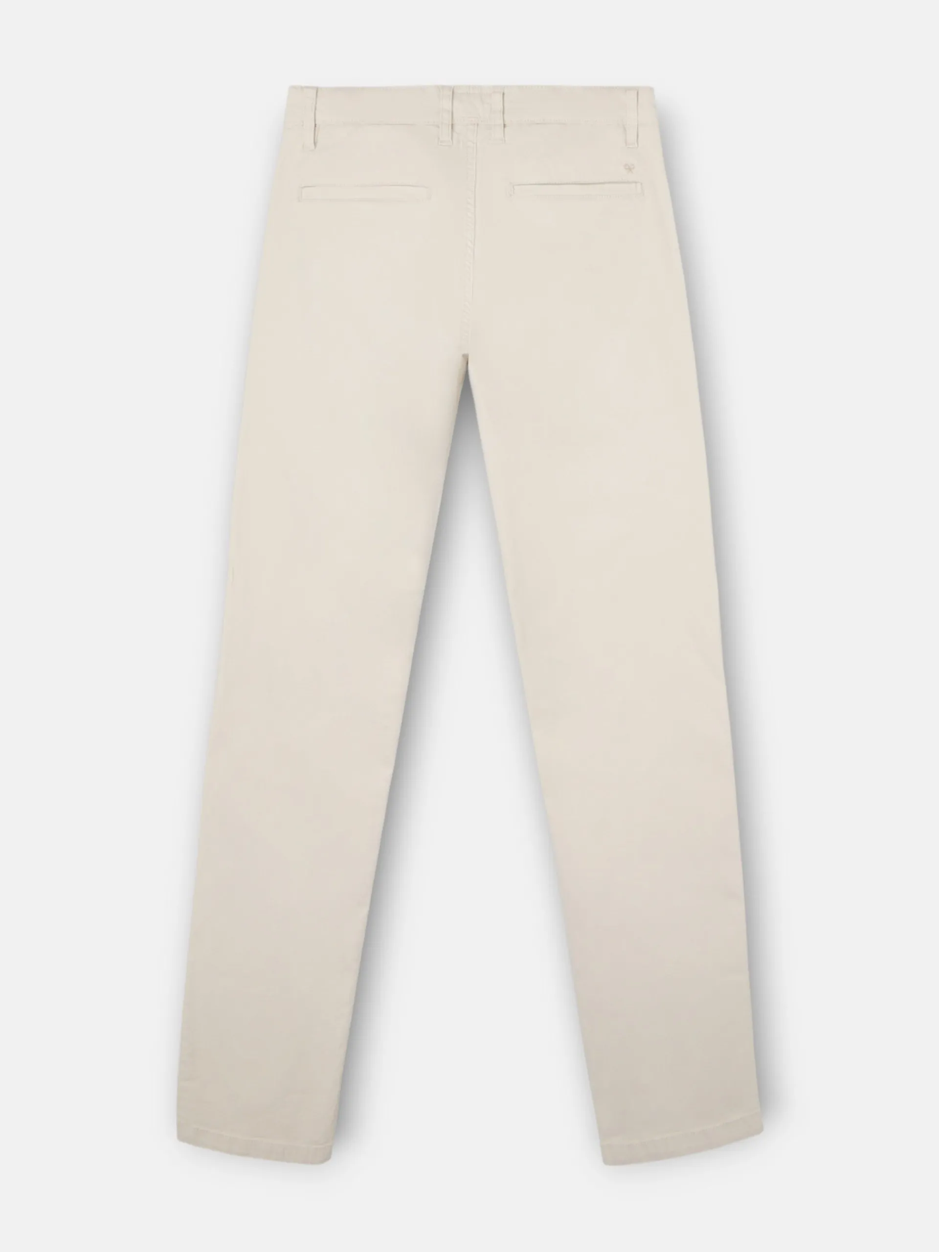 Pantalón chino casual con pinzas, color piedra confeccionado en mezcla de algodón BCI de corte Slim fit. Presenta cierre con botón personalizado y cremallera, trabillas en la cintura y bolsillos delanteros y traseros.