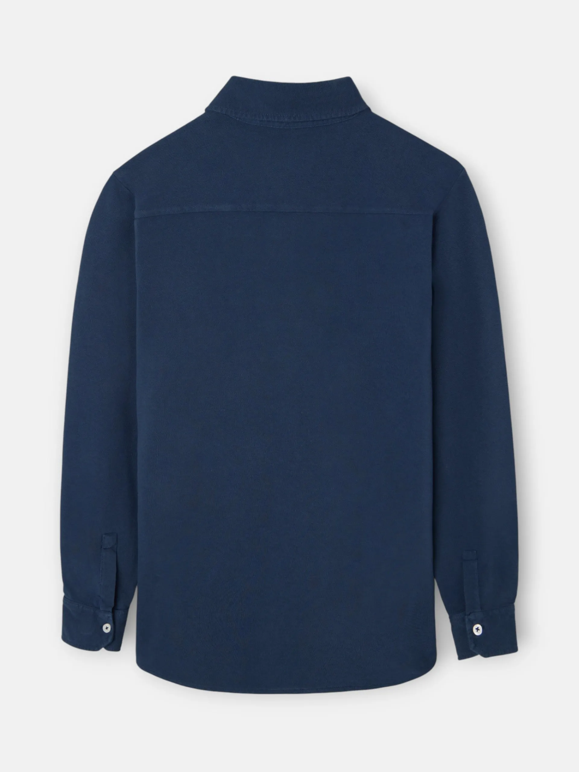 Polo liso manga larga azul marino confeccionado en 100% algodón de corte Regular fit. Presenta cuello clásico con cierre con botones y manga larga. Cuenta con raquetas bordadas a contraste en color burdeos en el torso. Fabricado en Portugal.
