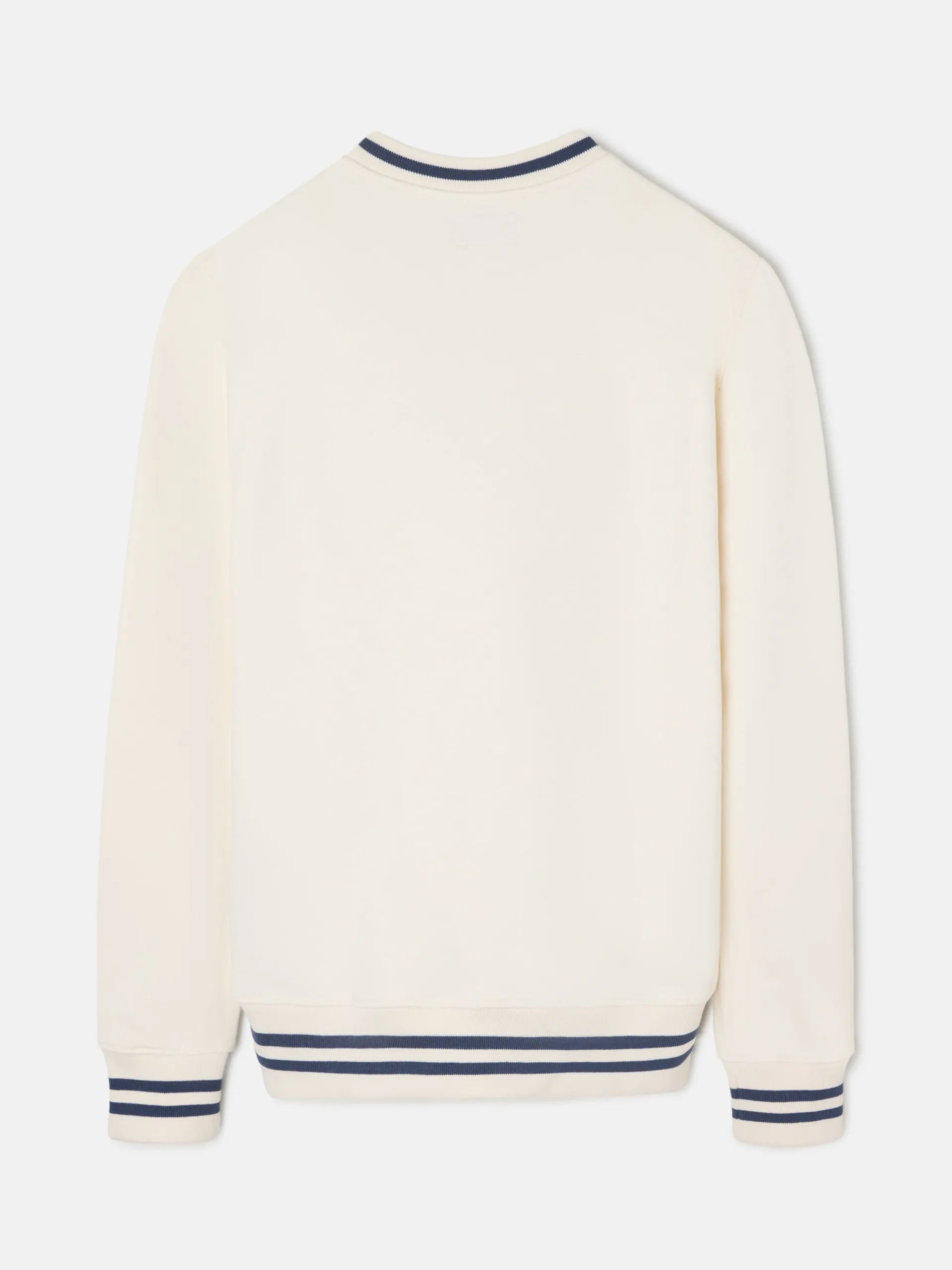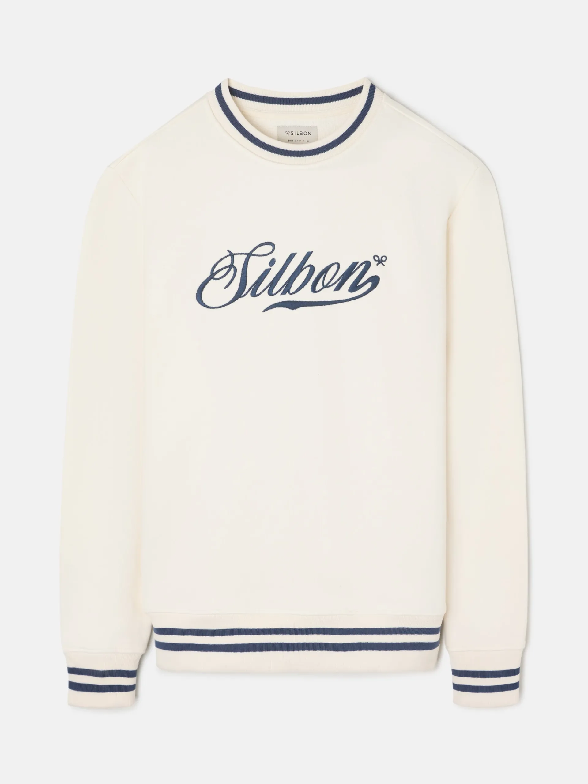 Sudadera retro lettering color crema confeccionada en 100% algodón con corte. Presenta detalle de rayas en el cuello, bajo elástico y puños en azul marino. Cuenta con print de letras Silbon en el torso. Fabricada en Portugal.