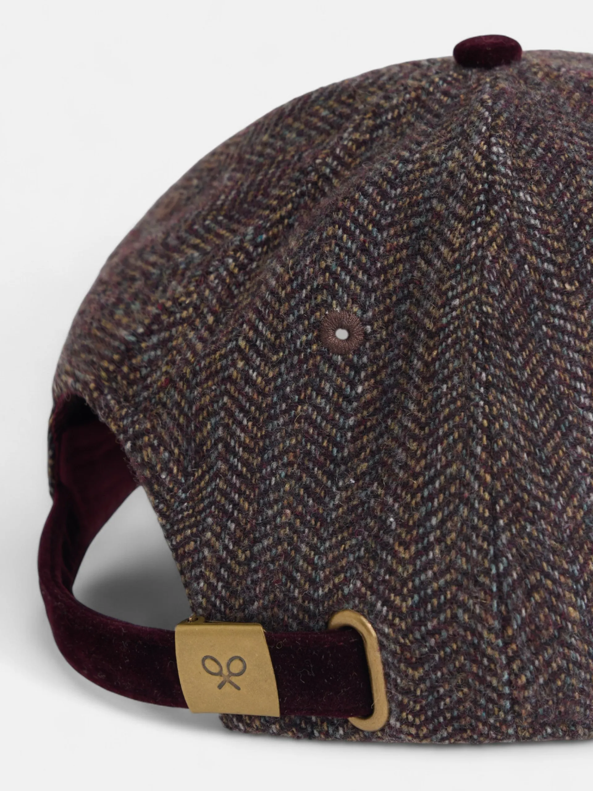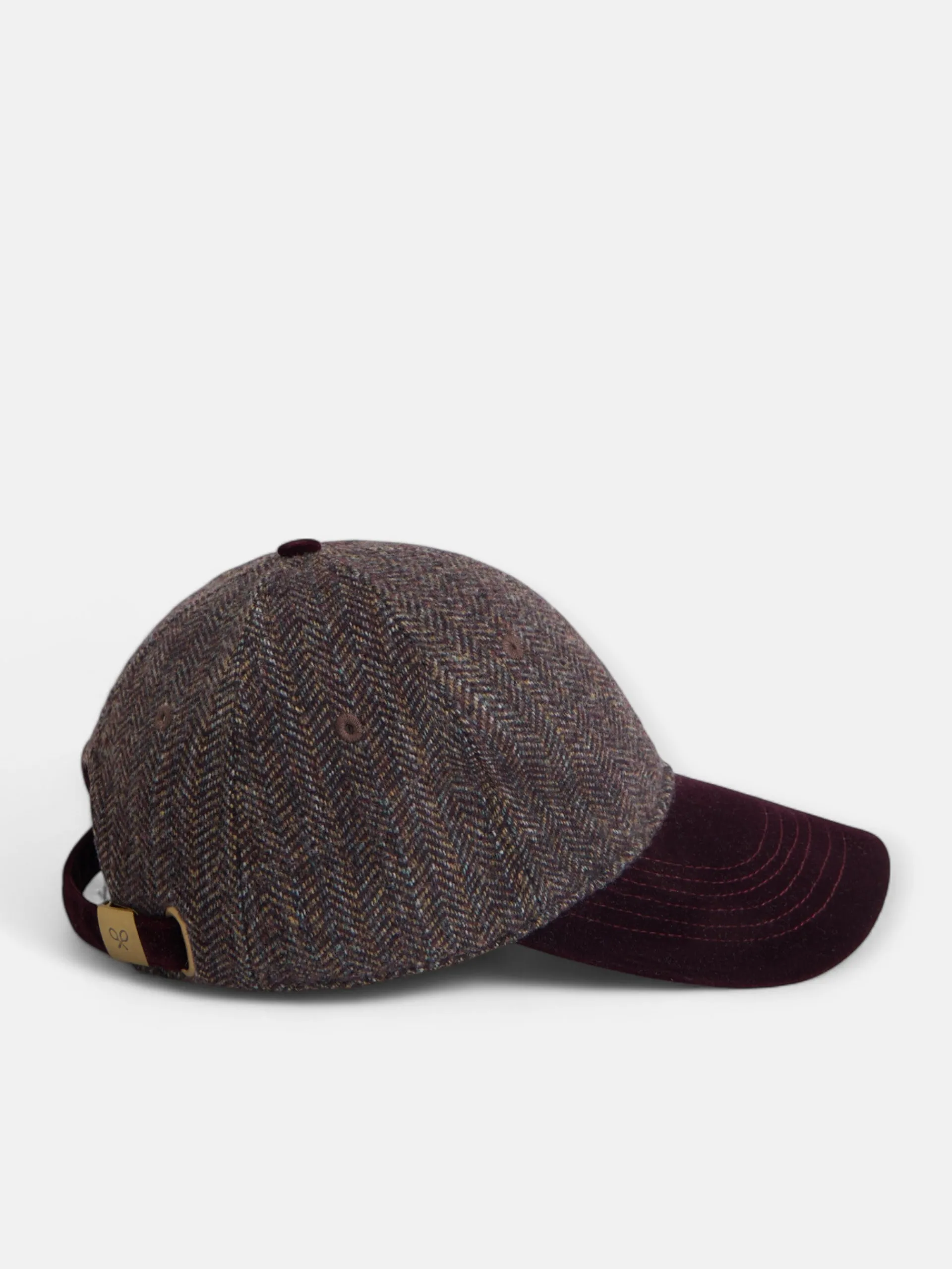 Gorra en tejido de espiga tonos burdeos presenta ajuste posterior mediante hebilla metálica color oro viejo. Presenta visera a contraste en terciopelo burdeos. Cuenta con aplique metálico personalizado en frontal de logo raquetas en dorado.