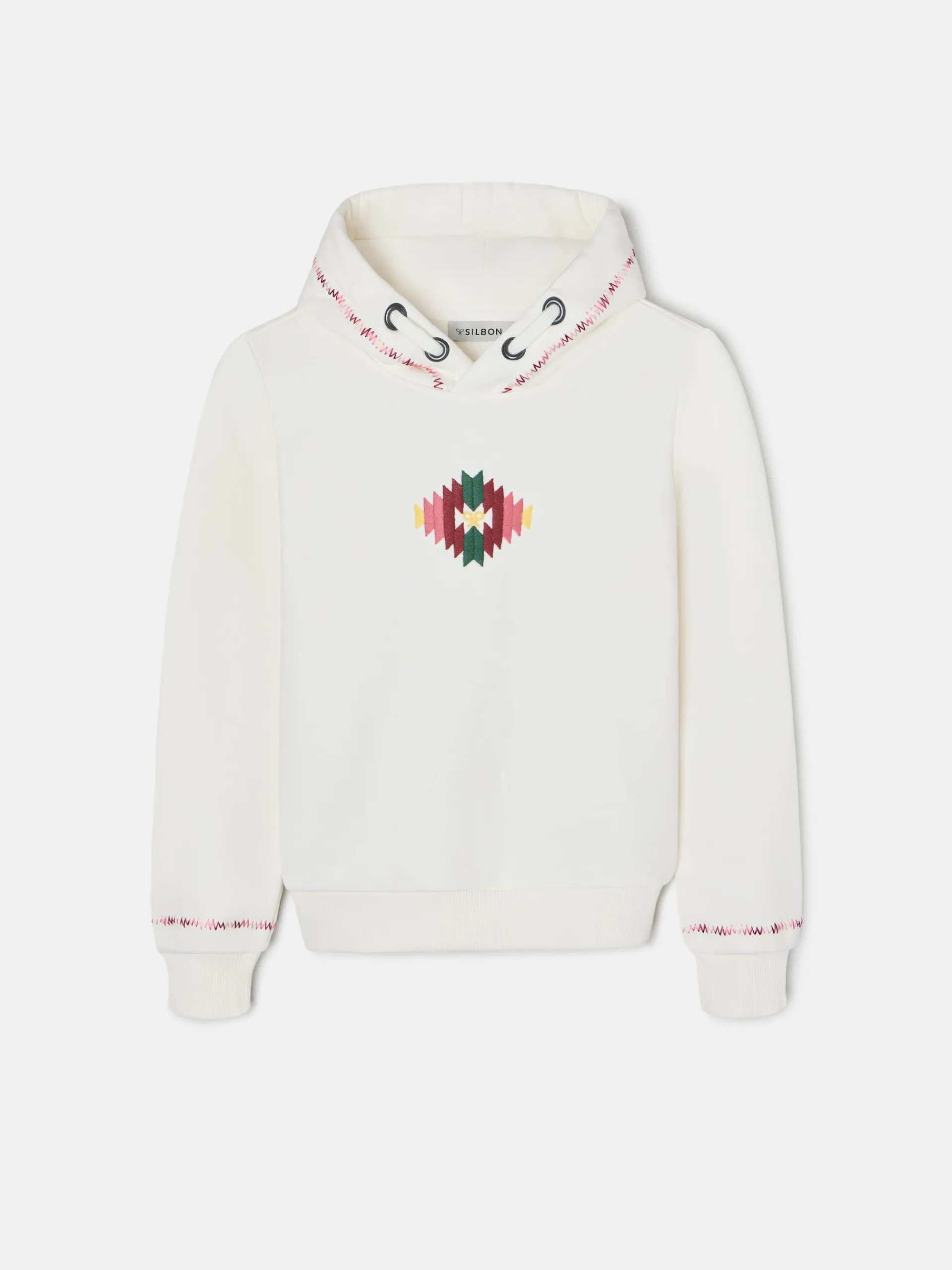 Sudadera girl étnica cruda confeccionada en mezcla de algodón. Presenta bordado étnico con raquetas multicolor en el frontal. Cuenta con capucha y mangas rectas con puño elástico con detalle bordado en el contorno.