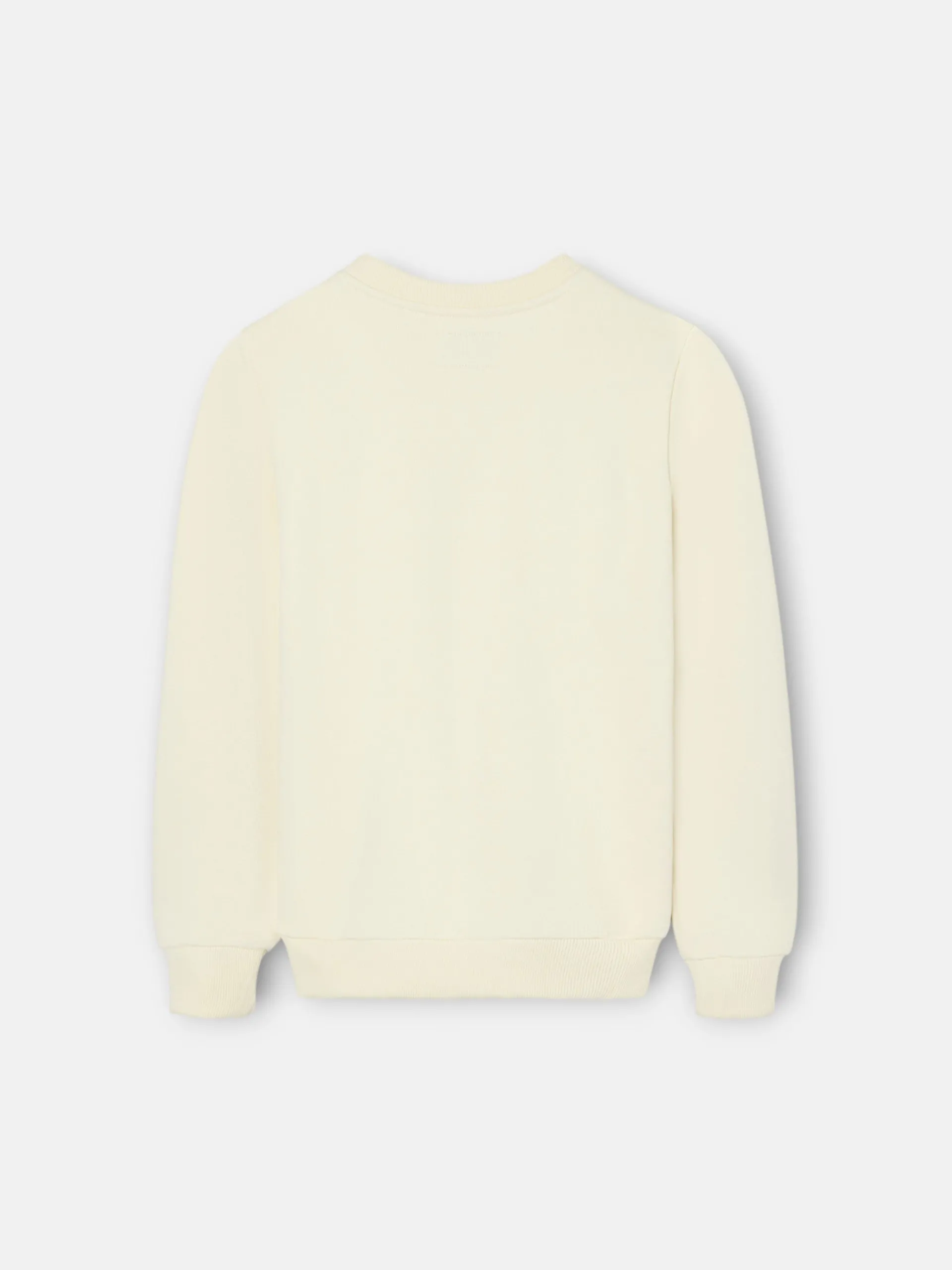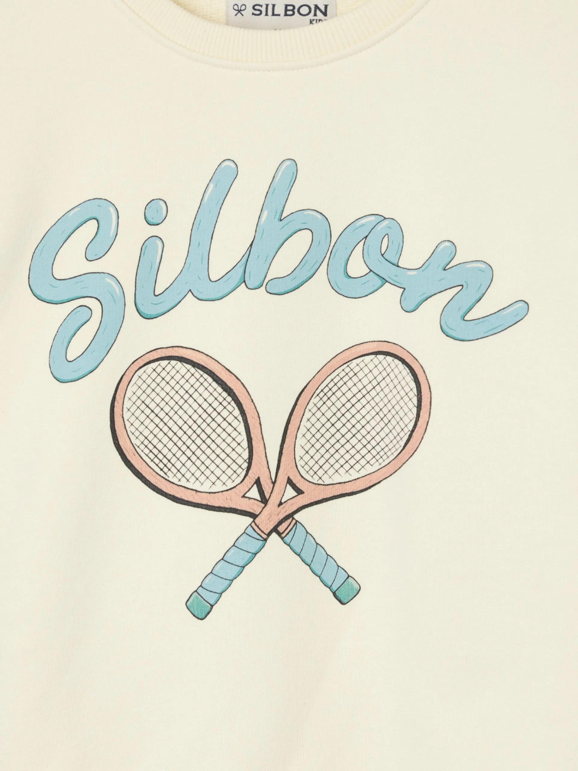 Sudadera kids crema confeccionada en 100% algodón con corte Regular fit. Presenta cuello redondo y manga larga con puño elástico. Cuenta con print de letras Silbon y raquetas en el torso.