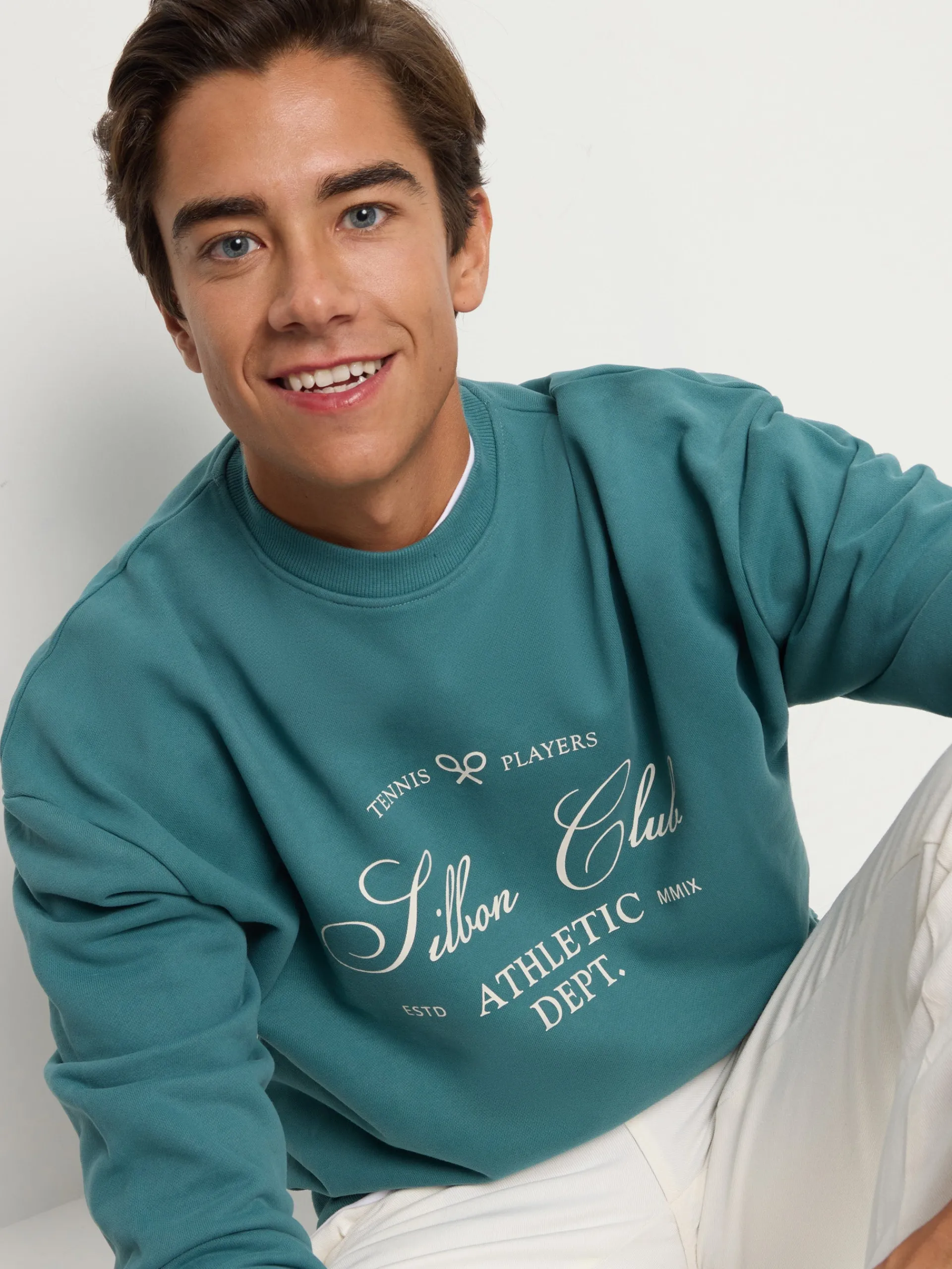 Sudadera Silbon Club color petróleo confeccionada en 100% algodón de corte Oversize. Presenta cuello redondo y manga larga con puño elástico. Cuenta con detalle de letras a contraste en color crema en el torso. Fabricado en Portugal.